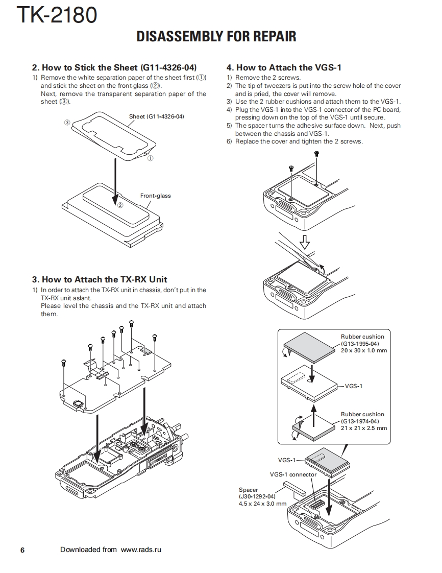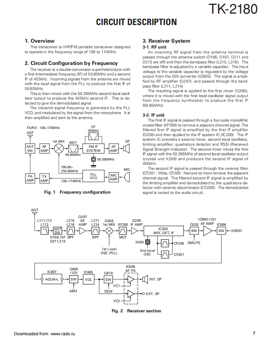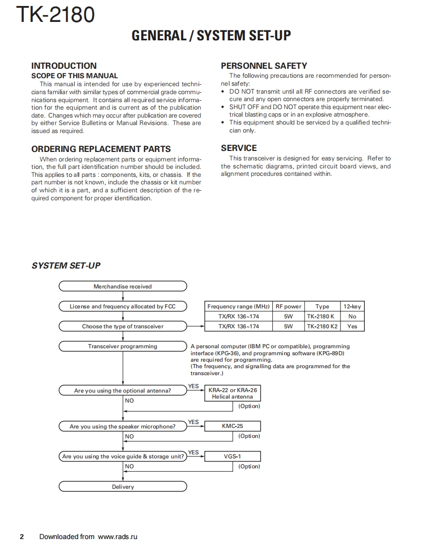 VHF FM TRANSCEIVERTK-2180KENWOODSERVICE MANUAL2004-6 PRINTED IN JAPANB51-8689-00(N)961TK-2180KTK-2180K2Helical antenna(KRA-22 Option)Knob (CH selector)(K29-9305-03)Knob(Volume)(K29-9304-03)CONTENTSButton knob(Side】Front glass(K29-9303-03)(B10-2752-22)GENERAL.2SYSTEM SET-UP.2REALIGNMENT.........3DISASSEMBLY FOR REPAIR......5KENWOODKENWOODCIRCUIT DESCRIPTION.............7SEMICONDUCTOR DATA....................13COMPONENTS DESCRIPTION...............14PARTS LIST16EXPLODED VIEW....25PACKING.26ADJUSTMENT.....27TERMINAL FUNCTION.....39PC BOARDDISPLAY UNIT (X54-3470-XX)............42TX-RX UNIT (X57-6930-10.46SCHEMATIC DIAGRAMDISPLAY UNIT (X54-3470-XX)............500TX-RX UNIT (X57-6930-10.52BLOCK DIAGRAM.....60PackingKnob (PTT)PackingLEVEL DIAGRAM..62(G53-1598-01)(K29-9302-23)(G53.1599-01)OPTIONAL ACCESSORIESCabinet assyCabinet assyKNB-31A/32N/33L.63(A02.3847-03)(A02.3848-03)KSC-32…..63SPECIFICATIONS.........BACK COVERDoes not come with antenna.Antenna is available as an option.Downloaded from www.rads.ru