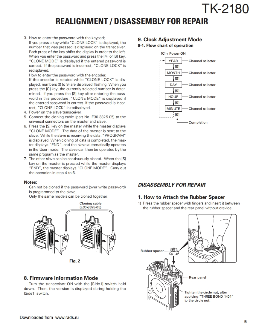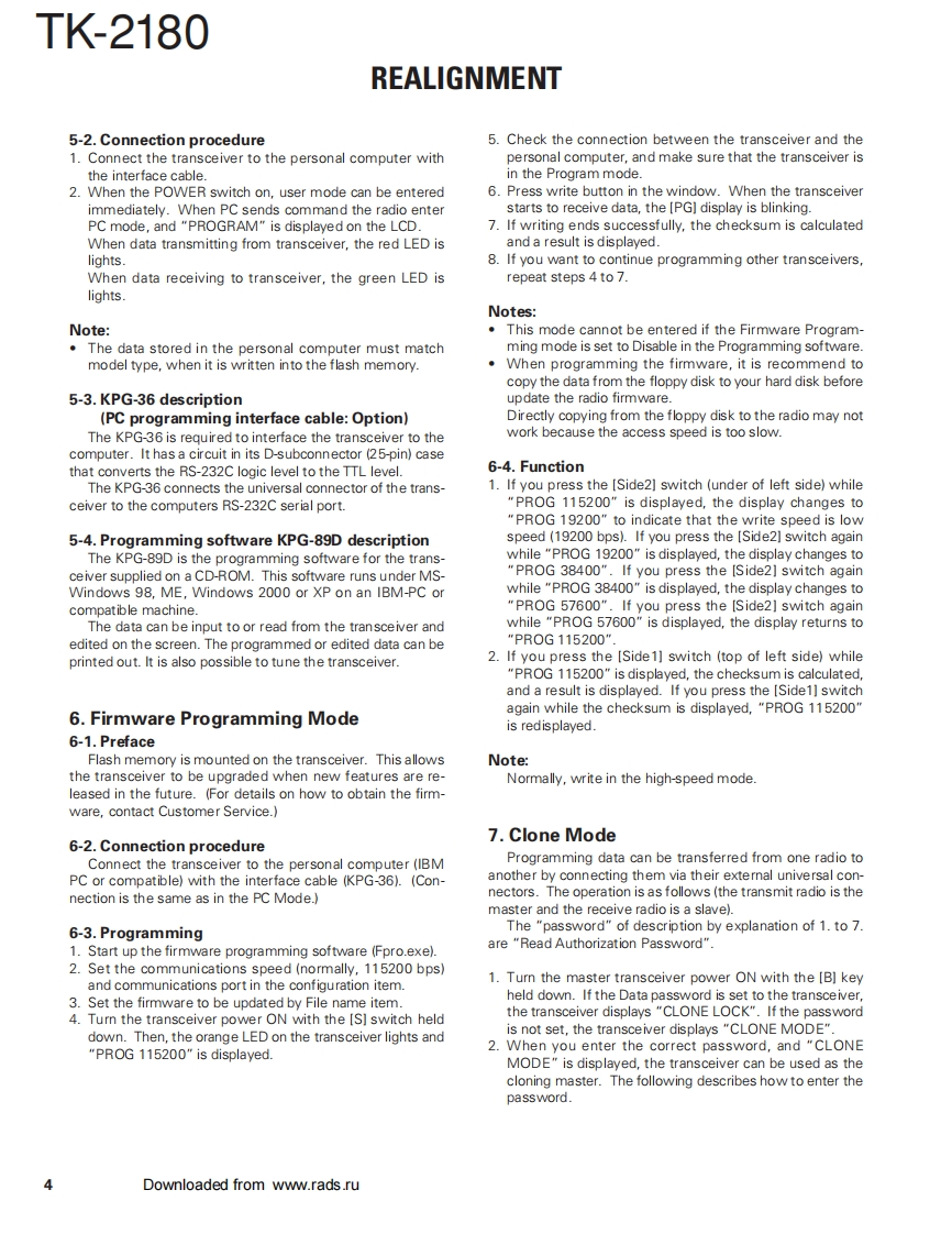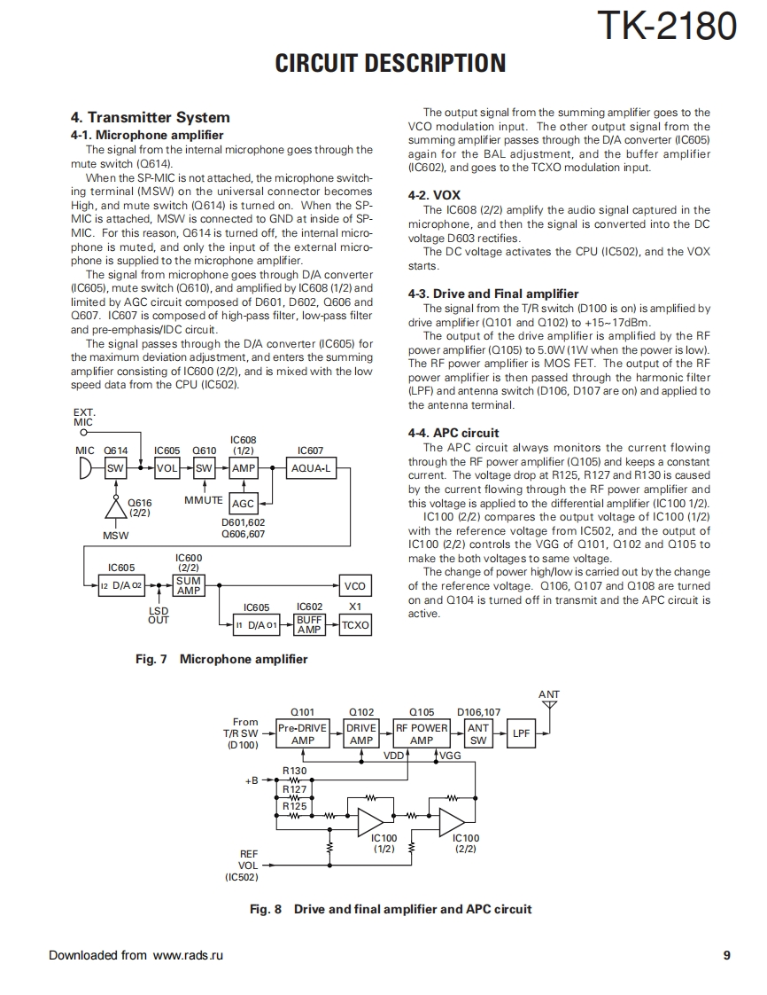 VHF FM TRANSCEIVERTK-2180KENWOODSERVICE MANUAL2004-6 PRINTED IN JAPANB51-8689-00(N)961TK-2180KTK-2180K2Helical antenna(KRA-22 Option)Knob (CH selector)(K29-9305-03)Knob(Volume)(K29-9304-03)CONTENTSButton knob(Side】Front glass(K29-9303-03)(B10-2752-22)GENERAL.2SYSTEM SET-UP.2REALIGNMENT.........3DISASSEMBLY FOR REPAIR......5KENWOODKENWOODCIRCUIT DESCRIPTION.............7SEMICONDUCTOR DATA....................13COMPONENTS DESCRIPTION...............14PARTS LIST16EXPLODED VIEW....25PACKING.26ADJUSTMENT.....27TERMINAL FUNCTION.....39PC BOARDDISPLAY UNIT (X54-3470-XX)............42TX-RX UNIT (X57-6930-10.46SCHEMATIC DIAGRAMDISPLAY UNIT (X54-3470-XX)............500TX-RX UNIT (X57-6930-10.52BLOCK DIAGRAM.....60PackingKnob (PTT)PackingLEVEL DIAGRAM..62(G53-1598-01)(K29-9302-23)(G53.1599-01)OPTIONAL ACCESSORIESCabinet assyCabinet assyKNB-31A/32N/33L.63(A02.3847-03)(A02.3848-03)KSC-32…..63SPECIFICATIONS.........BACK COVERDoes not come with antenna.Antenna is available as an option.Downloaded from www.rads.ru