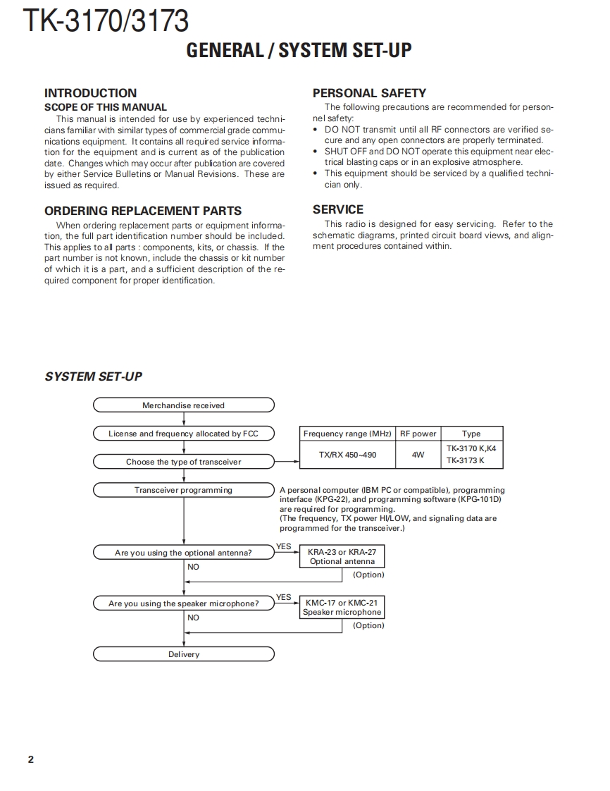 UHF FM TRANSCEIVERTK-3170/3173KENWOODKenwood CorporationSERVICE MANUAL2005-3 PRINTED IN JAPANB51-8721-00(N)1202TK-3170K4TK-3170K/TK-3173KKnob (Selector)(K29-9340-03)Knob (Volume)(K29-9278-13)Badge(B43.1178-04)KENWOODKENWOOD秘0的这回旧九◇国移中b数回旧儿◇间Knob (PTT)Packing(K29-9339-03)(G53.1651-01)Key top (Side)(K29-9341-03)Plastic cabinet assyPlastic cabinet assy(A02.3891-13)(A023890-03)Packing(G53-1652-11)Does not come with antenna.Antenna is available as an option.CONTENTSGENERAL.2ADJUSTMENT.…41SYSTEM SET-UP2TERMINAL FUNCTION............49REALIGNMENT…PC BOARDDISASSEMBLY FOR REPAIR..............21TX-RX UNIT (X57-7010-XX)(A/4).........50CIRCUIT DESCRIPTION.…23TX-RX UNIT(X57-7010-XX0(B,C,D/4)..52SEMICONDUCTOR DATA.................28SCHEMATIC DIAGRAM..........................56COMPONENTS DESCRIPTION ............29BLOCK DIAGRAM…64PARTS LIST.31LEVEL DIAGRAM........66EXPLODED VIEW.........39KSC-30 (RAPID CHARGER)...............67PACKING.…40SPECIFICATIONS.......BACK COVERDownloaded from ww.rads.ruThis product uses Lead Free solder.