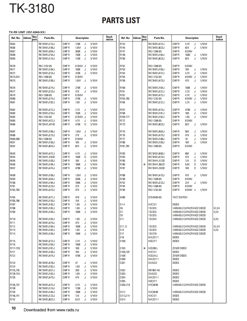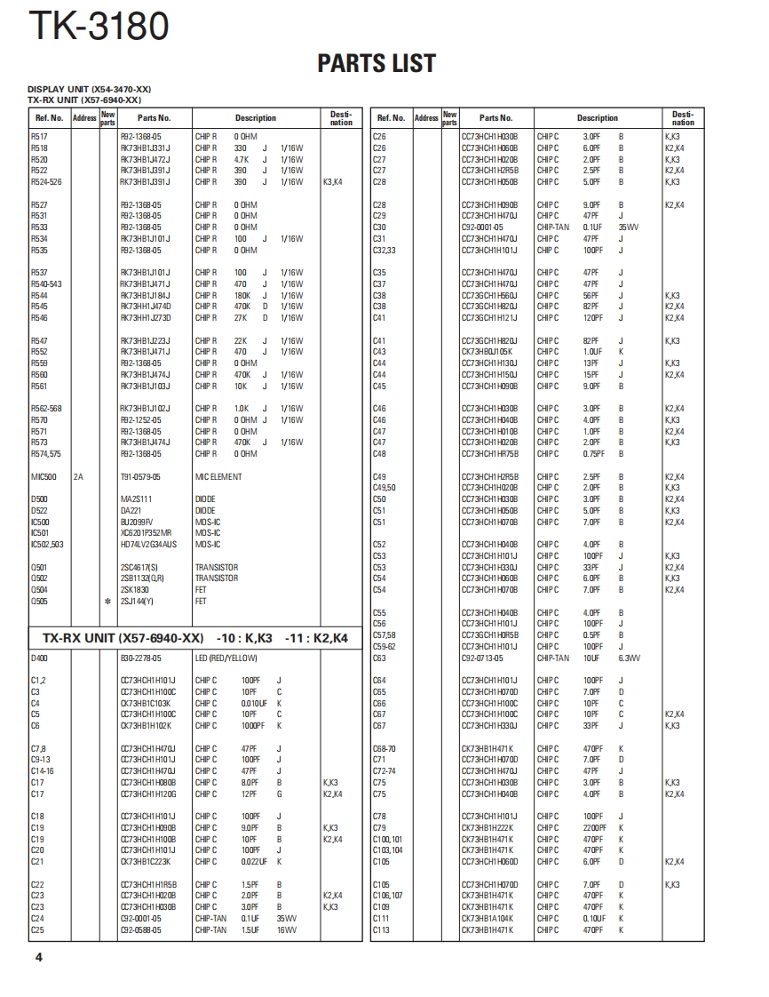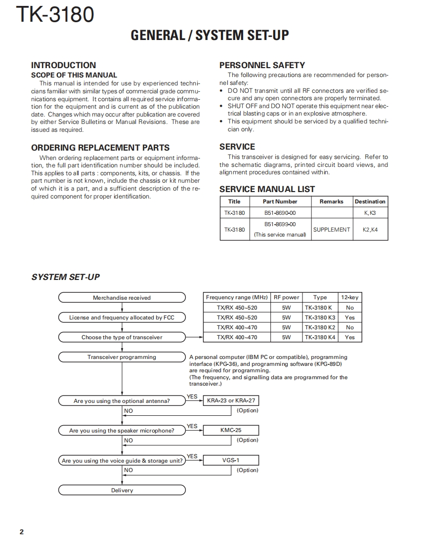 UHF FM TRANSCEIVERTK-3180KENWOODSERVICE MANUALSUPPLEMENT2004-8 PRINTED IN JAPANB51-8699-00(N)1048TK-3180K,K2TK-3180K3,K4Helical antenna(KRA-23:Option】Knob(CH selector)K29-9305-03)Knob(Volume)(K29-9304-03)Button knob(Side)Front glass(K29-9303-03)(B10-2752-22)KENWOODKENWOODCONTENTS6GENERAL..2SYSTEM SET-UP.PARTS LIST...........3EXPLODED VIEW...........12PACKING3ADJUSTMENT.4PC BOARDDISPLAY UNIT (X54-3470-XX)............26TX-RX UNIT (X57-6940-XX)................30SCHEMATIC DIAGRAMPackingDISPLAY UNIT (X54-3470-XX)............34Knob (PTT)Packing(G53.-1598-01)(K29-9302-23)(G53.1599-01)TX-RX UNIT (X57-6940-XX)...............36Cabinet assyCabinet assyBLOCK DIAGRAM.44(A02-.3847-03(A02.3848-03)LEVEL DIAGRAM...46SPECIFICATIONS........47Does not come with antenna.Antenna is available as an option.Downloaded from www.rads.ru