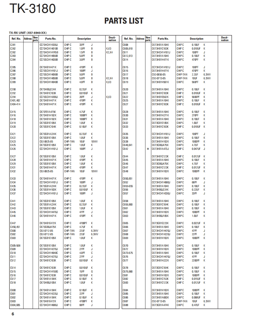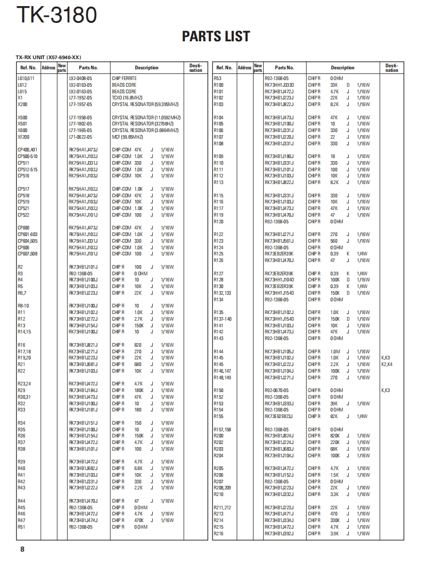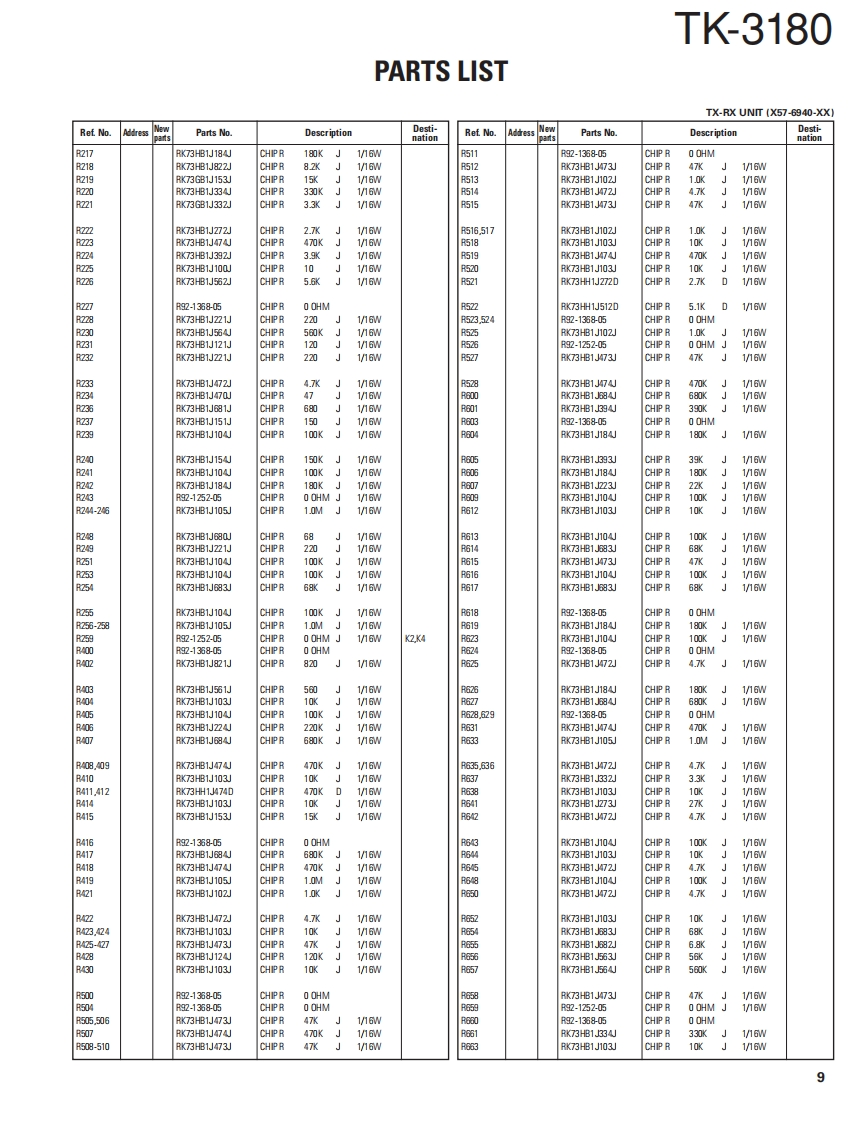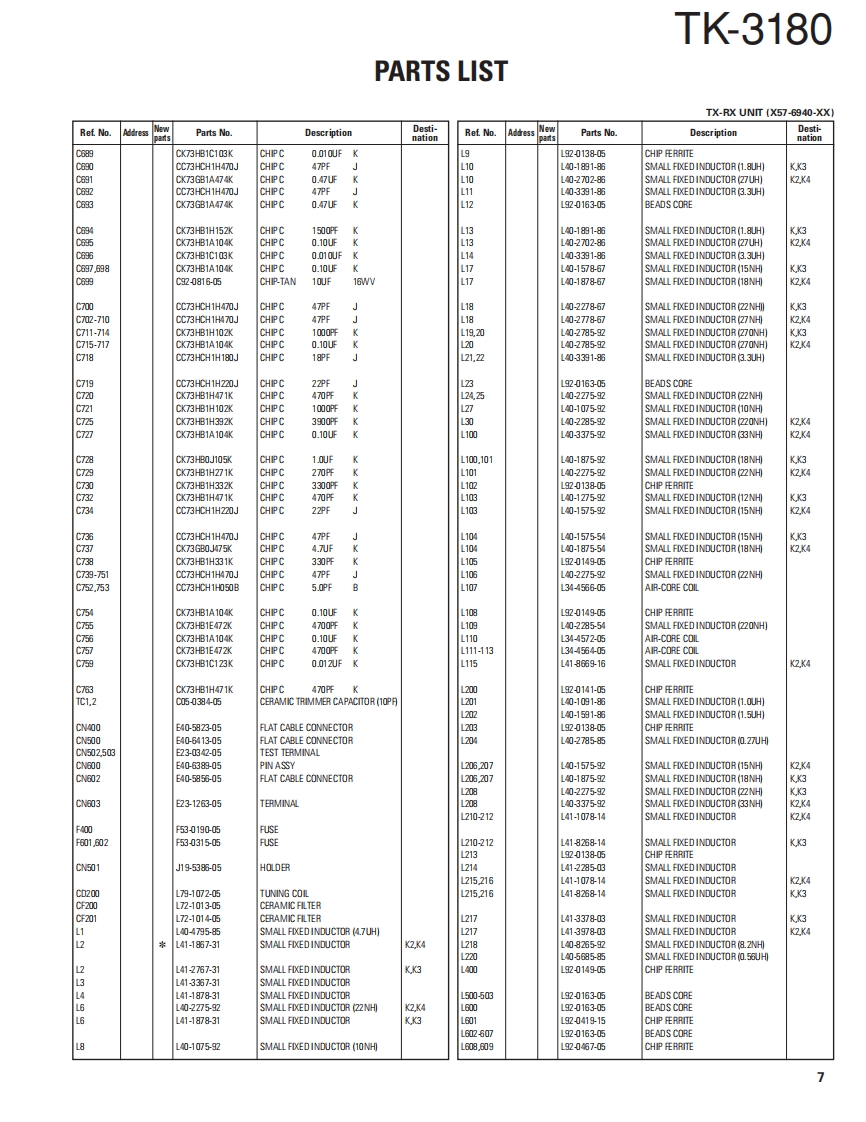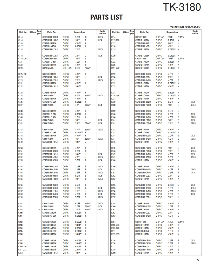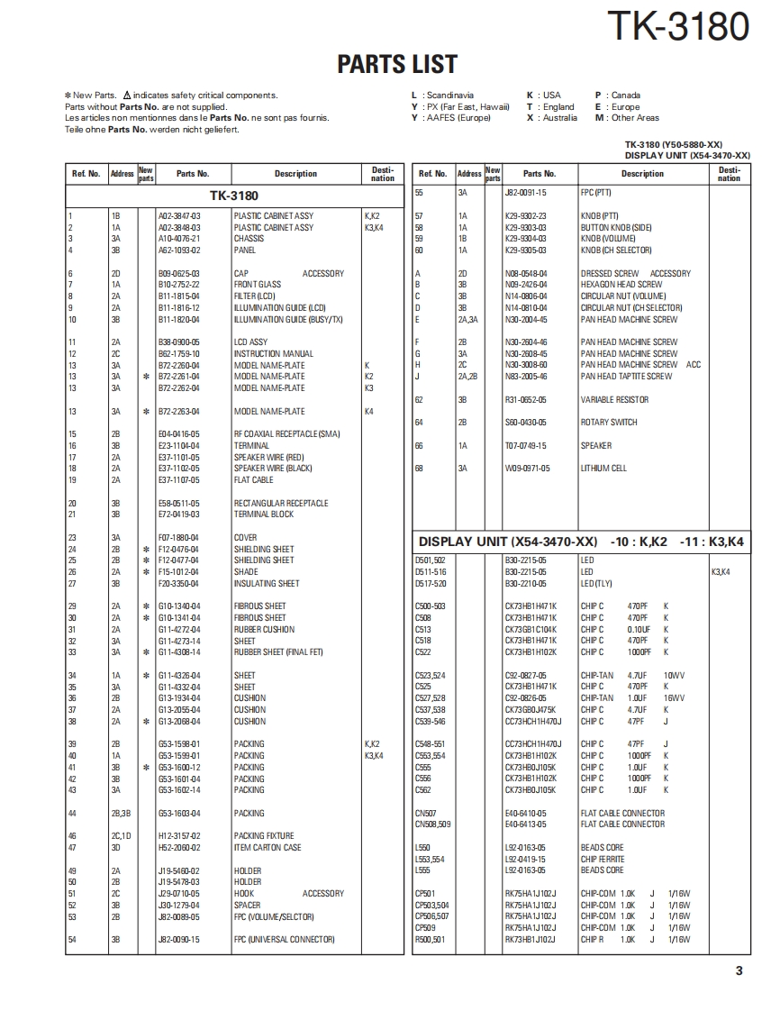 UHF FM TRANSCEIVERTK-3180KENWOODSERVICE MANUALSUPPLEMENT2004-8 PRINTED IN JAPANB51-8699-00(N)1048TK-3180K,K2TK-3180K3,K4Helical antenna(KRA-23:Option】Knob(CH selector)K29-9305-03)Knob(Volume)(K29-9304-03)Button knob(Side)Front glass(K29-9303-03)(B10-2752-22)KENWOODKENWOODCONTENTS6GENERAL..2SYSTEM SET-UP.PARTS LIST...........3EXPLODED VIEW...........12PACKING3ADJUSTMENT.4PC BOARDDISPLAY UNIT (X54-3470-XX)............26TX-RX UNIT (X57-6940-XX)................30SCHEMATIC DIAGRAMPackingDISPLAY UNIT (X54-3470-XX)............34Knob (PTT)Packing(G53.-1598-01)(K29-9302-23)(G53.1599-01)TX-RX UNIT (X57-6940-XX)...............36Cabinet assyCabinet assyBLOCK DIAGRAM.44(A02-.3847-03(A02.3848-03)LEVEL DIAGRAM...46SPECIFICATIONS........47Does not come with antenna.Antenna is available as an option.Downloaded from www.rads.ru
