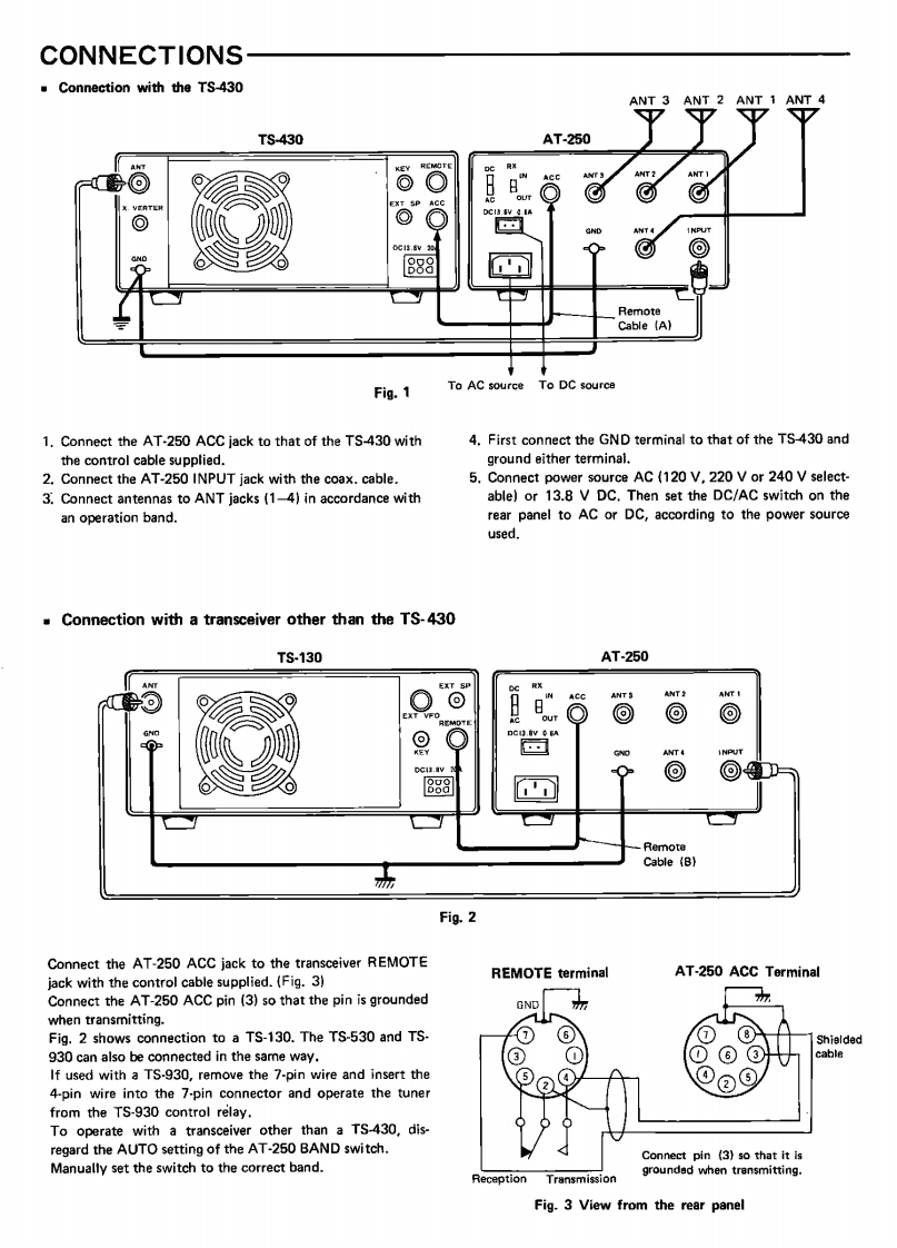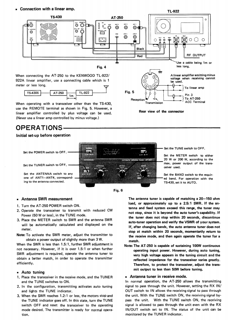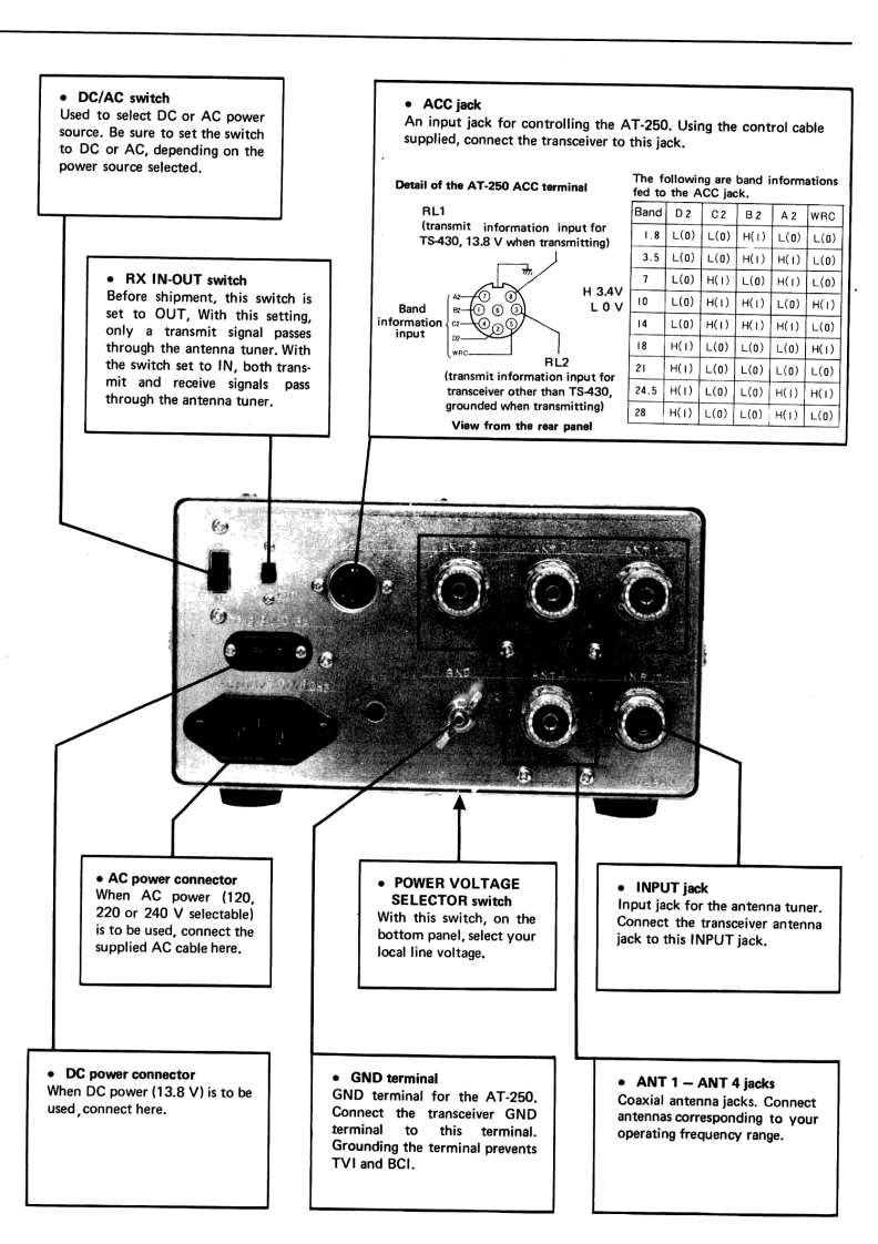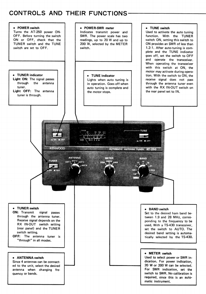 AT-250AUTOMATIC ANTENNA TUNERENNA TUNER AT-250CAUTION1)The AT-250 is capable of sustaining 100W con-You are the owner of our latest product,the new AT-250 Automatictinuous operating input power.However,duringAntenna Tuner.Please read this instruction manual carefully beforeauto tuning,very high voltage appears in theplacing your unit in service.The unit has been carefully engineeredtuning circuit and the reflected impedance forand manufactured to rigid quality standards,and should give youthe transceiver varies greatly.Therefore,to pro-satisfactory and dependable operation for many years.tect the transceiver,adjust the transmit outputto less than 50W before tuning.2)The antenna tuner is capable of matching a 20-150 ohm load,or approximately up to 2.5:1SWR.If the antenna and feed system exceed thisrange,the tuner may not stop,since it is beyondthe auto tuner's capability.In this case,do notattempt further auto-tuner operation.To perform auto-tuner operation,first adjust theantenna and feed system.FEATURES1.All amateur bands covered in the HF range4.POWER-SWR meterCovers all amateur bands including the new WARC bandUp to either 20 W or 200 W is indicated by the built-infrom 1.8 through 28 MHz.POWER-SWR meter.When the METER switch is set to2.Automatic band selectionSWR,SWR is autoamtically calculated and indicated onWhen connected to the TS-430,the operating band isthe scale.automatically selected from the transceiver.5.Four antenna jacks3.Dual power source capabilityFour antennas cover a broad frequency range.Any ofOperation from either 120,220,or 240 V AC or 13.8Vthese antennas can be selected by the ANTENNA switchDC.on the front panel.In normal operation (with the RX switch OUT),only thetransmission signal will pass through the antenna tuner.