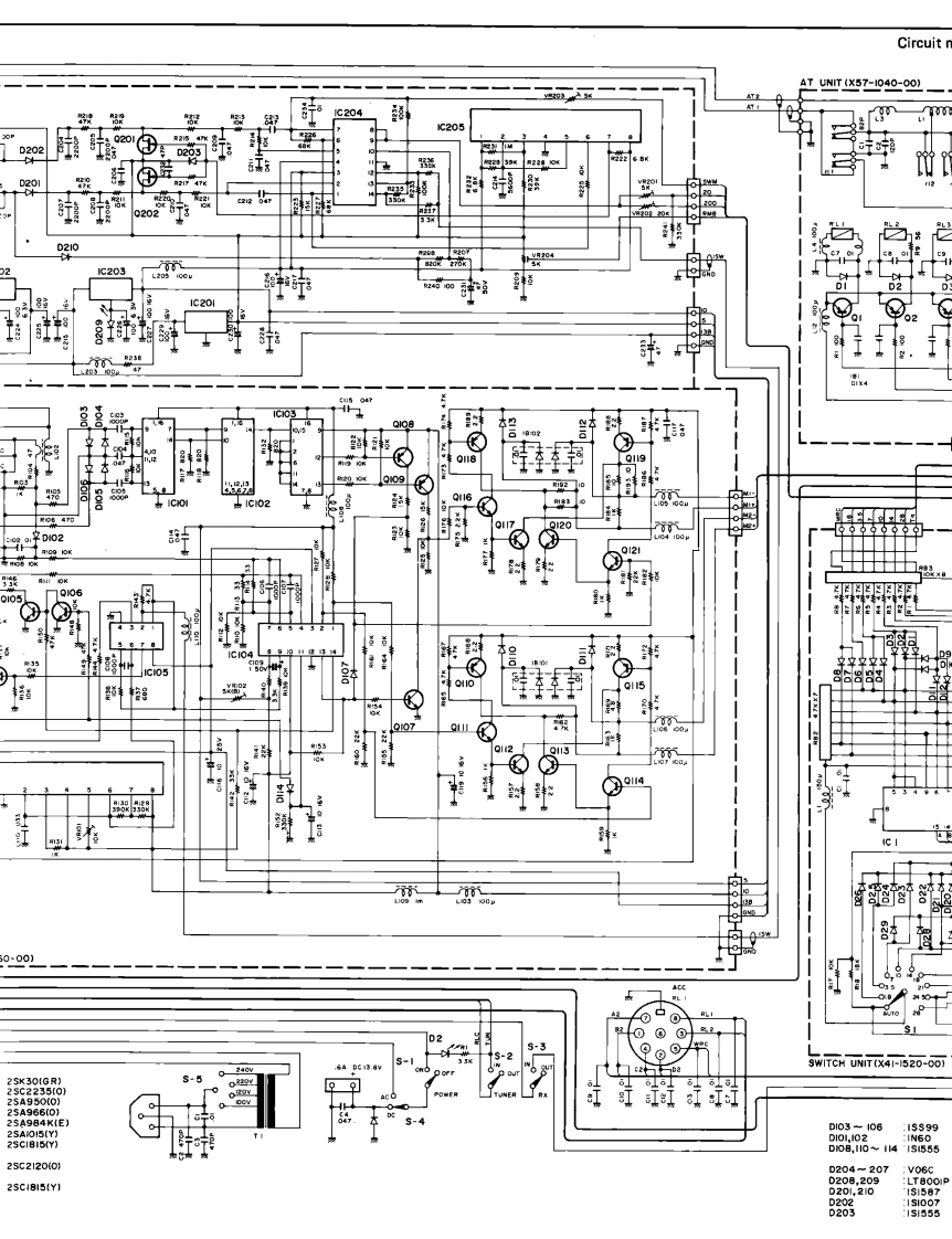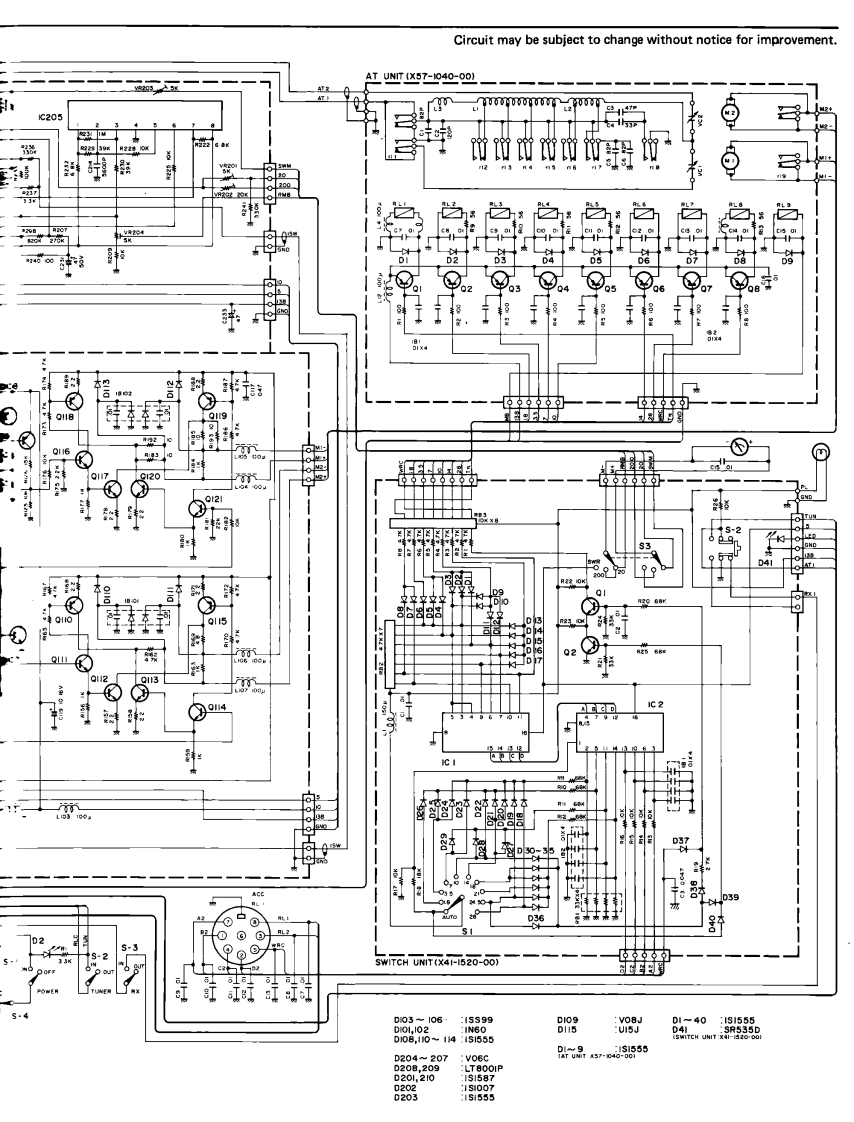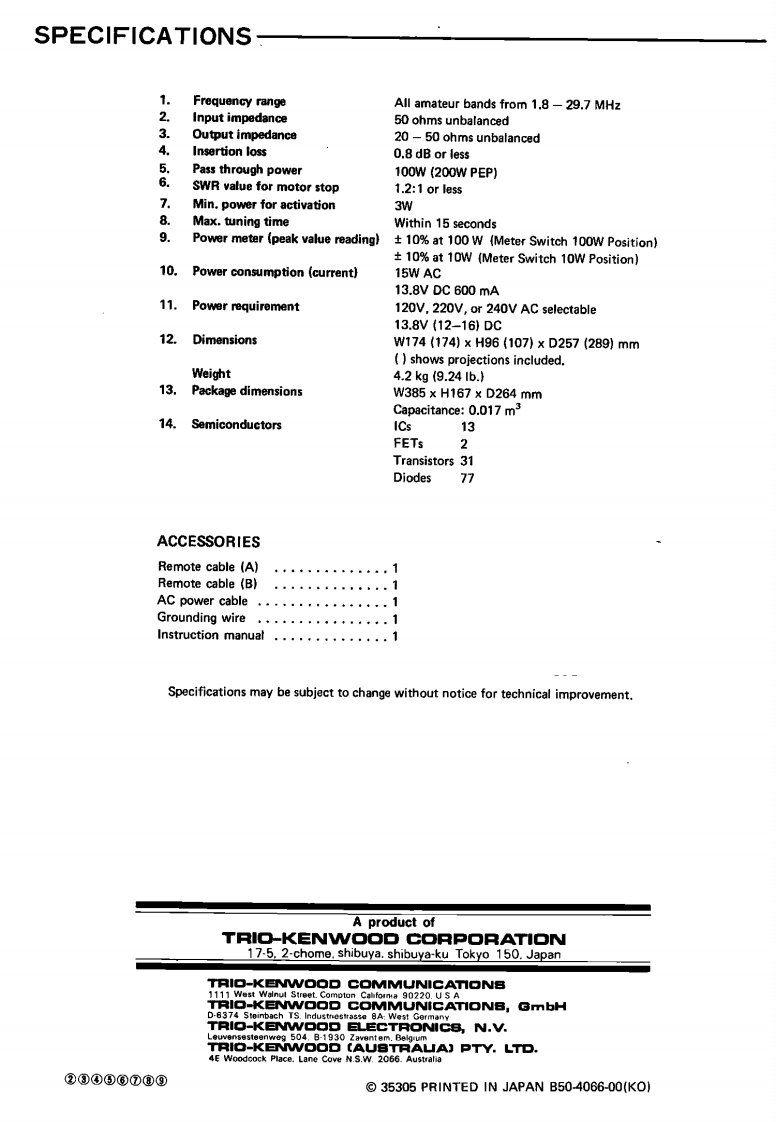 AT-250AUTOMATIC ANTENNA TUNERENNA TUNER AT-250CAUTION1)The AT-250 is capable of sustaining 100W con-You are the owner of our latest product,the new AT-250 Automatictinuous operating input power.However,duringAntenna Tuner.Please read this instruction manual carefully beforeauto tuning,very high voltage appears in theplacing your unit in service.The unit has been carefully engineeredtuning circuit and the reflected impedance forand manufactured to rigid quality standards,and should give youthe transceiver varies greatly.Therefore,to pro-satisfactory and dependable operation for many years.tect the transceiver,adjust the transmit outputto less than 50W before tuning.2)The antenna tuner is capable of matching a 20-150 ohm load,or approximately up to 2.5:1SWR.If the antenna and feed system exceed thisrange,the tuner may not stop,since it is beyondthe auto tuner's capability.In this case,do notattempt further auto-tuner operation.To perform auto-tuner operation,first adjust theantenna and feed system.FEATURES1.All amateur bands covered in the HF range4.POWER-SWR meterCovers all amateur bands including the new WARC bandUp to either 20 W or 200 W is indicated by the built-infrom 1.8 through 28 MHz.POWER-SWR meter.When the METER switch is set to2.Automatic band selectionSWR,SWR is autoamtically calculated and indicated onWhen connected to the TS-430,the operating band isthe scale.automatically selected from the transceiver.5.Four antenna jacks3.Dual power source capabilityFour antennas cover a broad frequency range.Any ofOperation from either 120,220,or 240 V AC or 13.8Vthese antennas can be selected by the ANTENNA switchDC.on the front panel.In normal operation (with the RX switch OUT),only thetransmission signal will pass through the antenna tuner.