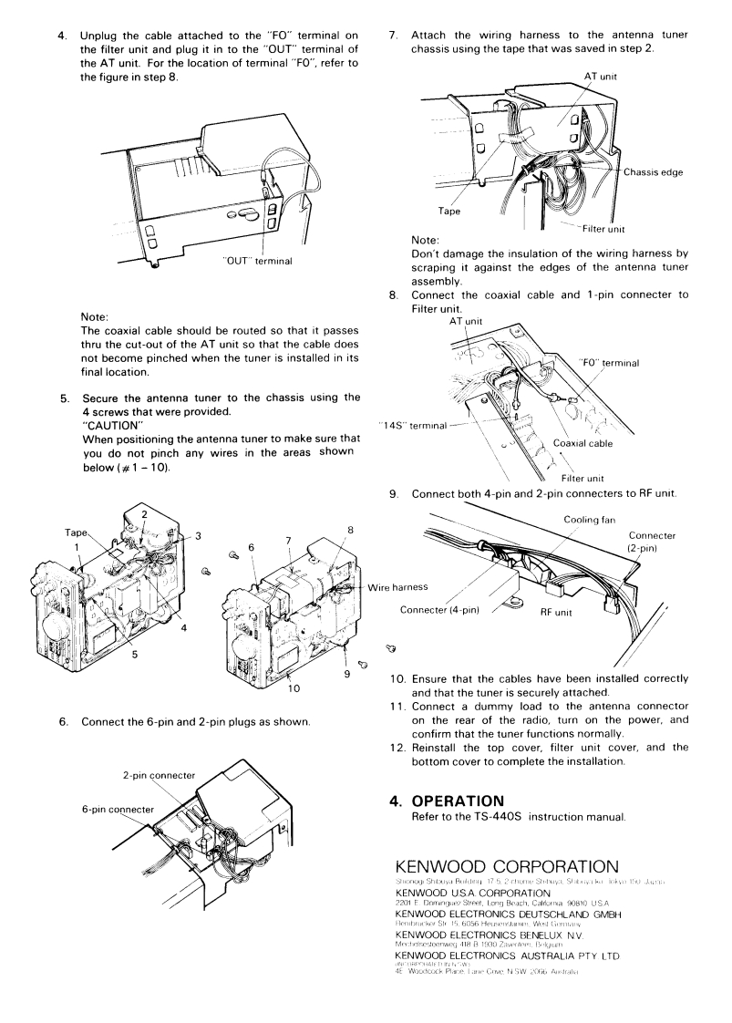 AUTOMATIC ANTENNA TUNER UNITAT-440KENWOODKENWOOD CORPORATIONINSTRUCTION MANUALC PRINTED IN JAPAN B50-8054-30(K.M)(G)8121110987654321Thank you for purchasing the Automatic Antenna Tuner unit AT-440.This unit has been designed for installation in the HFtransceiver TS-440S1.SPECIFICATIONSFrequency range3.5 to 29.7 MHz (All amateurOperating temperature:-10'C to+50'C(14'F tobands)122"F)Input impedance50 ohms,unbalancedDimensions:Wide74×High96×DeepOutput impedance20 to 150 ohms (at SWR less215(mm)than 2.5)Weight:1.2kgInsertion lossLess than 1 dBMaximum input2.ACCESSORIESpower100 wattsThe following accessories are included.SWR for motor stopLess than 1.3Tapping screw..........N87-3006-46........4 pcs.Minimum power forInstruction manual.....B50-8054-30.........copyactivationLess than 3 wattsWarranty cardCurrent consumption:13.8 VDC approx.200 mAU.s.A.only)….B46-0411-00.1copy10 VDC approx.80 mA5 VDC approx.80 mA3.INSTALLATIONRefer to the accompanying illustrations.2.Place the radio on its side with the large open area1.Remove the top cover,filter unit cover and the bot-up.Remove and save the tape securing the wiringtom coverharness taped to the chassis.VOX/BREAK IN switchTop cover(9 screws)TapeFabricNote:Do not loosethe fabric at-tached to thetop of theVOX switch.Note:Do not throw away the tape it will be used later.3.Insert the Antenna Tuner assembly into the open-Filter unit covering as shown,pay attention to the orientation.(3 screws)IN cable1-pinconnecterAT unitFilter unitBottom cover(8 screws)4-pin connecterRF unit2-pinconnecter
