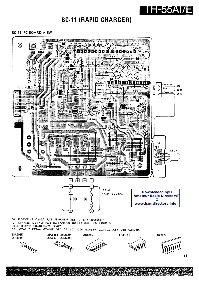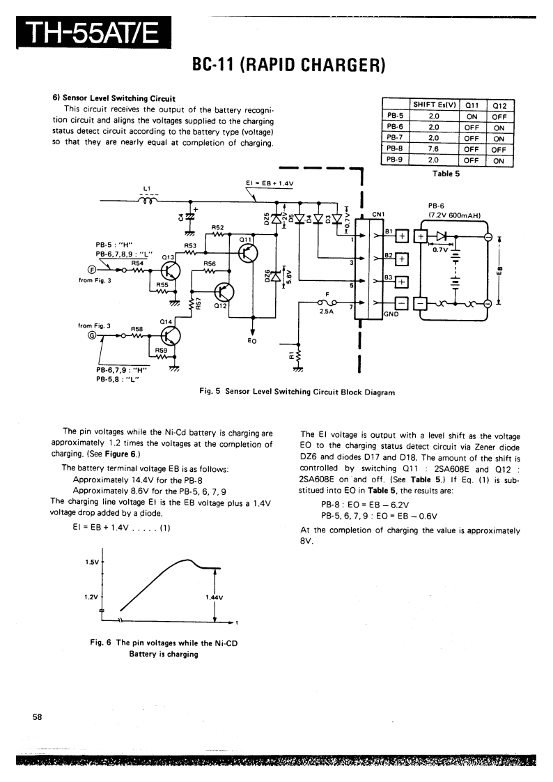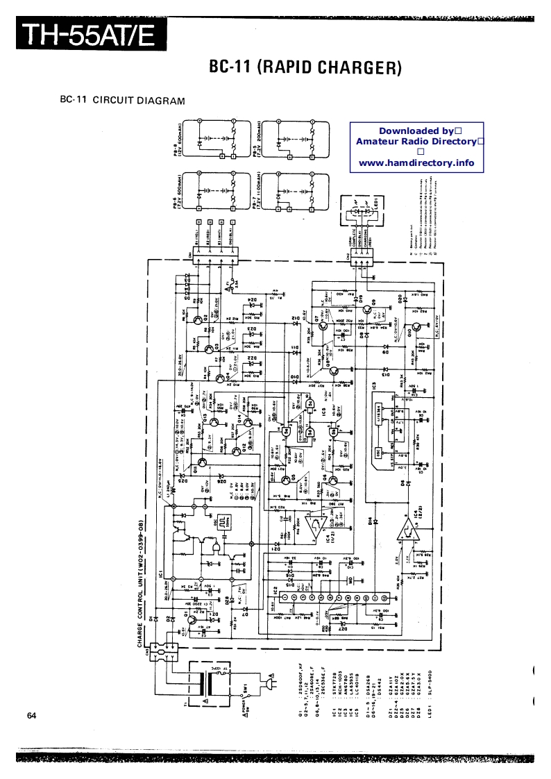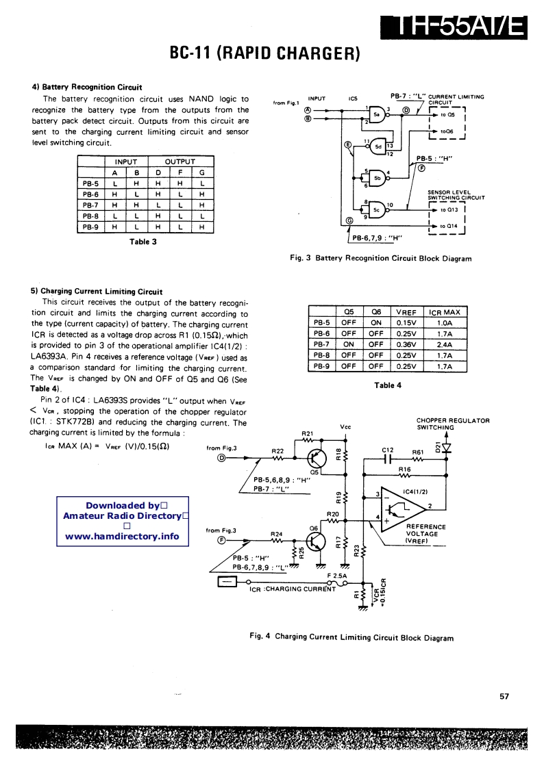 TH-55A17EBC-11 (RAPID CHARGER)BC-11 EXTERNAL VIEWTheory of OperationThe operation of each block is explained below.1)+11V AVR CircuitThis AVR circuit,consisting of a 2SD600F transistor(Q1)and DZA11Y Zener diode (DZ1)provides an outputof approximately +11V as the reference voltage for thecharging circuit consisting of IC2 to IC5.KENWOOD2)Battery Pack Detect CircuitRAPO CHARGERLc-11This circuit detects whether a battery pack is inserted inthe charger.Outputs from this circuit are routed to the resetcircuit and the battery recognition circuit.When a PB-6 or PB-9 is inserted in the charger,asmall amount of current flows from Q2:2SA608E throughR9 to the charging terminal B1 and Q2 turns on.As a result.an output of approximately 11V appears at A in Figure 1.Similarly when a PB-5 or PB-7 is inserted Q3 2SA608EBC-11 CIRCUIT DESCRIPTIONturns on and approximately 11V is provided at output BGeneralWhen a PB-8 is inserted Q4 2SA608E turns on andThe BC-11 is a rapid charger for the PB-5 to PB-9 Ni-Cdapproximately 11V is provided at output Cbatteries for TH-25,TH-45 and TH-55.11~16VCHARGING CURRENT20-26VR68文8立8立R51+P8-6.9PB.7R802M2+]R7038-5PB-825ACHARGING CURRENT FLOWDEPENDING ON BATTERY TYPEBattery Q2 Q3 Q4NoneOFFOFF OFFP8-8OFFOFF ONPB-5 OFF ON OFFto Fig.2P8-6/9ONOFF OFFDownloaded by!▣PB-7 ON ON OFFAmateur Radio DirectoryLTable 1▣www.hamdirectory.infoFig.1 Battery Pack Detect Circuit Block Diagram55