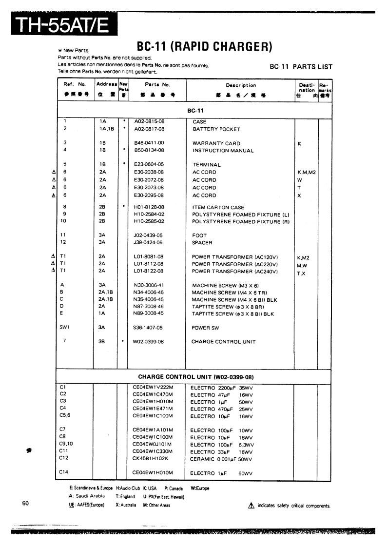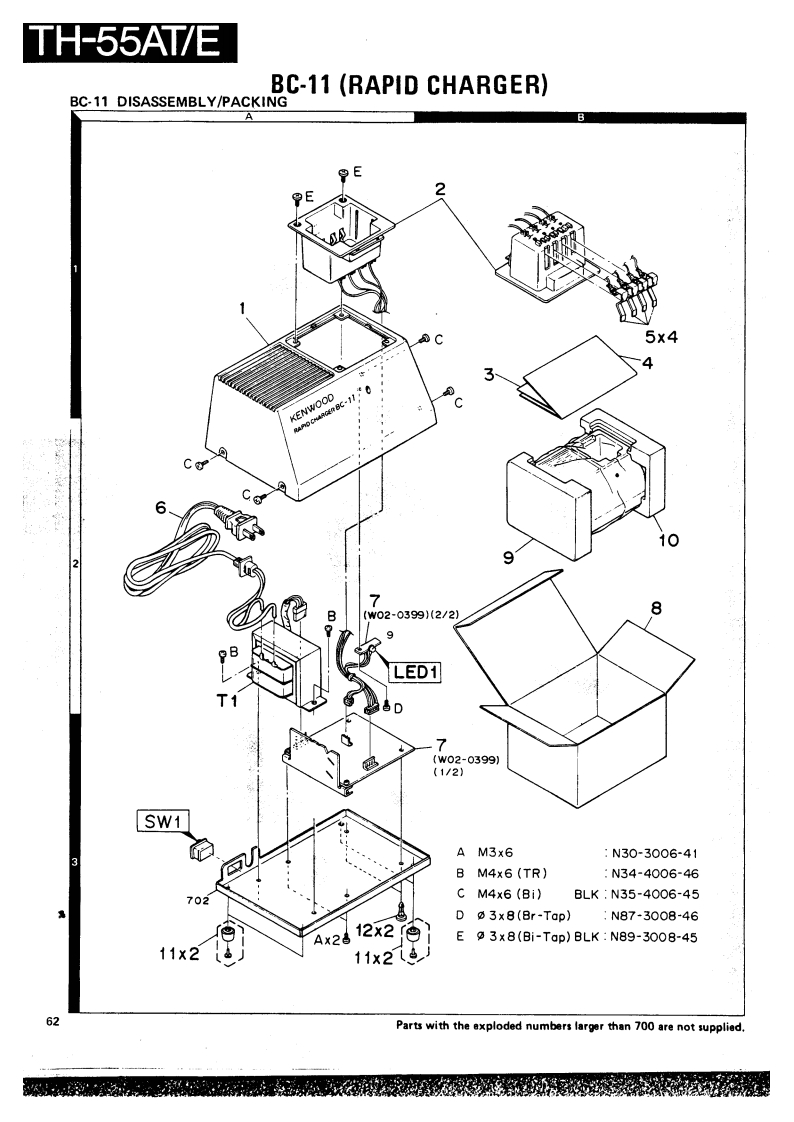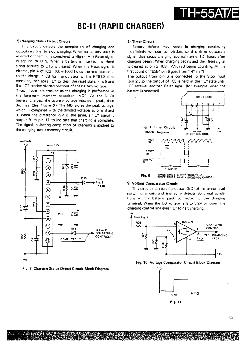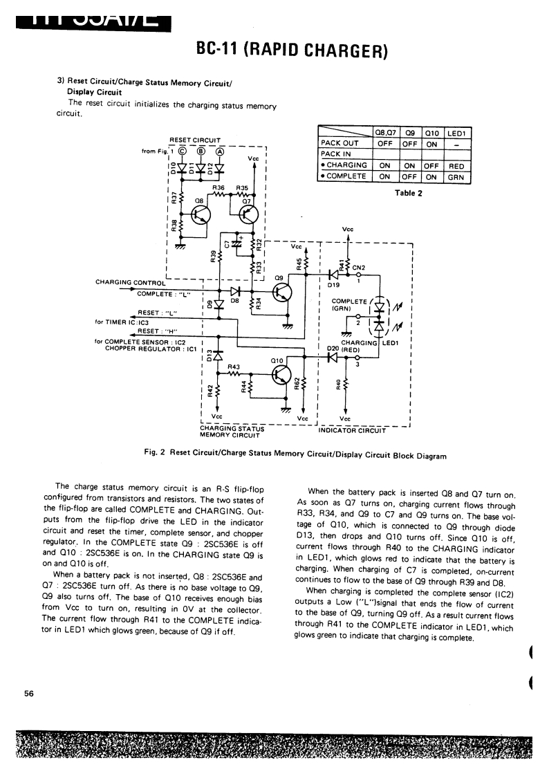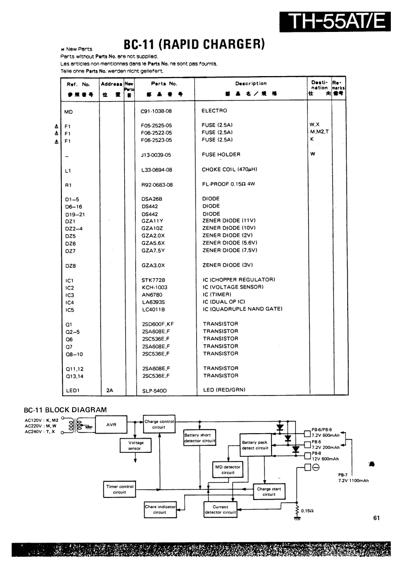 TH-55A17EBC-11 (RAPID CHARGER)BC-11 EXTERNAL VIEWTheory of OperationThe operation of each block is explained below.1)+11V AVR CircuitThis AVR circuit,consisting of a 2SD600F transistor(Q1)and DZA11Y Zener diode (DZ1)provides an outputof approximately +11V as the reference voltage for thecharging circuit consisting of IC2 to IC5.KENWOOD2)Battery Pack Detect CircuitRAPO CHARGERLc-11This circuit detects whether a battery pack is inserted inthe charger.Outputs from this circuit are routed to the resetcircuit and the battery recognition circuit.When a PB-6 or PB-9 is inserted in the charger,asmall amount of current flows from Q2:2SA608E throughR9 to the charging terminal B1 and Q2 turns on.As a result.an output of approximately 11V appears at A in Figure 1.Similarly when a PB-5 or PB-7 is inserted Q3 2SA608EBC-11 CIRCUIT DESCRIPTIONturns on and approximately 11V is provided at output BGeneralWhen a PB-8 is inserted Q4 2SA608E turns on andThe BC-11 is a rapid charger for the PB-5 to PB-9 Ni-Cdapproximately 11V is provided at output Cbatteries for TH-25,TH-45 and TH-55.11~16VCHARGING CURRENT20-26VR68文8立8立R51+P8-6.9PB.7R802M2+]R7038-5PB-825ACHARGING CURRENT FLOWDEPENDING ON BATTERY TYPEBattery Q2 Q3 Q4NoneOFFOFF OFFP8-8OFFOFF ONPB-5 OFF ON OFFto Fig.2P8-6/9ONOFF OFFDownloaded by!▣PB-7 ON ON OFFAmateur Radio DirectoryLTable 1▣www.hamdirectory.infoFig.1 Battery Pack Detect Circuit Block Diagram55
