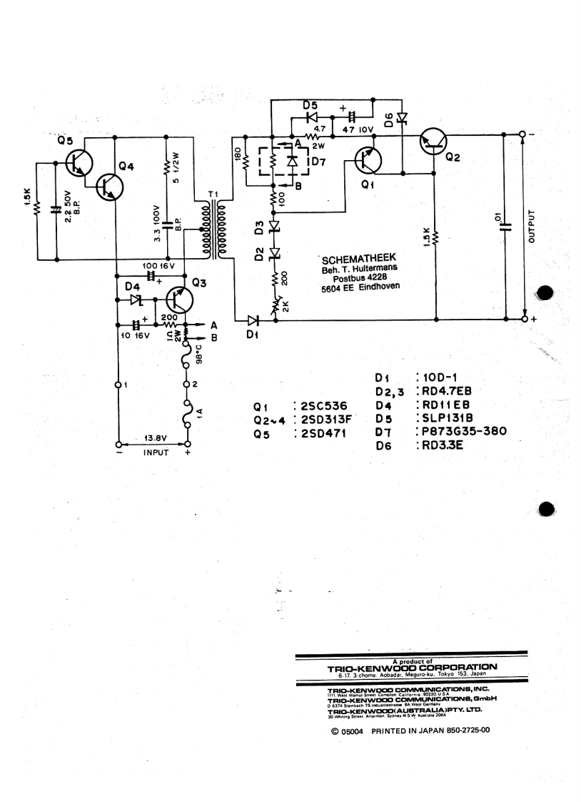 SCHEMATHEEKBeh.T.HultermansPostbus 42285604 EE EindhovenDC-DC QUICK CHARGERMODEL BC-5INSTRUCTION SHEETINTRODUCTIONYou are the owner of our new product,the BC-5 BatteryL四Charger.The Model BC-5 is specifically designed to chargethe TR-2400 Transceiver Ni-Cd battery pack (eight AA.cells).The BC-5 operates from a 12V car battery..OPERATIONIn using the BC-5,the following procedures must beobserved:(1)With the transceiver power switch in the OFF position,CHARGEconinect the BC-5 DC output plug to the transceivertarminal.charger jack.(2)Connect the BC-5 input plug to your car's cigaretteTighter socket.The Ni-Cd battery will begin to'charge.a.The Ni-Cd battery will be fully charged in about 2hours.Disconnect the input plug from the car'scigarette lighter socket after two hours to prevent thebattery overcharge.BC-5 Connectionb.The BC-5 uses a quick charging circuit.When the BC.5 has reduced current,switched from quick chargeto intermittent charge,the.charger indicator willcycle on.and off.CAUTION(1)Avoid overcharging the battery.Note that extendedCheck polarity before inserting plugcharging will shorten the battery life.Squeeze in slightly(2)Do not operate the transceiver while charging theHousingThreac由Capbattery.Spring3)Be sure to stop charging and disconnect the BC-5 fromthe car's cigarette lighter socket after two hours charging,even if the charge indicator does not begin cycling.TheBody1A FuseMetal Tip Comtactbattery will be fully charged for proper transceiverCigar lighter plugoperation.(4)Since the batteries voltage varies with ambient tem-perature,place the BC-5 near the transceiver whileSPECIFICATIONScharging.Avoid charging the battery in direct sunlightApplication:Nickel cadmium (Ni-Cd)bat-or high temperature.tery charger.(5)Charge the battery only when it has been discharged.Power requirement:13.8VDC±15%Failure to observe this precaution will shorten batteryCharging voltage:11.6V DClife.Charging current250mA(at 13.8V DC)(6)After charging,disconnectthe BC-5 from the car'sGround:Negative groundcigarette-lighter socket and from the transceiver.Operating temperature:0°c-+45°CDimensions:55mm (2-3/16)wide45mm(1-3/4)high100mm(3-15/16)longWeight:0.5kg(1.1b)