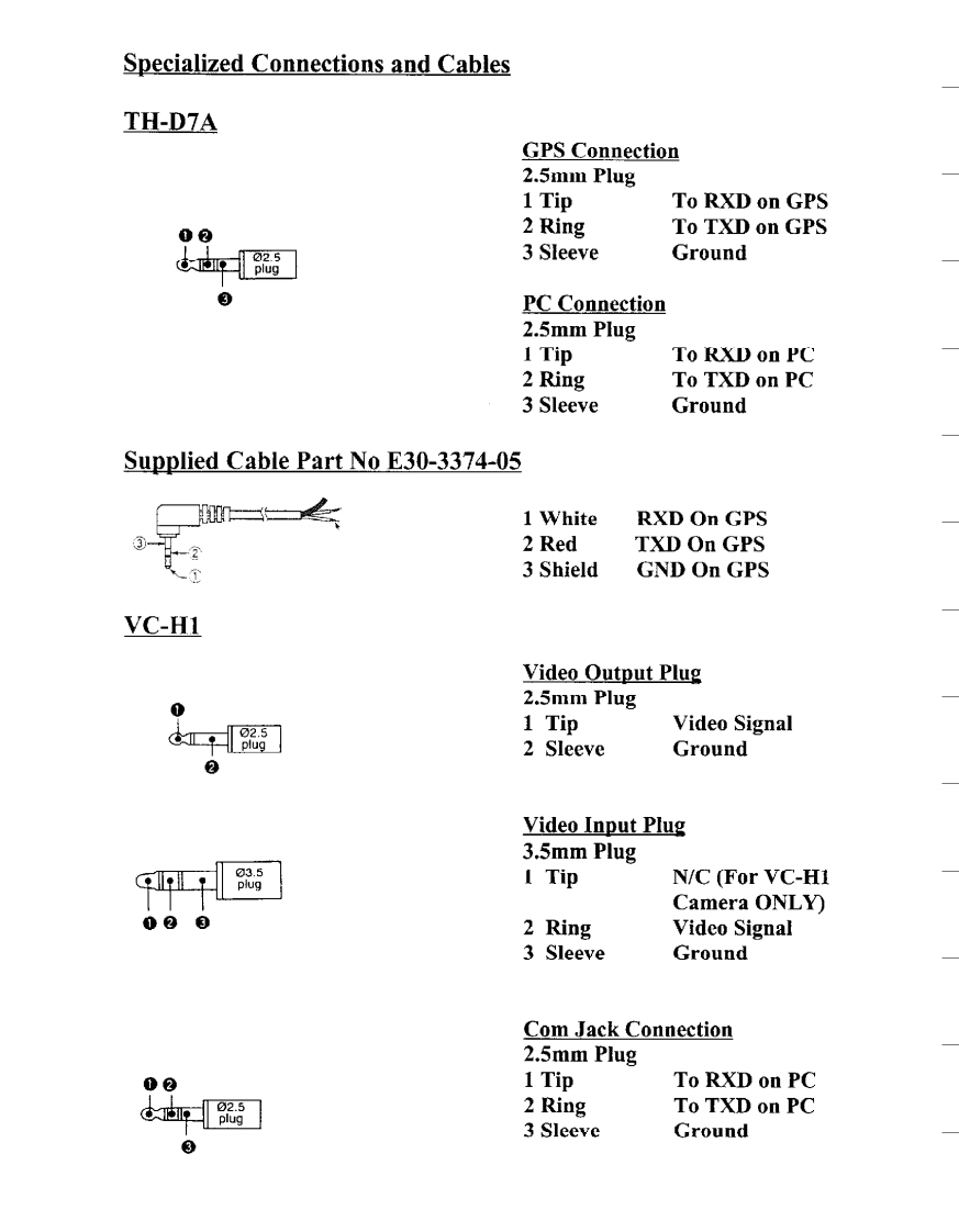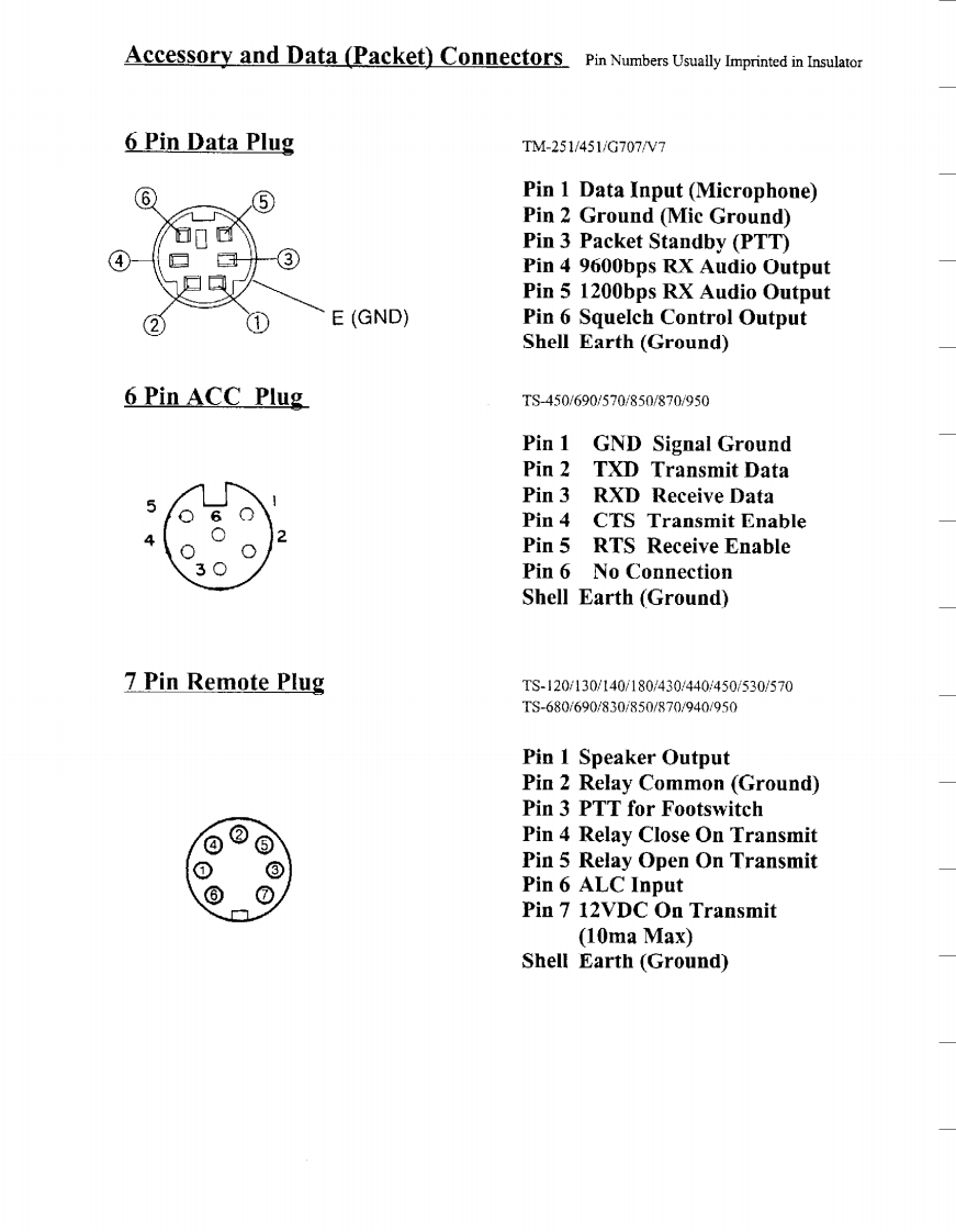 KENWOODAmateur Radio DivisionSubject:Miscellaneous ConnectorsDate:January 26,1999This information is provided "as is,"and is subject to change without notice.Kenwood Service Corporation makes no warranty of any kindwith regard to this information,Including,but not limited to,the implied warranties of merchant ability and fitness for a particular purpose.Kenwood Service Corporation shall not be liable for any error or for incidental or consequential damage in conection with the furnishing.performance,or use of this informationMicrophone Connectors Pin Numbers Usually Imprinted in Insulator4 Pin Microphone PlugTR-7200A7400A/7500TS-120S/130S/180S/511S/520/530/600/700,820/830Pin 1 Microphone32Pin 2 Push To Talk4Pin 3 Chassis GroundPin 4 Microphone Ground5 Pin Microphone PlugTR-7600/7625Pin 1 MicrophonePin 2 Push To TalkPin 3 No ConnectionPin 4 Chassis GroundPin 5 Microphone Ground6 Pin Microphone PlugTR-7730/7800/7850/7930/7950/8400/900091309500Pin 1 Microphone③Pin 2 Push To TalkPin 3 Down②Pin 4 UpPin 5 8VDC (150ma Max)Or N.C.Pin 6 Chassis Ground