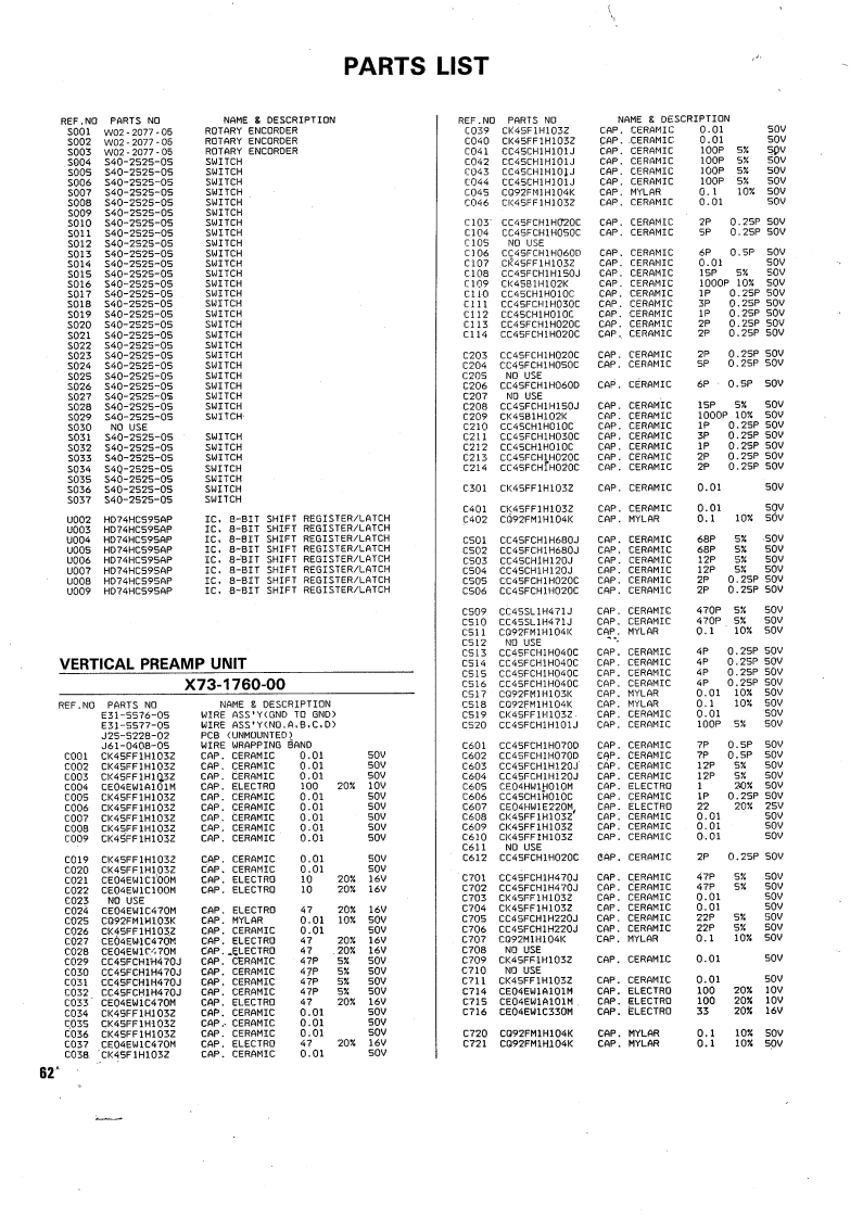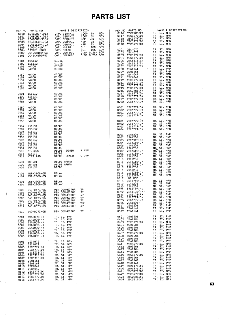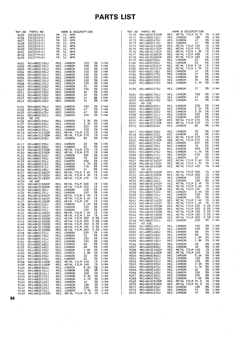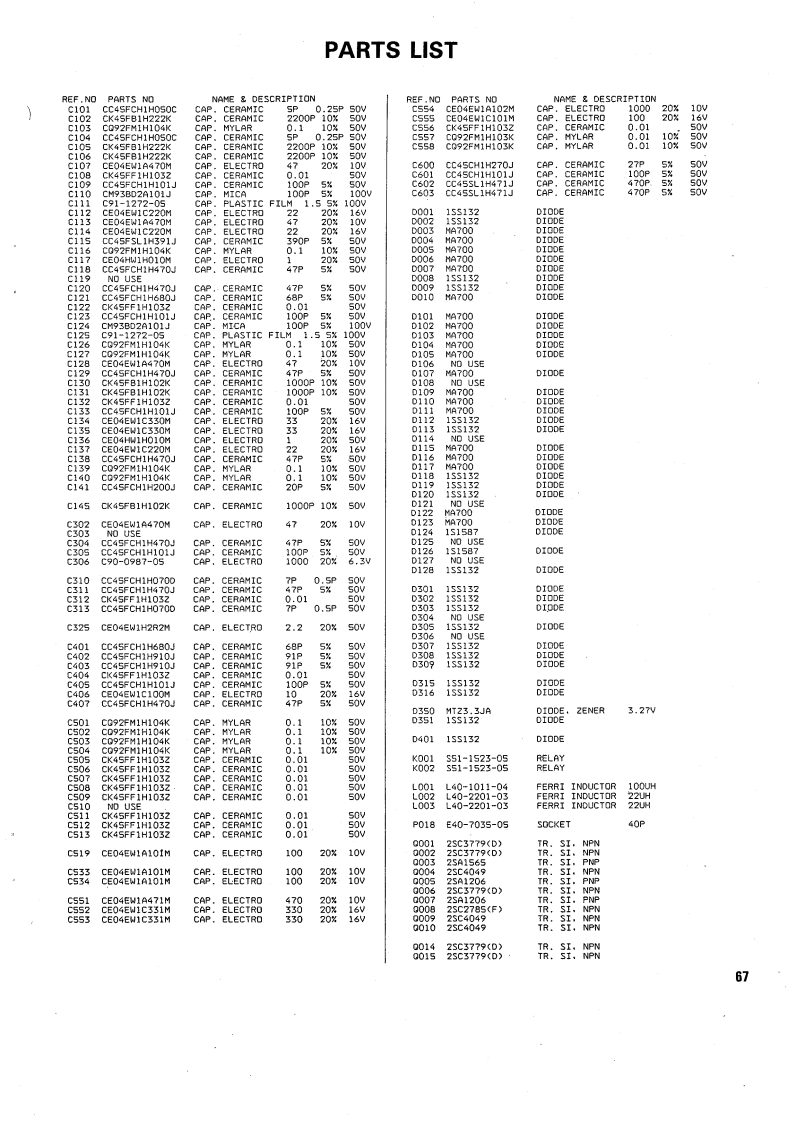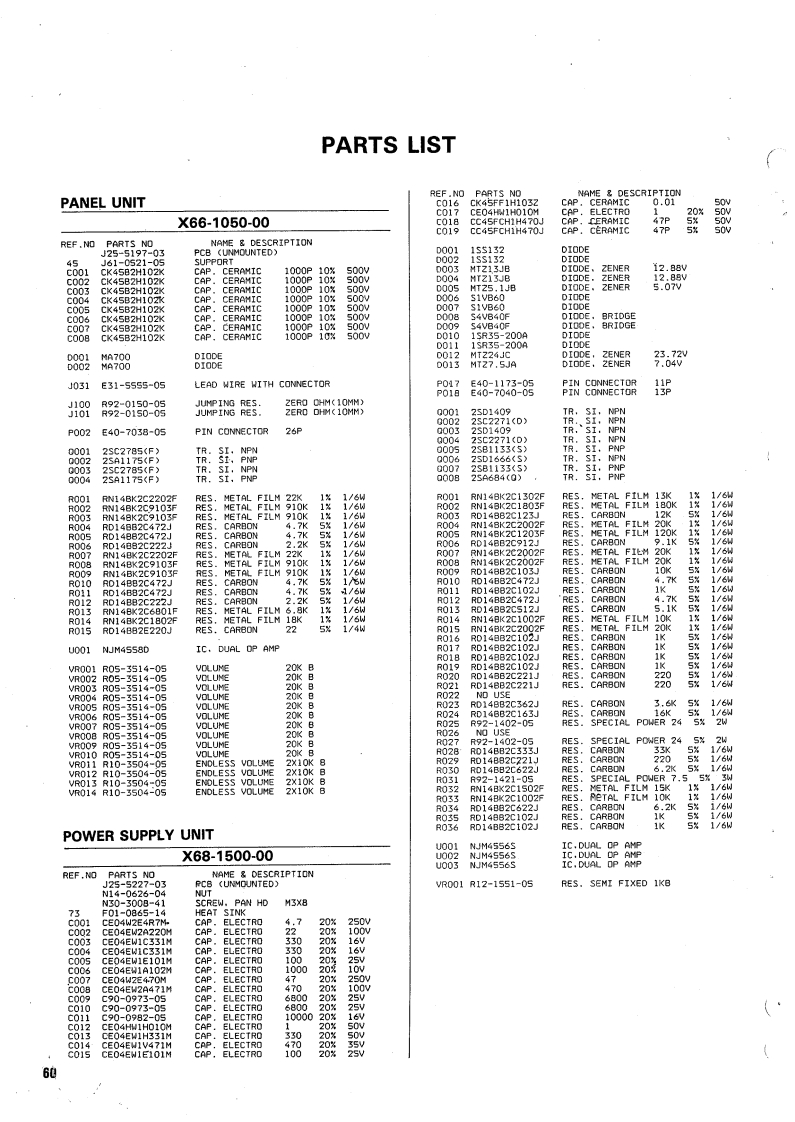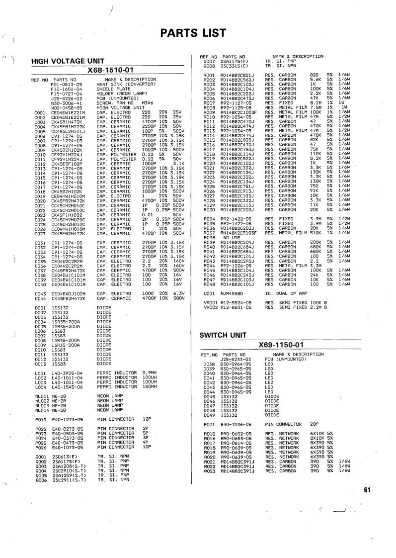 PARTSLISTREFNONAMEDESCRIPTIONCS-6010 UNIT68-150000SUPPLY UNIT-1s10VOLTAGE UNITY70-1630-01REFPARTS NONAME DESCRIPTION807-0703-ESCUTCHEON FOR ASTIGB30-0925-05LAMPB50-10INSTRUCTION MANUAL.JAPANESE-6-10INSTRUCTION MANUAL.ENGLISHE3CEEER585555835555508X69CH UNITREAMP UNITX74-1X77-1490CONNECTUNIN01507CRTUL/CSA03NYLONRIVETILLUMI-0710E31-0717-TO GND)J191660WIRE-0550631.FRE31-5561-05WIREASS'Y(NO.22)E31-5562-05WIREASS'Y(NO.30)E31-5553-0WIREASS'Y(NO.7,8.9E31-5564WIREAs'Y(N0,25E31-556505WIREASS'Y(NO.26>E3105WIREASS'Y(CAL)E31-5S67WIREA55Y(N0.4)F05-1224FUSE1,2A(6X30MH)F0R100/120VF0S-801305FUSE0.8A(5X20MN)FOR220240wF05-8015FUSE0.8A(6X30MH)FOR220/240VF1-0733FELT(CRTSHIELD)F20-0674-04INSULATED SHEET.HIGH VOLTAGEH01-5894-04CARTON BOXMODEL PC-31(LOWCAPACITYPROBEH10FDAMED STYRENEPAD.FRONTH10-2902-0FDAMED STYRENEPAD.REARH20-17270VINYLCOVER03-2301R/0 PROBEPC-31肚CAPCERAMIC33P500W014B82C47RESCARBON4701/6四CASEGNDA01-1194TOP12345678A01-1199-32CASE.BOTTOMA13-0924-12FRAME.RICHTA13-0933FRAME.CENTERA13-093413FRAME.LEFTA13-0927-0FRAME.P.C.BSUPPDRT③A13-0928-FRAMEA13-092903FRANSA20-MOLDED PANELA20-2且27-12MOLDED PANELITEMDESCRIPTIONA21.113PARTS NODECORATIVEPANELA21-1136DECORATIVEPANEL①Ground Wire AssemblyE30-1883-08A23-1683-REAR PANEL8110504FILTERRetractable Hook TipE29-0540-08B30-ASS'Y.SCALE ILLUMINATIONMarker40NAME(Orange)B42-1950-08FLATE.MODEL0121K56789038238387090:25K5878904064660907CAUTION LABELREAR PANELFLEXIBLEWIRE.FOR POWER SWITCH53-00-0256X30MM FUSESELECTOR WITHM FUSETERMINALLUG.BNC0-1HALATCHSHIELD/02TAGEUNITCRT:REINSEESPRING.FOR05RUBEER FOOT19CABLE CLAMF1903HOLDER.COIL1916504WEDGE21-2906GEAR,FORHANDLEJ21-290705RING.FORHANDLEJ21-4642BRACKETJ21-4613-04BRACKETBOSS.FORPOWER SWITCHJ61-0s16SUPPORTJ61-0521-05SUPPORT9HANDLE.CARRYING-0KNOB.VOLT/DIV.SWEEP TIME/DIVK23-080g3KNOB《1BU5ED)845575856k27-050404KNOB.PUSH:POWERK27-0543-04KNOB.PUSH(34 USED)83-8POWER TRANSFORMERL39-0527-5COIL.TRACE ROTATION76-011DELAY LINE540-1524-05PUSH SWITCH.PONERw01-0503-04REAR RUBBER FDOT/CORD WRAPX66-1050-00PANEL UNIT59