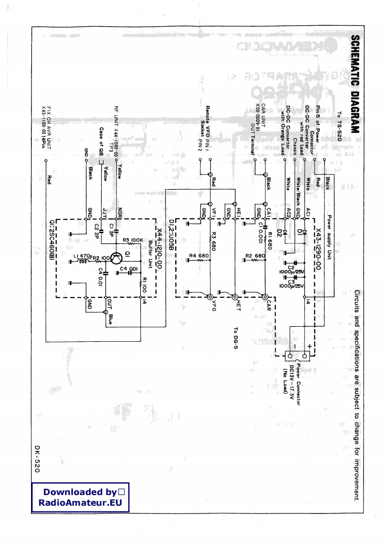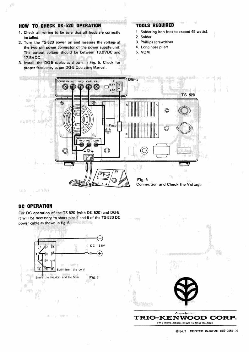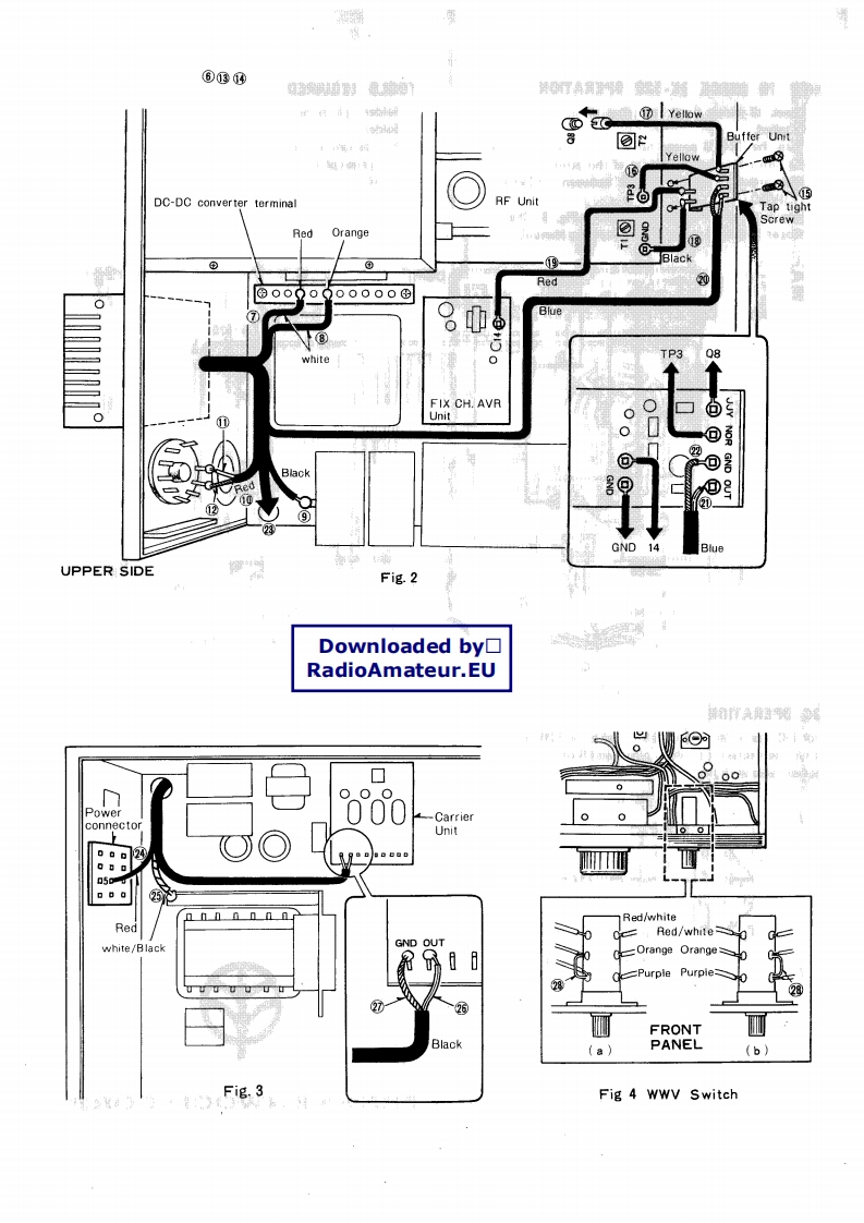 yKENWOODDIGITAL ADAPTOR KITDownloaded by☐RadioAmateur.EUDK-520INSTALLATION MANUALThe KENWOOD DK-520 Digital Adaptor Kit is designedLoctethe cable harness that runs parallel to thefronfor adapting the DG-5 digital counter to the TS-520.Theof the RF unit.DK-520 consists mainly of a power supply with connectors14 Gently move this harness aside to reveal the two mount-to supply the signals to the DG-5,and a buffer unit for theing holes for the buffer unit.HET output signals.15.Install the buffer unit with the two self tapping screws.18.Solder the yellow solid wire from the buffer unit toPARTS SUPPLIEDTP-3 on the RF unit.1.Power supply unitLocate the yellow soid wire with the cap and install it2.Buffer unit.,,,,·,,…1over the case of FET Q8(3sk22)3.Power cableolder the black solid wire from the buffer unit to the4.Fuse,2AGND pin on the RF unit.5.Converter cover9.Solder the red solid wire from the buffer unit to the 14pin of the FIX CH.AVR Unit.6.Mounting stud7.Hardware:2,Locate the coaxial lead with the blue band.a.panhead screw 4x6 mm long............121.Solder the center conductor of this cable to the OUTb.self tapping screws,3x6 mm long........2terminal of the buffer unit.c.lock washer”8f·,····。。。。,1Solder the shield of this cable to the GND terminal.d.flat washer....................3.Feed the remaining coaxial cable,red solid wire,andwhite/black solid wire through the chassis as shown inFig.2.INSTALLATION4.Solder the red solid wire to pin 5 of the power con-First,remove the top and bottom covers of the TS-520.nector as shown in Fig.3.When removing the top cover,remember to unplug the.Solder the white/black solid wire to the chassis groundspeaker lead before setting the top aside.Install the DK-wug.520 as follows:(Ref.to fig.1 thru.6)26.Solder the center conductor of the coaxial cable to theRemove the wing nut and washer from the ground lugOUT terminal of the CAR unit.on the rear panel of the TS-520,and install the mount-Solder the shield to the GND terminal.ing stud on the ground lug.28.Solder a jumper on the WWV/JJY switch as shown in2.Install the DK-520 power supply unit on the mountingfig.4.Do not jumper the orange and purple wire.stud as shown in fig.1.Use the panhead screw,lockwasher,and flat washer to hold the power supply unitin place..Remove the slotted cover from the DC-DC converter.-4.Install the new slotted cover with the notch at thebottom.5.Insert the wiring harness through the notch and feed itover the power transformer.6.Locate the DC-DC converter terminal board (See fig.2).Solder one of the two white solid wires from the powergupply unit to the terminal with the red lead on it..Solder the other white solid wire to the terminal with.the orange lead on it.Solder the black solid wire to the chassis ground lug(See fig.2)导8年Mounting StudPower supply unitLocate the coaxial lead with the red band.M.Solder the center conductor of this cable to pin 1 of theFig 1remote VFO socket.(See fig.2.)Solder the shield of this cable to pin 2.