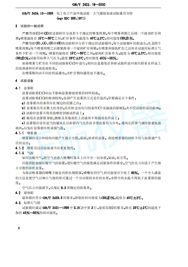 中华人民共和国国家标准电工电子产品环境试验第2部分:试验GB/T2423.18-20001dtEc68-2-52:1996试验Kb:盐雾,交变(氯化钠溶液)代替GBT2423.18-1985Environmental testing-Part 2:Tests-Test Kb:Salt mist,cyclic(sodium chloride solution)1范围本试验适用于预定耐受含盐大气的元件或设备,其耐受程度随选用的严酷等级而定,盐能降低金属零件和(或)非金属零件的性能。金属材料盐腐蚀的机理是电化学腐蚀,而对非金属材料的降解作用却是由盐与材料复杂的化学反应所引起的。腐蚀速率在很大程度上取决于对试验样品表面供应的含氧盐溶液的量、样品的温度和环境的温、湿度。本试验除显示腐蚀效果以外,还可以显示某些非金属材料因吸收盐而劣化的程度,在下述试验方法中,喷射盐溶液的时间是足以充分润湿整件试样。由于这种润湿在湿热条件下贮存之后重复进行(严酷等级(1)和(2),在某些场合下还要补充在试验用标准大气下贮存(严酷等级(3)至(6),因此可以较有效地重现自然环境的效应。严酷等级(1)和(2)适用于试验在海洋环境或在近海地区使用的产品,严酷等级(1)适用于试验在大部使用寿命期间暴露于这种环境的产品(例如船用雷达、甲板设备)。严酷等级(2)适用于试验可能经常暴露于海洋环境、但通常会受封闭物保护的产品(例如通常在船桥或在控制室内使用的航海设备)。此外严酷等级(1)和(2)通常在元件质量保证程序中用作普通腐蚀试验,严酷等级(3)至(6)适用于通常在含盐大气与干燥大气之间频繁交替使用的产品,例如汽车及其零部件。因此,严酷等级(3)至(6)与严酷等级(1)和(2)相比含有一个在试验用标准大气条件下的附加贮存。实际上,在中断工作的期间,例如在周末,可能出现干燥大气。在严酷等级(3)至(6)中包含的这一干燥阶段导致了可能与恒定湿热条件下完全不同的腐蚀机理。试验方法与使用条件相比较是加速的。但这种试验方法不可能为各种不同类型的样品建立一个综合加速系数(参见EC355).2引用标准下列标准所包含的条文,通过在本标准中引用而构成为本标准的条文。本标准出版时,所示版本均为有效。所有标准都会被修订,使用本标准的各方应探讨使用下列标准最新版本的可能性。GB/T2421一1999电工电子产品基本环境试验规程总则dtEC681:1988)GB/T2423.3一1993电工电子产品环境试验试验Ca:恒定湿热试验方法(eqv IEC68-2-3:1985)国家质量技术监督局2000-01-03批准2000-08-01实施1