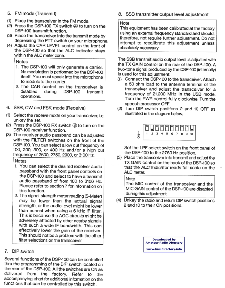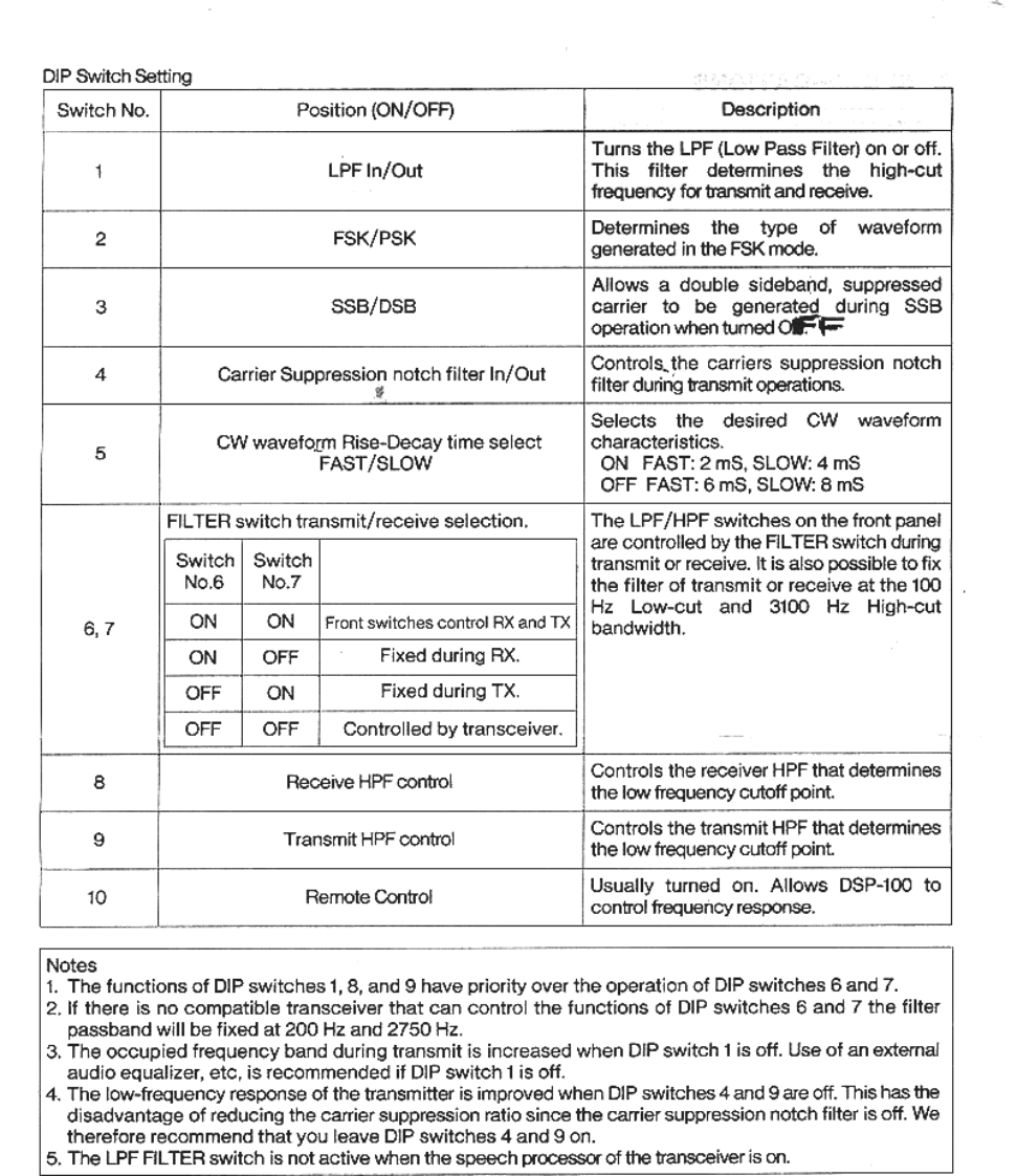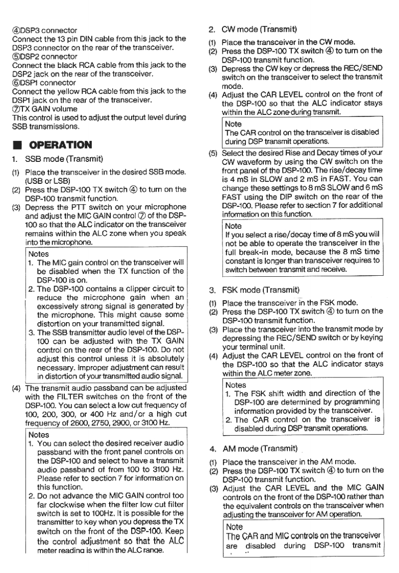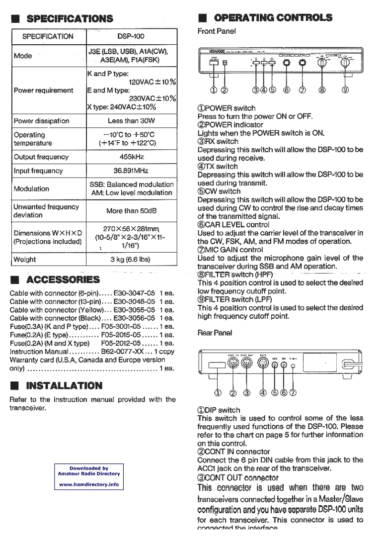 KENWOOD DSP-100 MANUALNotice to the user:GeneralOne or more of the following statements may beDigital Signal Processing is a method of signalapplicable to this equipment.manipulation that takes an analog signal,such as asine wave,and converts it into a digital waveformFCC WARNINGthat looks a lot like a staircase.By converting theThis equipment generates or uses radio frequencysignal into a digital waveform it is possible to removeenergy.Changes or modifications to thissome of the noise associated with the signal,andequipment may cause harmful interference unlessalso to tailor the audio passband of the transceiverthe modifications are expressly approved in thefor the best performance.instruction manual.The user could lose theauthority to operate this equipment if anDSP also has the advantage of providing increasedunauthorized change or modification is made.suppression of the unwanted sideband during SSBoperations.It increases the amount of carrierInformation to the digital device user required bysuppression,provides an improved CW waveformthe FCC:that may be tailored for operator preference of riseThis equipment has been tested and found toand decay times,and provides a cleaner RTTY/FSKcomply with the limits for a Class B digital device,signal that decreases errors.pursuant to Part 15 of the FCC Rules.These limitsare designed to provide reasonable protectionOperator controls are provided on the front panel ofagainst harmful interference in a residentialthe DSP-100 to allow the operator to select 4installation.This equipment generates,uses anddifferent LPF response limits and 4 different HPFcan generate radio frequency energy and,if notresponse limits.This is useful in pileups as itinstalled and used in accordance with theprovides maximum signal intelligence with minimuminstructions,may cause harmful interference tobandwidth.Since the signal is also digitallyradio communications.However,there is noprocessed this results in a signal that is "cleaner orguarantee that the interference will not occur in amore crisp"than an equivalent analog signal.Thisparticular installation.If this equipment does causemakes it easier for the DX station to pick you out ofharmful interference to radio or televisionthe pile-up.reception,which can be determined by tuming theequipment off and on,the user is encouraged toDuring marginal band conditions the ability to digitallytry to correct the interference by one or more ofprocess the incoming receive audio signal can alsothe following measures:result in a cleaner signal.Since the processing isReorient or relocate the receiving antennadone at an IF level it results in a more copyableIncrease the separation between thesignal.Not only are you able to tailor the audioequipment and receiver.frequency response,but because the signal hasConnect the equipment into an outlet on abeen digitally processed it also appears to becircuit different from that to which the"cleaner or more crisp".receiver is connected.Consult the dealer for