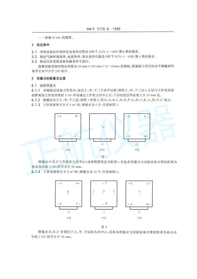 中华人民共和国国家标准电工电子产品环境试验设备基本参数GB/T5170.8-1996检定方法盐雾试验设备代替GB5170.8—85Inspection methods for basic parameters of environmentaltesting equipments for electric and electronic products-Salt mist testing equipments1范围本标准规定了盐雾试验设备的检定项目、检定用仪器、测量点的位置与数量、检定步骤和检定数据的处理与检定结果。本标准适用于对GB/T2423.17《电工电子产品基本环境试验规程试验Ka:盐雾试验方法》和GB2423.18《电工电子产品基本环境试验规程试脸Kb:交变盐雾试验方法(氯化钠溶液)》所用盐雾试验设备的周期检定。本标准也适用于类似设备的周期检定。对交变盐雾试验所用湿热试验设备的周期检定见GB/T5170.3。2引用标准下列标准所包含的条文,通过在本标准中引用而构成为本标准的条文。本标准出版时,所示版本均为有效。所有标准都会被修订,使用本标准的各方应探讨使用下列标准最新版本的可能性GB/T2423.17一93电工电子产品基本环境试验规程试验Ka:盐雾试验方法GB2423.18-85电工电子产品基本环境试验规程试验Kb:交变盐雾试验方法(氯化钠溶液)GB/T5170.1-1995电工电子产品环境试验设备基本参数检定方法总则3检定项目检定项目包括:一温度偏差:盐雾沉降率。4检定用主要仪器及要求4.1温度测量仪器采用由铂电阻,热电偶或其他温度传感器组成的温度测量仪器,其系统精确度为士0.2℃,传感器的热时间常数不大于20$。4.2盐雾沉降量测量仪器盐雾沉降量测量仪器由以下两部分组成:一直径100mm的玻璃附斗:国家技术监督局1996-12-13批准1997-11-01实施