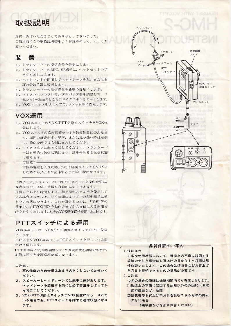 HEADSET WITH VOX/PTTDownloaded byHMC-2KENWOODRadioManual.EUKENWOOD CORPORATIONINSTRUCTION MANUALeT邢g86592828Thank you for purchasing this new product.Pleaseread this instruction manual carefully before placingVOX OPERATIONyour HMC-2 in service.1.Place the VOX/PTT switch on the VOX unit tothe VOX position.2.Adjust the sensitivity control on the VOX unit toINSTALLATIONthe desired level.When the ambient noise level ishigh,or conditions are windy,you can reduceSet the volume control on the transceiver to minimumthe sensitivity by turning the control counter-before connecting the headset.clockwise.In quiet locations you can increase1,Insert the headset plug into the MIC/SP jack onthe sensitivity by turning the control clockwise.the transceiver.The VOX delay is approximately 1 second.2.Put the headset on and adjust the band so thatthe headset sits comfortably on your head.Insert the earphone into your ear.3.Adjust the volume on the transceiver for a com-PTT SWITCH OPERATIONfortable listening level.4.Adjust the microphone boom so that the1.Place the VOX/PTT switch to the PTT position.microphone is approximately 1 -3 cm (0.42.Press and hold the PTT switch on the VOX unit1.2 in.from your mouth.whenever you wish to transmit.5.Attach the VOX unit to your pocket,etc.,usingthe attached hook.NOTE:During PTT switch operation you can adjust themicrophone sensitivity with the sensitivity control.HeadbandTo increase sensitivity turn the control clockwise.CAUTION:1.Do not increase the volume to a level that maycause discomfort.Earphone2.The volume level of the transceiver speaker andSensitivity controlheadphone are not the same.Be sure todecrease the volume level before putting on theMicrophoneheadset.3.The PTT switch on both the transceiver and theBoomPTT switchHMC-2 will function regardless of the VOX/PTTswitch setting on the HMC-2.VOX/PTTswitchVOX unitSPPlug