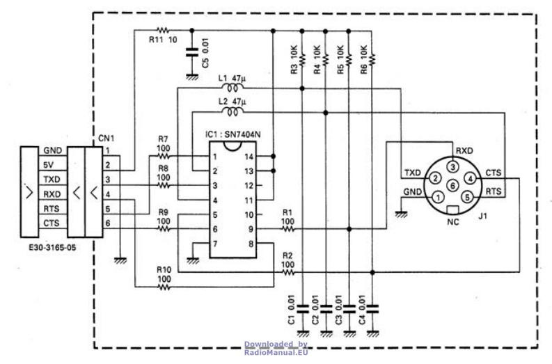 Kenwood TS-50 HF TransceiverIF-10D module for Computer InterfaceThis is the entire circuit of the (expensive and now-discontinued)Kenwood IF-10D interface for the TS-50transceiver.It inverts TTL-level data from the radio's digital control board to the "half-RS232"output seen atthe 5-pin DIN computer-control connector of other Kenwood transceivers.The four inverters are 4/6ths ofa 74LS04 TTL hex inverter.The device is packaged in a metal box with the same 5-pin DIN connector seen on the rear panels of largerKenwood radios.A 7"pigtail with a 6-contact high-density miniature connector mates with the radiomotherboard through a hole on the underside of the TS50.Although Kenwood recommends that you then use their IF-232 interface to+5convert from 0V/+5 V to true -12V/+12V RS-232 levels,most PC serialports will work with this interface as-is.The main advantage of the IF-232is ground isolation--their interface incorporates opto-isolators1010 uHRTSCTSfmtoRadioComputer+510010 uHTXDRXDfmtoRadioComputer+5CTSRTStofmRadioCom puter+51010RXDTXDtofmRadioComputerStephen H.Smith wa8lmf aol.com 4 December 2003Downloaded byRadioManual.EU