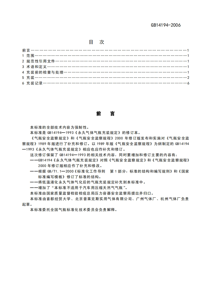 永久气体气瓶充装规定GB14194-2006348072@abc4个月前发布关注私信0.15MB8页035永久气体气瓶充装规定GB14194-2006此内容为付费资源,请付费后查看¥19¥23黄金会员免费钻石会员免费立即购买您当前未登录!建议登陆后购买,可保存购买订单付费资源 第1页 / 共8页 第2页 / 共8页 试读已结束,还剩6页,您可下载完整版后进行离线阅读 THE END标准规范 文本预览 ICS71.100.20J76GB中华人民共玉国家示准GB14194-2006代替GB14194-1993永久气体气瓶充装规定Rules for filling of permanent gas cylinders2006-07-19发布2007-02-01实施中华人民共和国国家质量监督检验检疫总局发布中国国家标准化管理委员会 查看更多 收起部分 喜欢就支持一下吧收藏