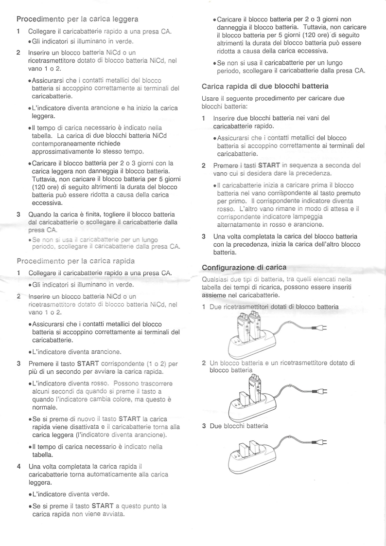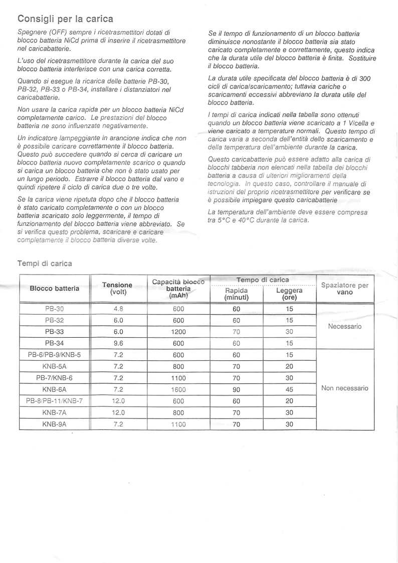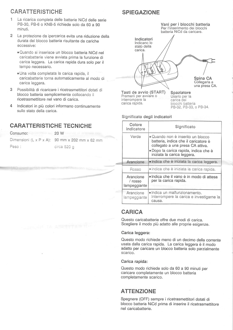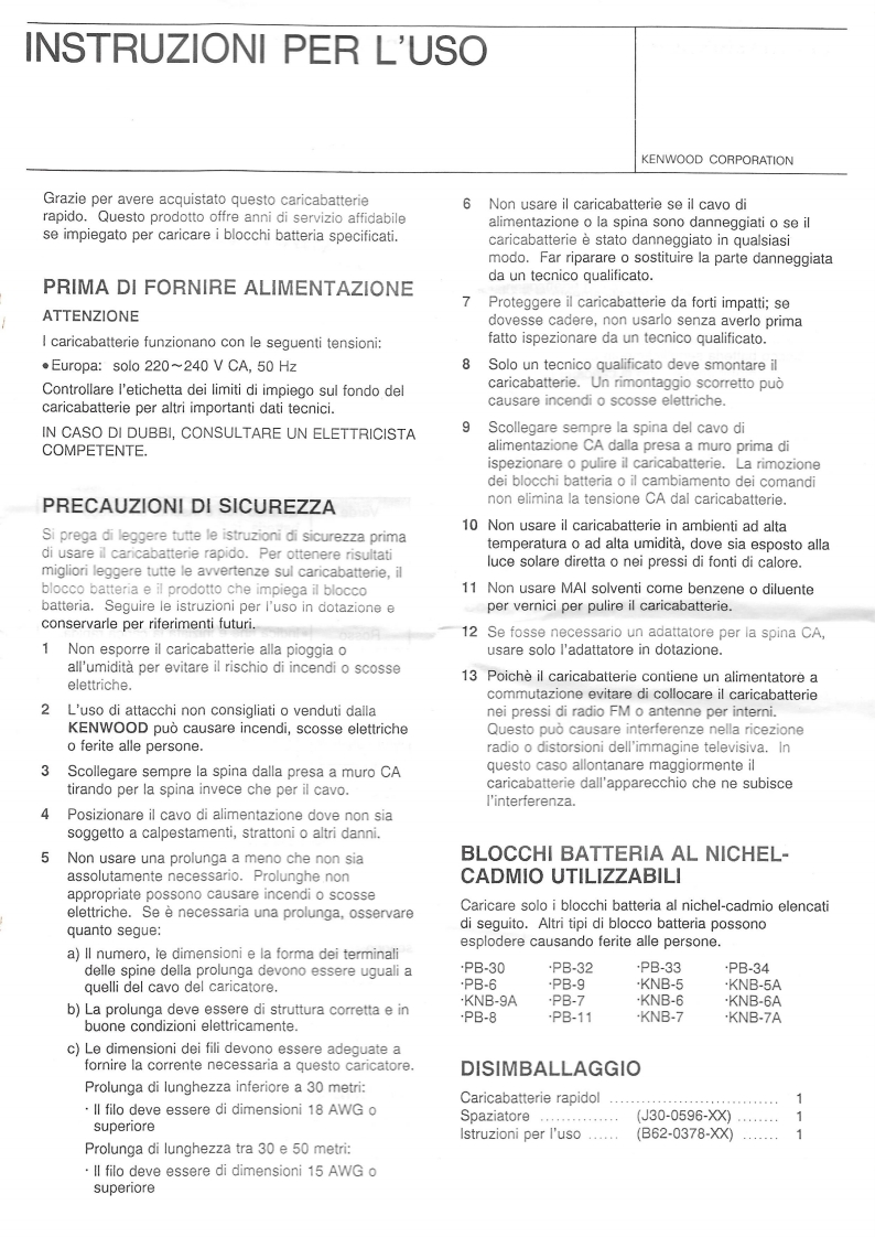 KSC-14KENWOODRAPID CHARGERINSTRUCTION MANUALKENWOOD CORPORATIONCARICABATTERIE RAPIDOINSTRUZIONI PER L'USOThank you for purchasing this Rapid Charger.This6Do not use the charger if it has a damaged powerproduct will offer years of reliable service when used tocable or plug,or the charger has been damaged incharge the specified battery packs.any way.Have a qualified technician replace orrepair the damaged part.BEFORE APPLYING POWER7Protect the charger from strong impacts;do not usethe charger if it has been dropped until it has beenWARNINGinspected by a qualified technician.Chargers operate on the following voltages:8Only a qualified technician should disassemble the.Europe220~240 V AC,50 Hz onlycharger.Incorrect reassembly can cause fire orCheck the rating label attached to the bottom of theelectric shock.charger for other important specifications.9Always remove the AC plug from a wall outletbefore attempting to inspect or clean the charger.Removing the battery packs or changing theSAFETY PRECAUTIONScontrols does not remove the AC voltage from thechargerPlease read all safety instructions before using thisRapid Charger.For best results,be aware of all10 Do not use the charger in high-temperature or high-warnings on the charger,the battery pack and thehumidity environments,in direct sunlight,or nearproduct using the battery pack.Follow the providedheaters.operating instructions,and retain them for future11 NEVER use solvents such as benzene or paintreference.thinner for cleaning the charger.Do not expose the charger to rain or moisture to12 When an AC plug adaptor is required,use only theavoid the risk of fire or electric shock.supplied adapter.2Use of an attachment not recommended by or sold13 Since the charger contains a switching powerby KENWOOD can cause fire,electric shock,orsupply,avoid bringing the charger near FM radios orinjury.indoor antennas.Doing so may induce noise in FMradios or image distortion on television video.If this3Always remove the plug from an AC wall outlet byoccurs,increase the separation between thepulling on the plug rather than the cable.charger and the equipment experiencing thePosition the power cable so it will not be steppedinterference.4on,tripped over,or otherwise subjected to damage.5Do not use an extension cable unless absolutelyAPPLICABLE NICKEL-CADMIUMnecessary.Improper extension cables can causeBATTERY PACKSfire or electric shock.If an extension cable isrequired,observe the following points:Charge only the nickel-cadmium rechargeable batterya)The quantity,size and shape of pins on thepacks listed below.Other types of batteries may burstextension cable plugs must be the same as oncausing personal injury.the charger.PB-30PB-32PB-33PB-34b)The extension cable must be properly wired andPB-6PB-9KNB-5KNB-5Ain good electrical condition.KNB-9APB-7KNB-6KNB-6APB-8-PB-11KNB-7KNB-7Ac)The wire size must be adequate to carry thecurrent required by this charger.Extension cables 100 feet long:UNPACKINGWire size must be 18 AWG