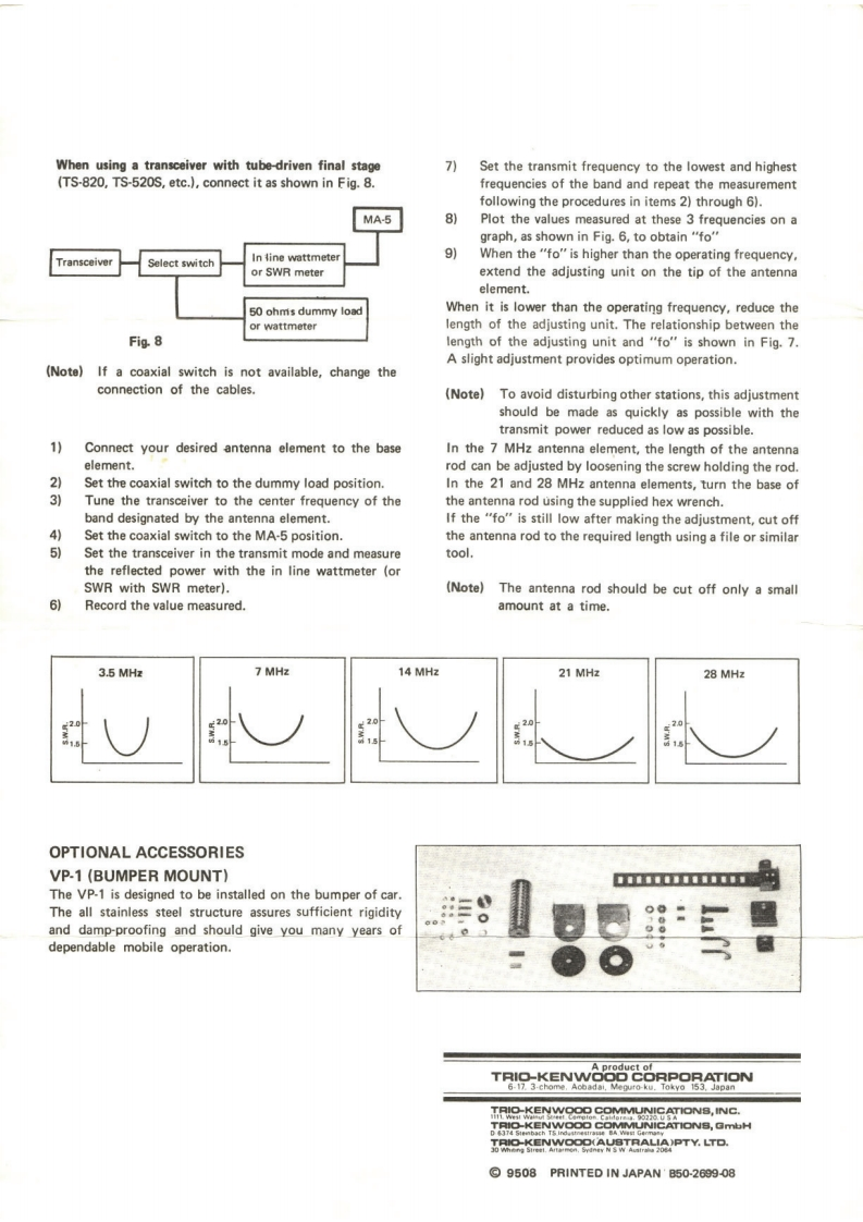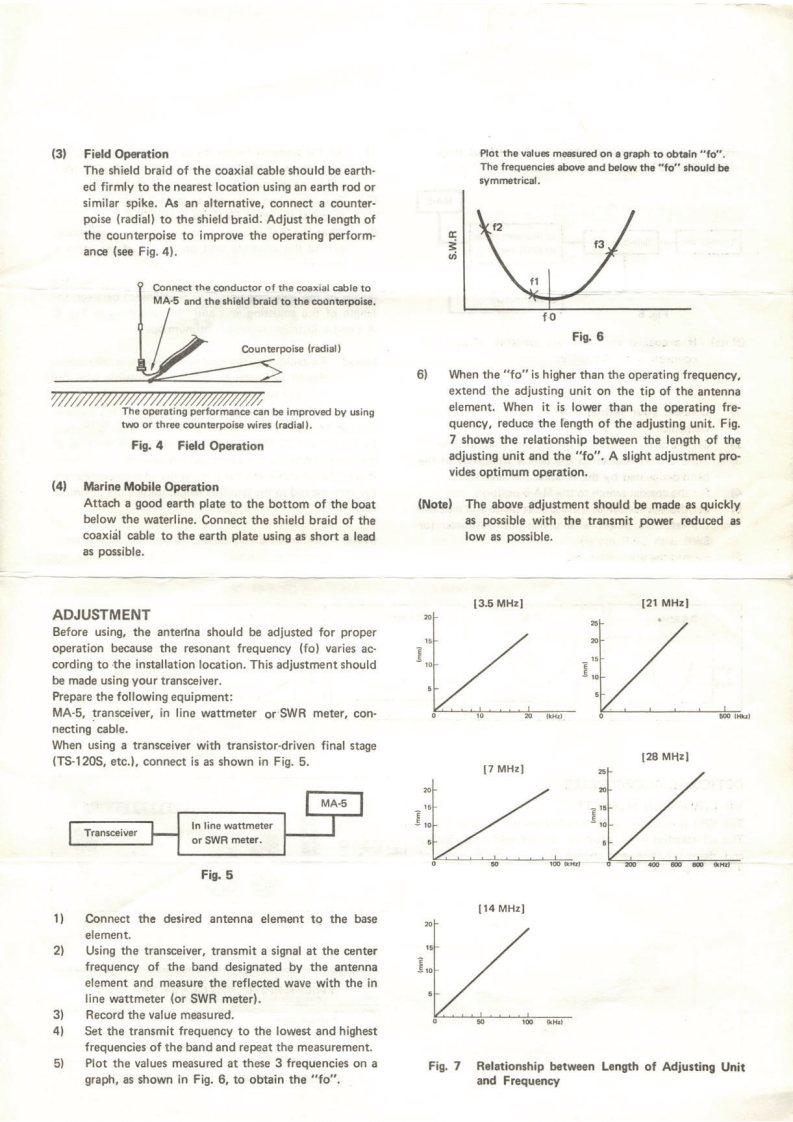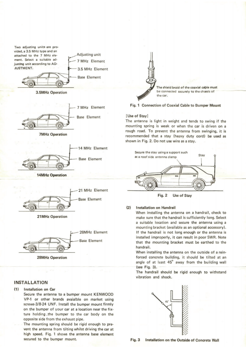 KENWOODHF MOBILE ANTENNA 5 BAND HELICAL TYPEMODEL MA-5INSTRUCTION MANUALSPECIFICATIONSFEATURESBand3.5,7,14,21,28MHzThe MA-5 is a high performance antenna basicallyImpedance 50 ohmsdesigned to be mounted on the bumper of a car.VSWR3.5,7,14MHz1.5:1It may also be mounted on the roof of a building or the21,28MHz1.3:1handrail of a terrace for satisfactory HF operation.Max.PowerSuitable for field operation and marine mobile operation.Input200W pep5-band on-the-air operation with the supplied antennaLengthBase Element1245(49-0)mm(inch)elements (3.5,7,14,21 and 28MHz bands).3.5 MHz Element 185(7-9/32)mm (inch)Center frequencies of the antenna elements are easily.7 MHz Element,1250(49-7/32)mm (inch)adjustable.14 MHz Element 1150(39-15/16)mm (inch)The antenna elements are covered with FRP (Fiberglass21 MHz Element 485(19-3/32)mm (inch)reinforced plastic)to provide adequate flexibility.The28 MHz Element 165(6-1/2)mm (inch)unique helical type antenna assures excellent perform-3.5 MHz Adjusting unit 510(20-1/8)mm (inch)ance.Weight779g(1.7131bs.)Base Element240g3.5 MHz Element 200g7 MHz Element 155g14 MHz Element 95g21 MHz Element 40g28 MHz Element 35g3.5 MHz Adjusting unit 14g7 MHz Element28 MHz Element 3.5 MHz Adjusting unitBase Element14 MHz Element21 MHz Element3.5 MHz ElementMOBILE ANTENNA
