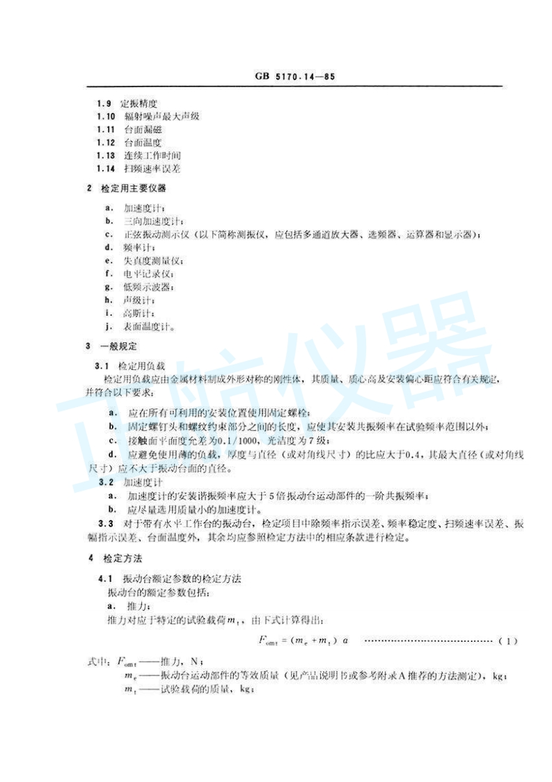 中华人民共和国国家标准电工电子产品环境试验设备UDC621.3基本参数检定方法,002.6-79:534.6振动(正弦)试验用电动振动台GB5170.14-85Inspection methods for basic parametersof environmental testing equipmentsfor electric and electronic productsElectrodynamic vibrating type machinesfor vibration (sinusoidal)test本标准规定了按GB2423.10《电工电子产品基本环境试验规程试验F:振动(正弦)试验方法》进行振动试验用电动振动台系统(以下简称振动台)基本参数的检定方法。振动台由振动台台体、激磁电源、功率放大器、控制和测量装置、水平工作台(当试验系统需要时)组成。1检定项目1.1额定参数1.1.1推力1.1.2频率范围空线频率范围:b。满较频率范围1.1.3较荷a.最大载荷,b.负载偏心矩c.水平负我矩:d.最大抗颠力矩(当带有水平工作台时)。1.1.4振动福值a.空载最大加速度幅值:b.满载最大加速度幅值,c.最大速度幅值;d.最大位移幅值。1.2加速度波形失真度1.3横向振动1,4台面加速度幅值均匀度1.5频率指示误差1.6颜率稳定度1.7振辐指示误差1.8木底噪声加速度国家标准局1985-04-07发布1986-01-01实施