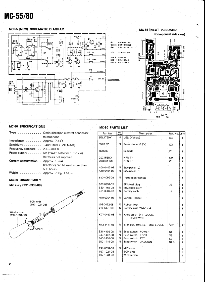 MC-55KENWOODMC-55 PARTS LISTSERVICE MANUALPart No.DescriptionRef.No.Q'tyTC4013BPC.MOS ICIC11SEL1334GLED (Green)D101MC-55,MC-80,MC-85SEL1334RLED (Red)D1021s1555Si diodeD1-3SW-100A/B2SA1015(Y1PNP TrQ22SA1048(Y1PNP TrNEW TYPE ONLYQ23SW-200/20002SC1627A(Y)NPN TrQ42SC1815(Y)NPN TrQ312SD661T/UNPN TrQ1MC-55 SPECIFICATIONSA02-0635-08Case (Front)1A02-0636-08Case (Rear)TypeUnidirectional electret condensermicrophoneB42-2315-08Name plateImpedance········Appr0x.7002E03-0156-08Bridge connectorAccessorycensitivity.....·.·-50dB(MIC LEVEL MAX)E07-0651-056P Metal plug M1Frequency response..300-8000HzE07-0852-058P Metal plug M2J1Power requirement ..6-15V DCE30-1727-08Shield cable 2.5mE30-1728-08NMic cable ass'y 8P M2E30-1767-08Mic cable ass'y 6P M1MC-55 DISASSEMBLYMic ass'y(T91-0329-08)Flexible shaft ass'y》》》H70-0303-08Carton(inside】T97.1036081J21-279508Shift lever mounting hardwareECM unitK29-0778-08KnobREC-SEND(T910328-081Shield cable 2.5mK29.0779-08Knob UP4E30-172708)K29-078008Knob DOWNWind screenK29-0781-08KnobMIC LEVELT97.1034-08OPENR12.1427-08Trim pot.4.7kn (B)MIC LEVELVR1S31-1410-08Slide switch POWEROPENS33-2405-08Lever switch SEND-RECS4S50-1414-08Tact switchUP,DOWNS232T910328-08NECM unit1T97032908Mic ass'yMC-55 PC BOARDT97.1034-08Wind screen(Component side view)T97.103608NFlexible shaft ass'yMC-55 (ORIGINAL)SCHEMATIC DIAGRAM82250661T/U2SA10:5(YI9:2sC16151Y1润GNDQ4:25C1627417IC1·TC4013BPD13:151555S3 DOWND101:sEL1334GD102:SEL1334REXT.DCECMUNIT826