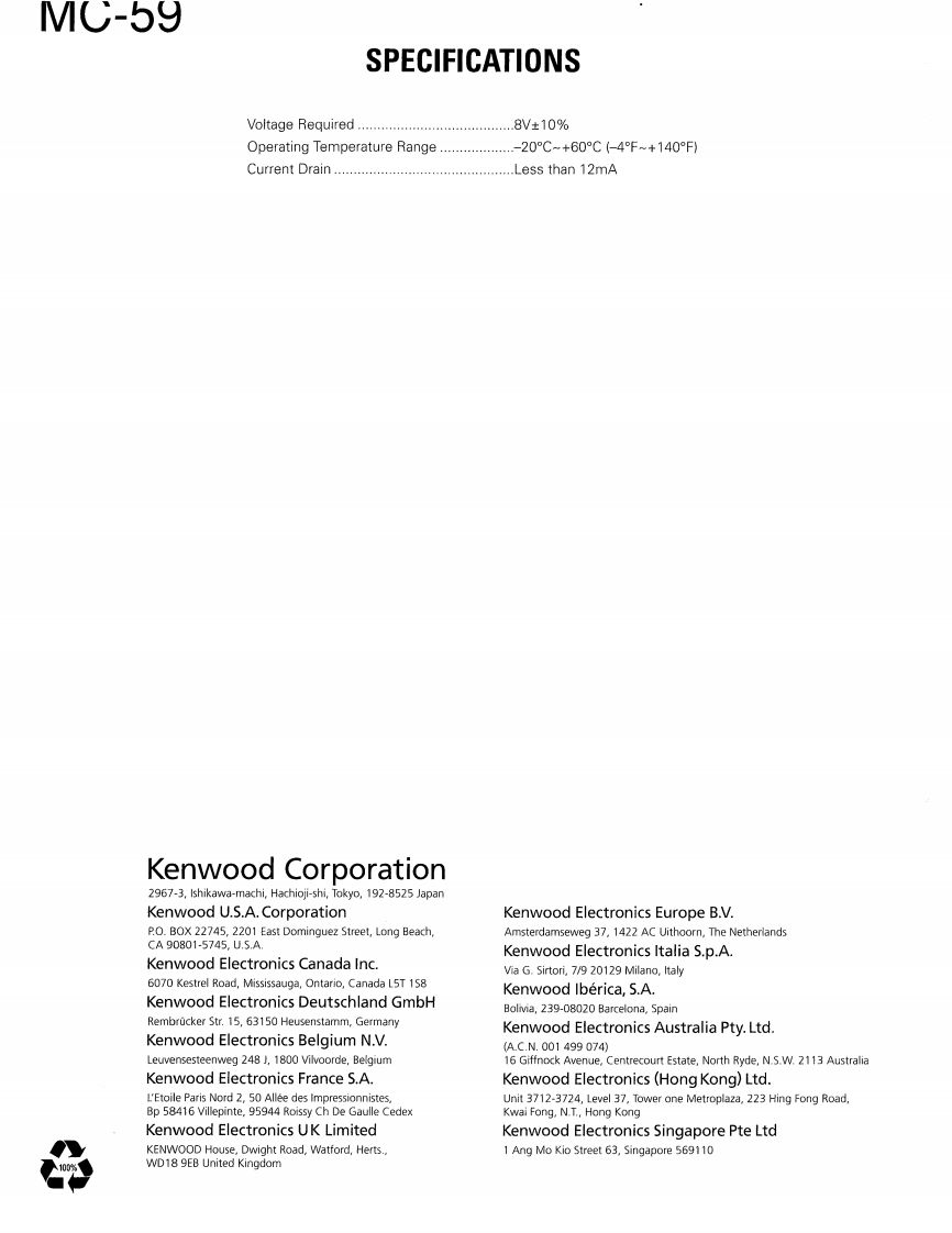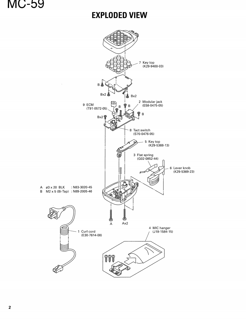 KEYPAD MICROPHONEMC-59KENWOODKenwood CorporationSERVICE MANUAL2007-8 PRINTED IN JAPANB51-8804-00(N)263Lever knobKey topCurl cordK29-5369-23)(K29-9400-03)(E30-7614-08)PARTS LISTRef.No.AddressNewpartsParts No.DescriptionDestination*E30-7614-08CURL CORDACSY2E58-0475-05MODULAR JACK3G02-0852-44FLAT SPRINGPTT4J19-1584-15MIC HANGERACSYK29-5368-13KEY TOPPTTK29-5369-23LEVER KNOBPTT7K29-9400-03KEY TOP16 KEYN83-3020-45PAN HEAD TAPTITE SCREWBN89-2005-46BINDING HEAD TAPTITE SCREW8S70-0476-05TACT SWITCH9T91-0572-05ECMDocument CopyrightsDisclaimerCopyright 2007 by Kenwood Corporation.All rightsWhile every precaution has been taken in the preparationreserved.of this manual,Kenwood assumes no responsibility forNo part of this manual may be reproduced,translated,errors or omissions.Neither is any liability assumed fordistributed,or transmitted in any form or by any means.damages resulting from the use of the information containedelectronic,mechanical,photocopying,recording,orherein.Kenwood reserves the right to make changes to anyotherwise,for any purpose without the prior writtenproducts herein at any time for improvement purposes.permission of Kenwood.This PCB does not have the LF silk screen,but itThis product complies with the RoHS directive for the European market.is a lead-free solder corresponding product.