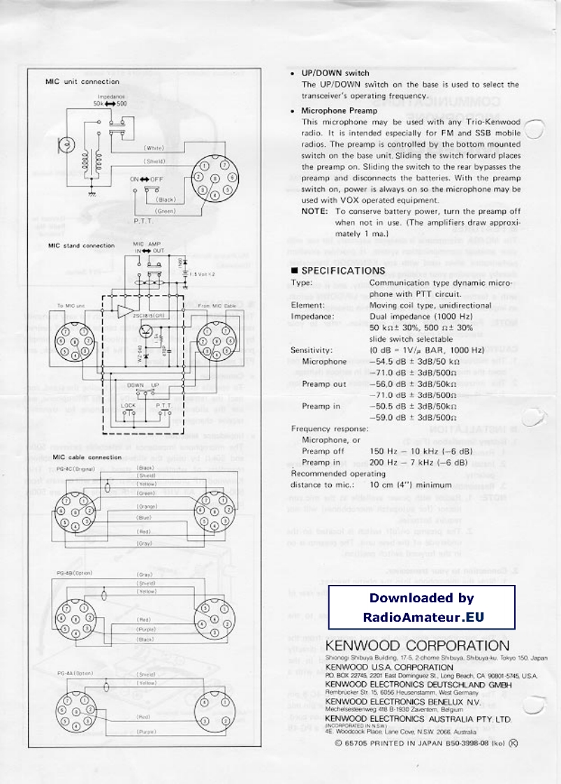 Downloaded byRadioAmateur.EUImpedance Selector--ON/OFF STBY SwitchCOMMUNICATIONSMICROPHONEMC-6▣AINSTRUCTION MANUAL-UP/DOWN SwitchConneet to■FEATURESRadio MicTerminalThe MC-60A microphone is designed expressly for use withyour amateur communication system.It provides excellentMic.Preamp Switchperformance when used with any KENWOOD transceiver,[Undersidelthereby upgrading your existing system.LOCK Switch-一PTT SwitchFig.1.The zinc die cast base offers high stability,and is completewith a feather-touch PTT switch,rocker UP/DOWN switch,an impedance selector switch and a built-in preamplifier.■OPERATIONNOTE:For UP/DOWN switch operation,refer to yourThe MC-6OA is equipped with a PTT switch for easy transmit/receive changeover.The PTT switch can be locked,if desiredtransceiver's manual.by pressing the Lock key.To unlock the switch,simplyCAUTION:press the Lock key onoe again.The Mic on/off,Lock,and1.The microphone is constructed of precision parts.Do notPTT switches are all in parallel.open the microphone,as it may result in serious damage.·Connection2.The microphone is sensitive to shock and vibration.Treat it gentlyTo operate the microphone without using the stand,con-nect the retractile cord directly to the microphone,anduse the slide-switch on the microphone for transmit/receive changeover.■INSTALLATION·Impedance selection1.Battery Installation (Fig.2)1.Remove four screws as shown.The microphone impedance is selectable between 500g2.Install two alkaline AA cells (not NiCd).Observeand 50kn by using the slide-switch on the microphonepolarity.regardless of whether the stand is used.Most Trio-3.Reassemble base unit.Kenwood HF produets are 50kn.Some will operate fromNOTE:1.Radios with power available at the mic con.500-50kn.All VHF and UHF mobile radios are 500simpedancenector (for autopatch microphones)will notrequire batteries.2.The preamp on/off switch is located on theunderside of the base unit.The preamp is onin the forward switch position.2.Connection to your transceiver.1.Slide the microphone into the plastic bracket.2.Connect the short base mounted cable to the rear ofthe microphone.3.Connect the retractile cord from the base to thetransceiver.4.The microphone may also be used separate from thebase unit.by connecting the retractile cord directlyto the mic.However,the preamp is located in thebase unit.Preamped operation is not possible with adirect transceiver hookup.5.The MC-60A is supplied with a standard PG-4C 8 pinto 8 pin retractile cord.For radios with a four pin mic.v.coconnector,use a PG-4A (4 pin to 8 pin)option cord.Nat N-CdlFor radios with a six pin mic connector,use a PG-4B(6 pin to 8 pin)option cord.Fig.2 Battery installation