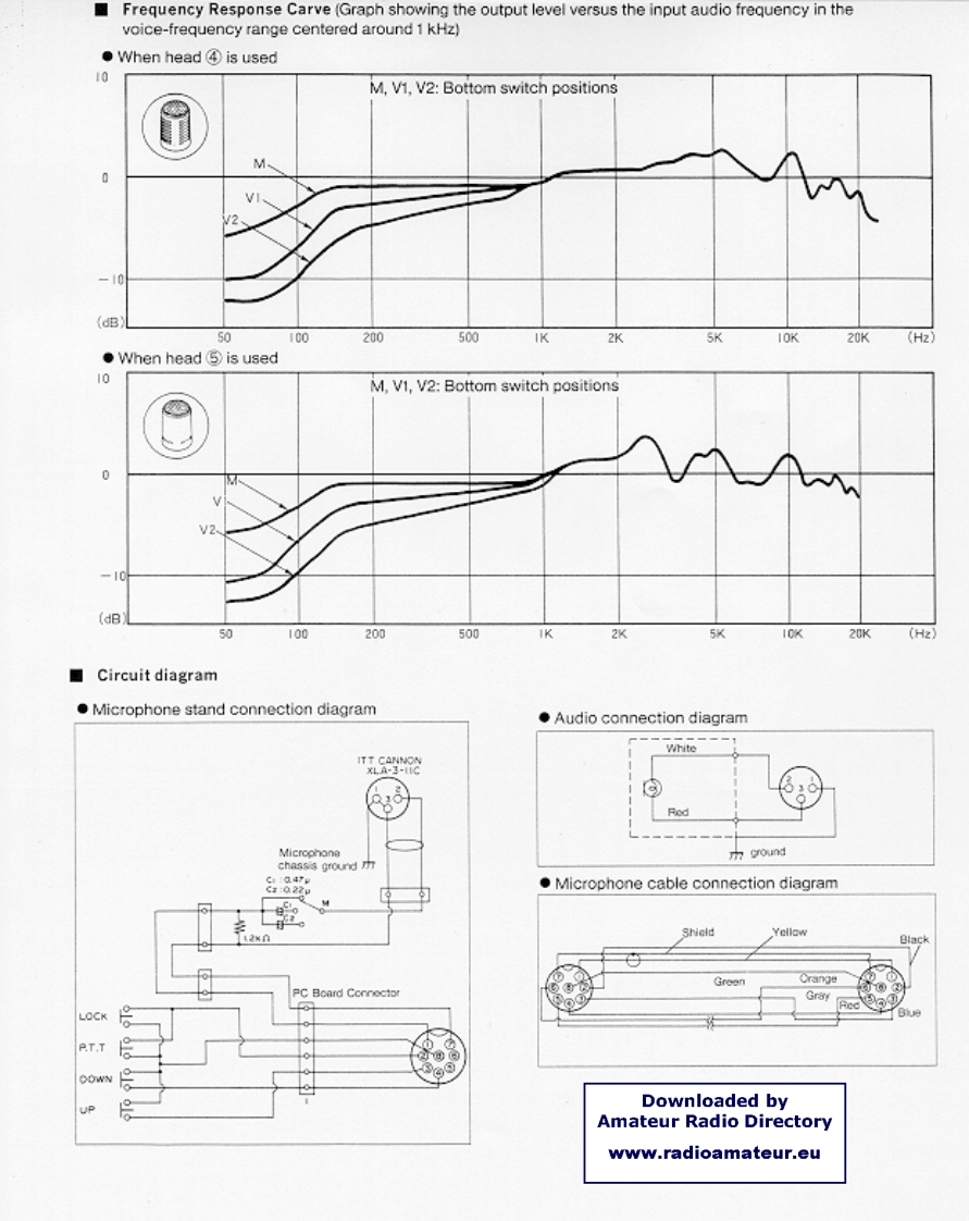DELUXE DESK-TOP MICROPHONEMC-90KENWOODKENWOOD CORPORATIONINSTRUCTIONS MANUALDownloaded byAmateur Radio Directorywww.radioamateur.euThank you for Purchasing this microphone.(MC-90)2 PTT (Push-to-talk button)The MC-90 is a high-grade microphone that contains aHold this button down to transmit.high-quality transducer element that was designed foruse with high performance audio equipment.It gives③LOCK switchunrivaled transmission sound quality when used with aPress this switch to lock the unit in the transmittransmitter equipped with DSP(digital signalmode.Press it again to return to receive mode.processing)IMPORTANT:④⑤Replacement microphone headPlease read this Instruction Manual carefully beforeYou can change the frequency response of theusing the product.microphone by changing the microphone head.(Refer to the accompanying chart for the audio■Ratingsfrequency response of each head).TypeDynamic microphone with PTT circuit⑤Bottom switchYou can change the low-frequency range responseMicrophoneMoving-coil,unidirectional type.by setting the switch to the M,V1,or V2 position.element(Refer to the accompanying chart for the audiofrequency response in each position).Impedance2500Sensitivity-78dB⑦Microphone pins(dB)(OdB=1V/BAR,1000Hz)●Pin numbers and names●Connector pin layoutDimensions90×205×176as viewed from the[mm]Pin No.Pin namefrontWeight [k g]1.1kgMICFunctions and names2PTT,LOCK④3UP4DOWN5NC6NC7MIC-GND8GNDNote:Since the MC-90 uses a transducer with a widefrequency response,it is some what less sensitivethan conventional transmitter microphones.When you③2use the MC-90,adjust the MIC control for an on-ScaleALC reading.①UP/DwN(Up/down)keyThis key increments or decrements thetransmit/receive frequency.If you hold the keydown,the frequency changes continuously.