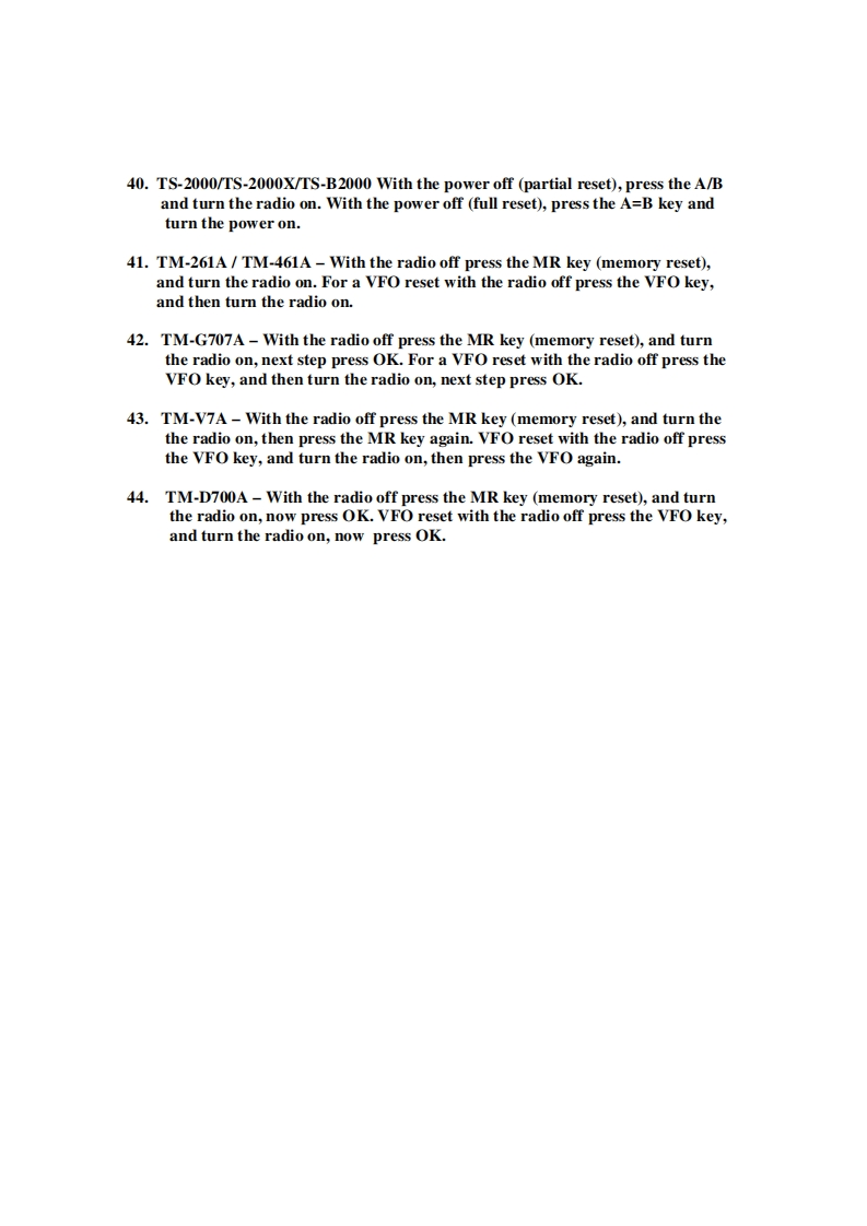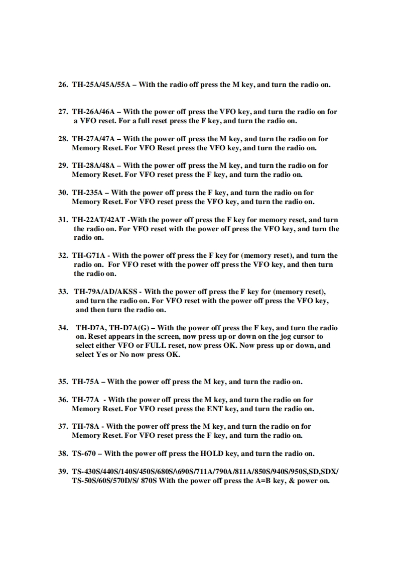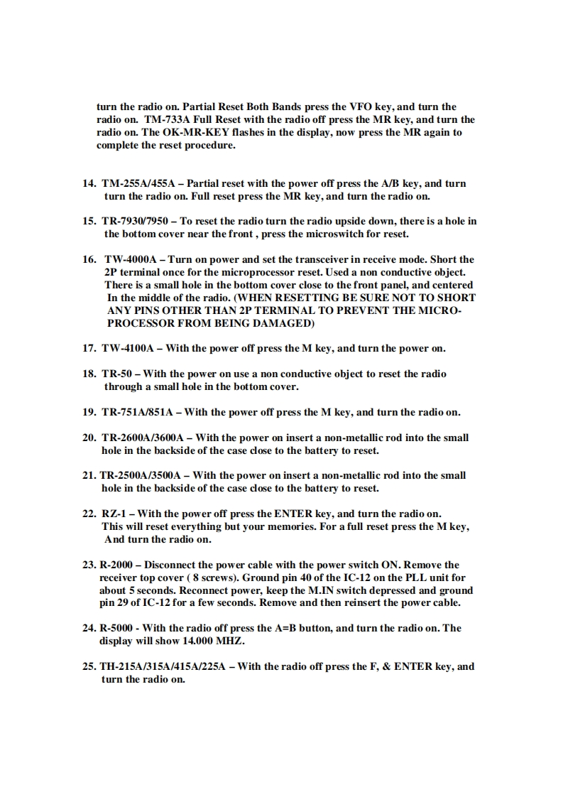 Kenwood Micro-Processor Reset Procedures1.TM-201A/401A/211A/411A-Depress the reset switch with a non conductive rodthrough the reset opening on the bottom cover.2.TM-221A/321A/421A/521A-With the power off press the VFO/M,M.IN keys,and turn the radio on.3.TM-231A/331A/431A/531A-With the power off press the MR key,and turn thepower on.4.TM-241A/441A/541A-With the power off press the MR/M key,and turn thepower on.5.TM-2530A/2550A/2570A/3530A-With the power off press the PS key,and turnthe power on.6.TM-701A-With the power off press the MR key,and turn the radio on.7.TM-621A/721A -With the power off press the F key,and turn the radio on.8.TM-631A/731A-With the power off press the MR key,and turn the radio on.9.TM-641A/741A/941A With the power offA.VFO Reset Individual Band:Press the VFO key,the Band Sel,and turn theRadio on.B.All Band VFO Reset:Press the VFO key,and turn the radio on.C.All Band MEMORY Reset:Press the MR key,and turn the radio on.D.Individual Memory Band Reset:Press the F key,BAND SEL key,and turnthe power on.10.TM-642A/742A/942A-With the power offA.VFO Reset Individual Band:Press the VFO key,the Band Sel,and turnthe radio on.B.All Band VFO Reset:Press the VFO key,and turn the radio on.C.All Band MEMORY Reset:Press the MR key,and turn the radio on.D.Individual Memory Band Reset:Press the F key,BAND SEL key,andTurn the radio on.11.TM-251A/451A With the radio offA.Partial reset press the VFO key,and turn the radio on.B.Full reset press the MR key,and turn the radio on.12.TM-732A-VFO Reset with the power off press the VFO key,and turn the radioon.Memory reset with the power off press the MR key,and turn the radio on.13.TM-733A-Partial Reset-single band press the VFO,BAND SEL key,and
