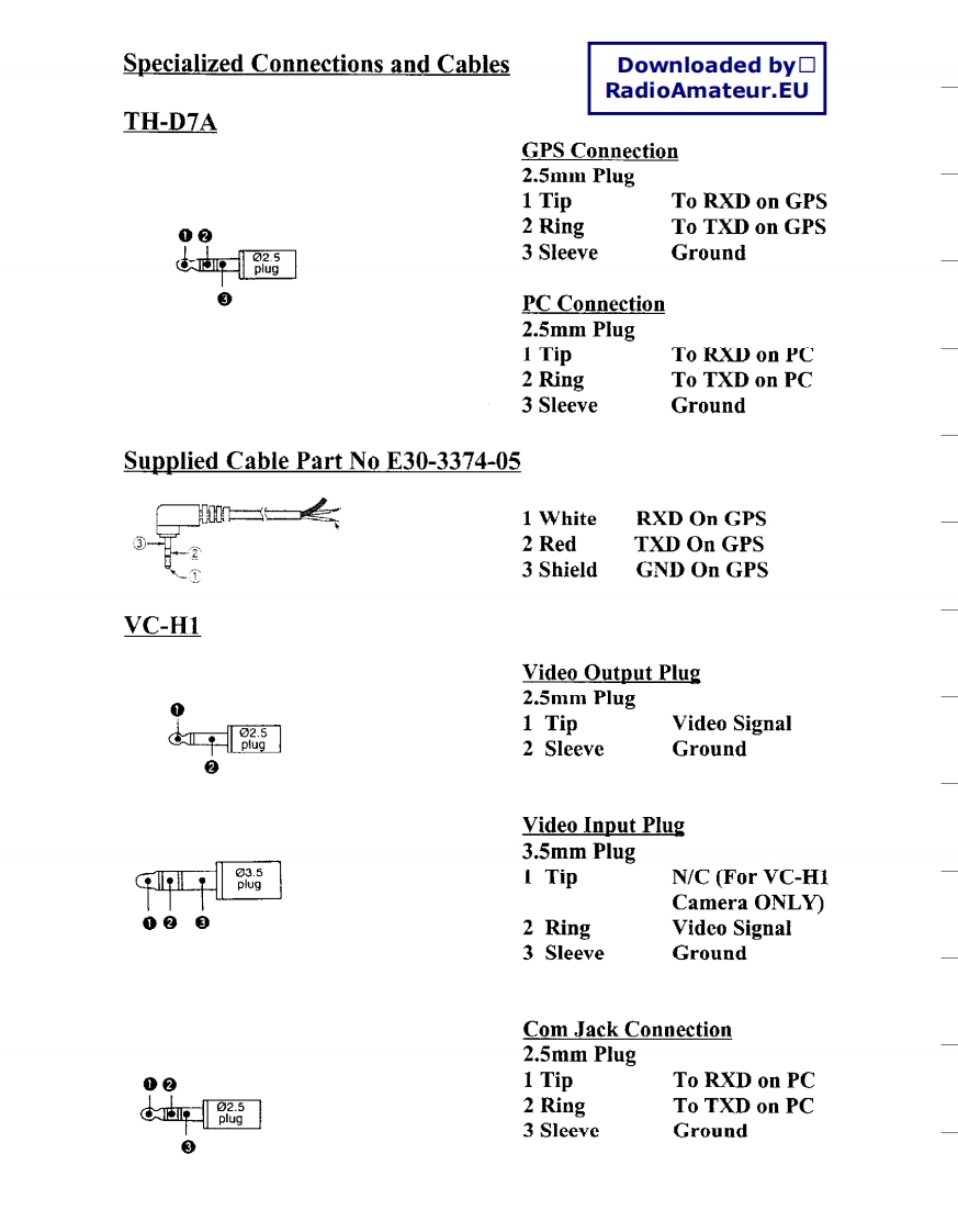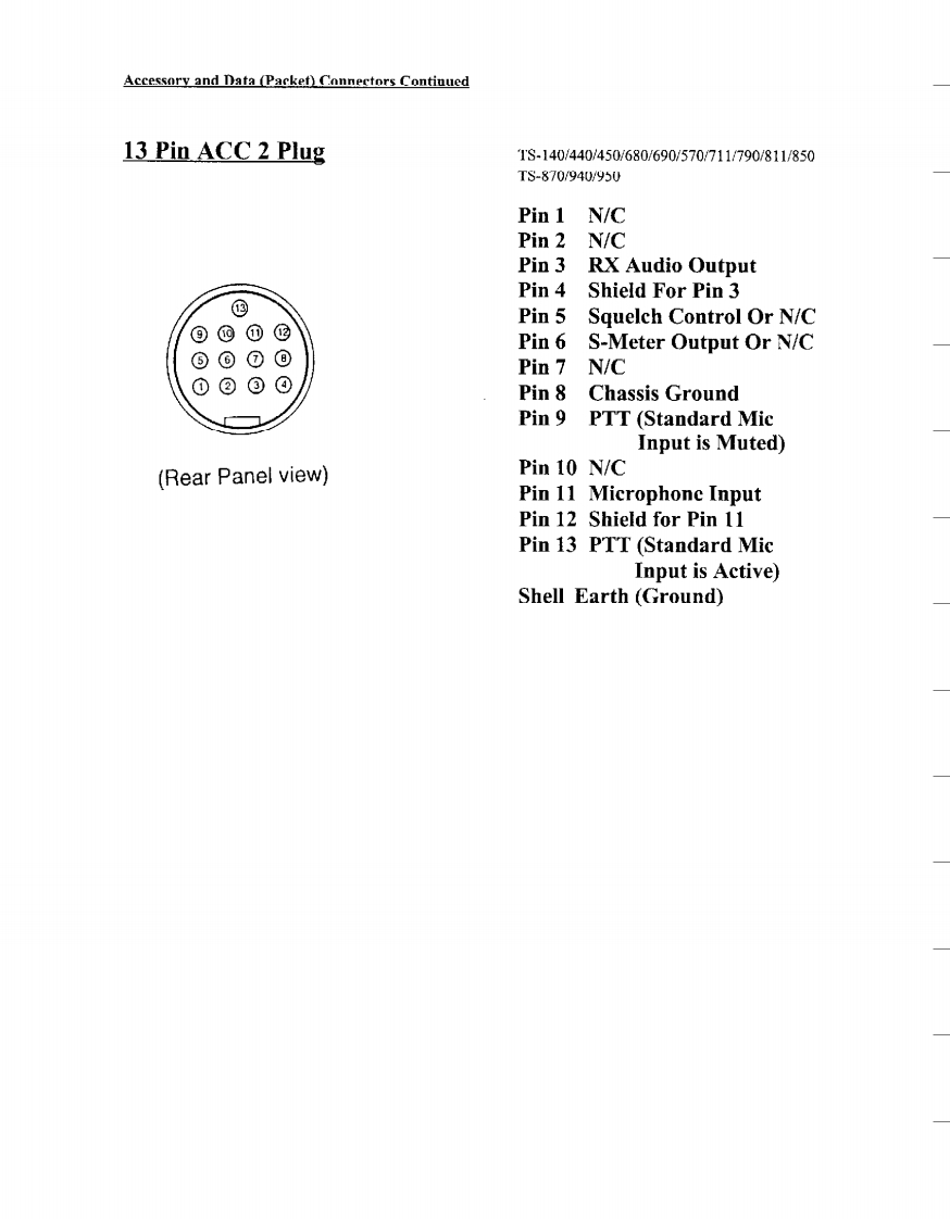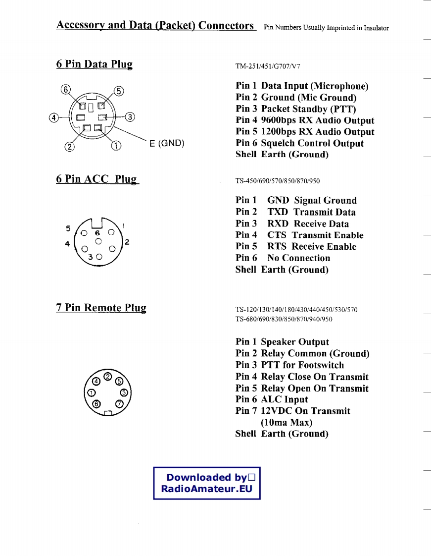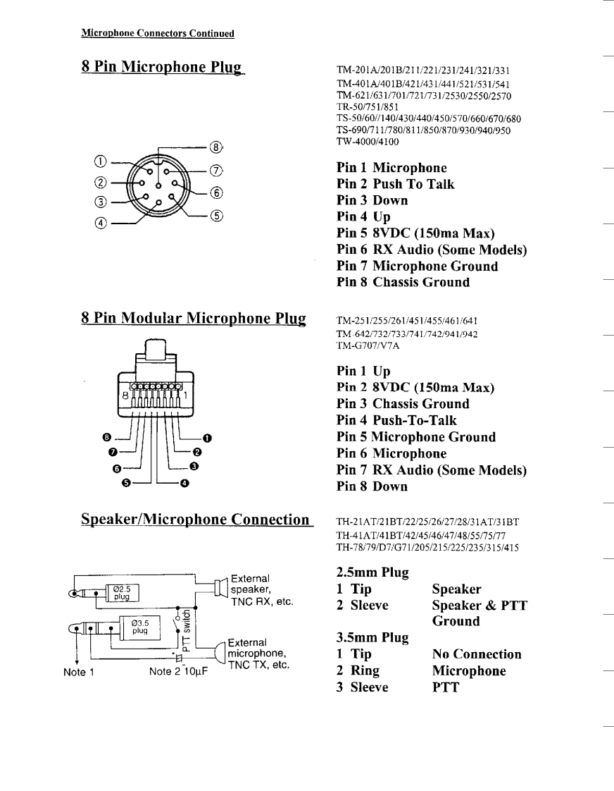 Downloaded by□KENWOODRadioAmateur.EUAmateur Radio DivisionSubject:Miscellaneous ConnectorsDate:January 26,1999This information is provided "as is,"and is subject to change without notice.Kenwood Service Corporation makes no warranty of any kindwith regard to this information,Including,but not limited to the implied warranties of merchant ability and fitness for a particular purpose.Kenwood Service Corporation shall not be liable for any error or for incidental or consequential damage in connection with the furnishing.performance,or use of this information.Microphone Connectors Pin Numbers Usually imprinted in Insulator4 Pin Microphone PlugTR-7200A7400A7500TS-120S/130S/180S/511S/520/530/600/700,820830Pin 1 Microphone32Pin 2 Push To Talk4Pin 3 Chassis GroundPin 4 Microphone Ground5 Pin Microphone PlugTR-7600/7625Pin 1 MicrophonePin 2 Push To TalkPin 3 No ConnectionPin 4 Chassis GroundPin 5 Microphone Ground6 Pin Microphone PlugTR-7730/7800/7850/7930/7950/8400,900091309500Pin 1 Microphone③Pin 2 Push To TalkPin 3 Down②Pin 4 UpPin 5 8VDC (150ma Max)Or N.C.Pin 6 Chassis Ground