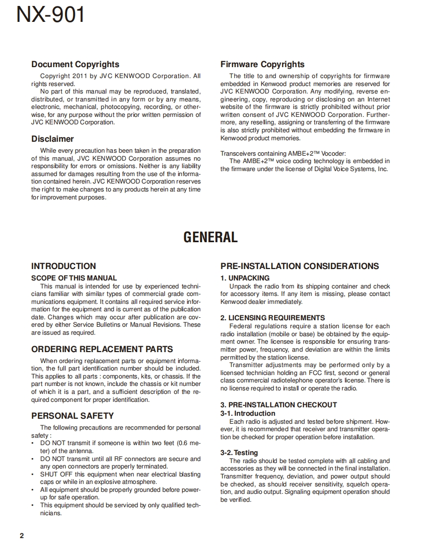 900MHz DIGITAL TRANSCEIVERNX-901KENWOODJVC KENWOOD CorporationSERVICE MANUAL2011-12 PRINTED IN JAPANB53-7003-00Y0330Metallic cabinetKey topPanel assy(A01-2194-11)K29-9401-03)(A62-1162-12)Modular jack(E58-0522-05KENWOODPacking (Phone jack)(G53-1616-03)@ACC」Packing (D-sub outer)(G53-1626-03)RF coaxial receptacle(N)(E04-0170-15DC cord (Pig tail)(E30-7520-25)CONTENTSGENERAL2ADJUSTMENT.4SYSTEM SET-UP.....4TERMINAL FUNCTION.6REALIGNMENT5PC BOARDINSTALLATION7DISPLAY UNIT(X54-3680-10).....72DISASSEMBLY FOR REPAIR..............14TX-RX UNIT(X57-8060-12)(AW2)..74CIRCUIT DESCRIPTION.........17TX-RX UNIT(X57-8060-12)(B/2)...78COMPONENTS DESCRIPTION...........23INTERCONNECTION DIAGRAM.............79PARTS LIST..26SCHEMATIC DIAGRAM80EXPLODED VIEW............39LEVEL DIAGRAM...96BLOCK DIAGRAM......98TROUBLE SHOOTING...41SPECIFICATIONS.......103LFThis product complies with the RoHS directive for the European market.This product uses Lead Free solder.