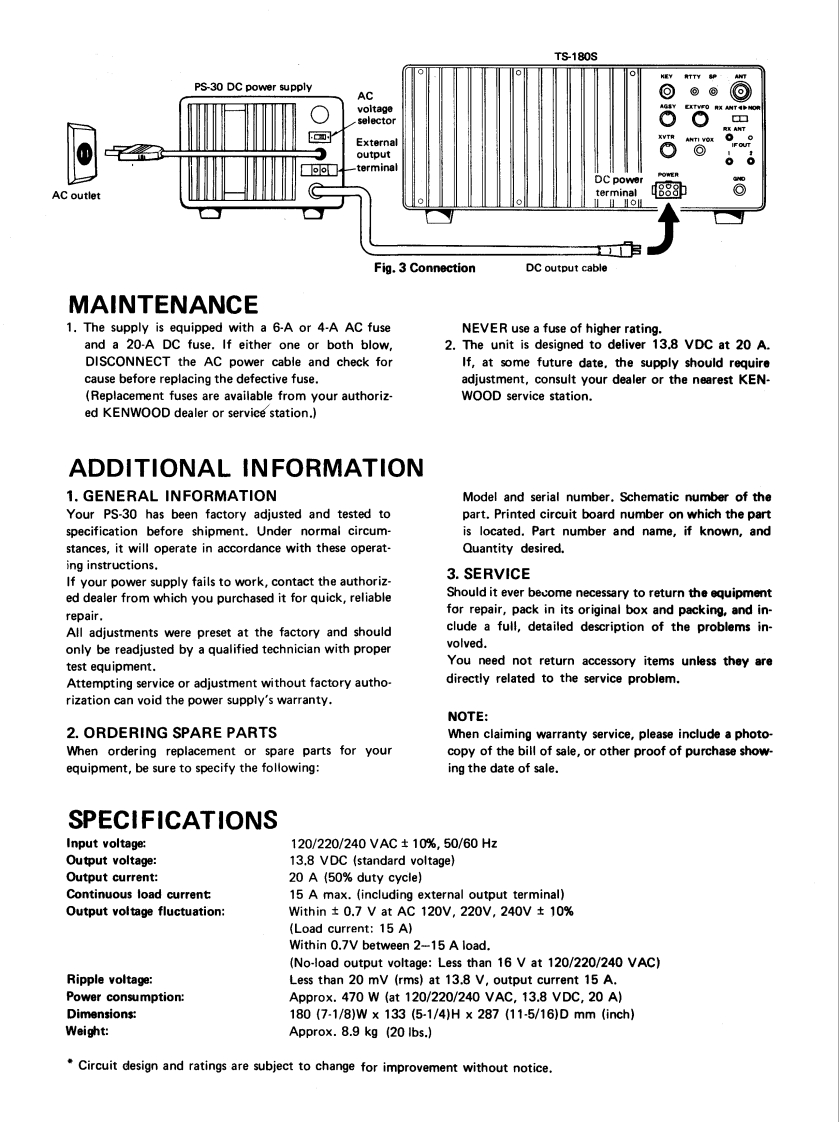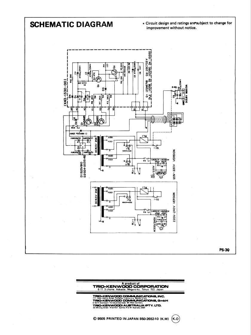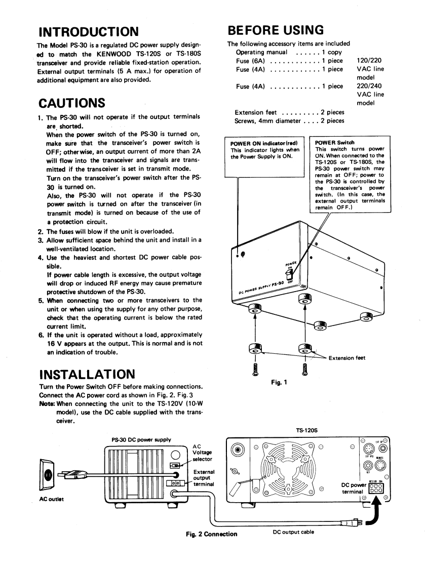 KENWOODDC POWER SUPPLYPS-30OPERATING MANUALThe PS-30 DC Power Supply has been carefully engineered andmanufactured under rigid quality standards,and should give yousatisfactory and dependable operation for many years.Before placing the equipment in service,we suggest you readthrough this operating manual to become acquainted with correctoperation.Should any trouble arise with the unit,please contact your dealer,or the nearest KENWOOD.service facility,or the factory servicefacility.NOTE:There are two versions of the PS-30;a 120/220V line model and a 220/240V linemodel.AFTER UNPACKINGSave the boxes and packing in the event your unit needs to betransported for temporary operation at a remote location,main-tenance,or service.