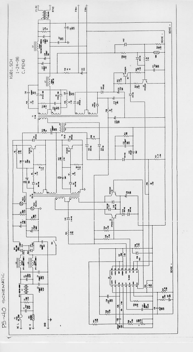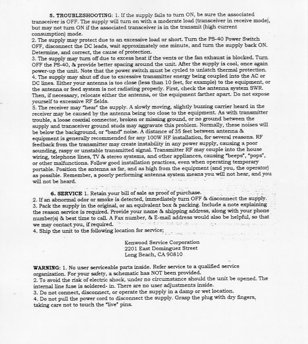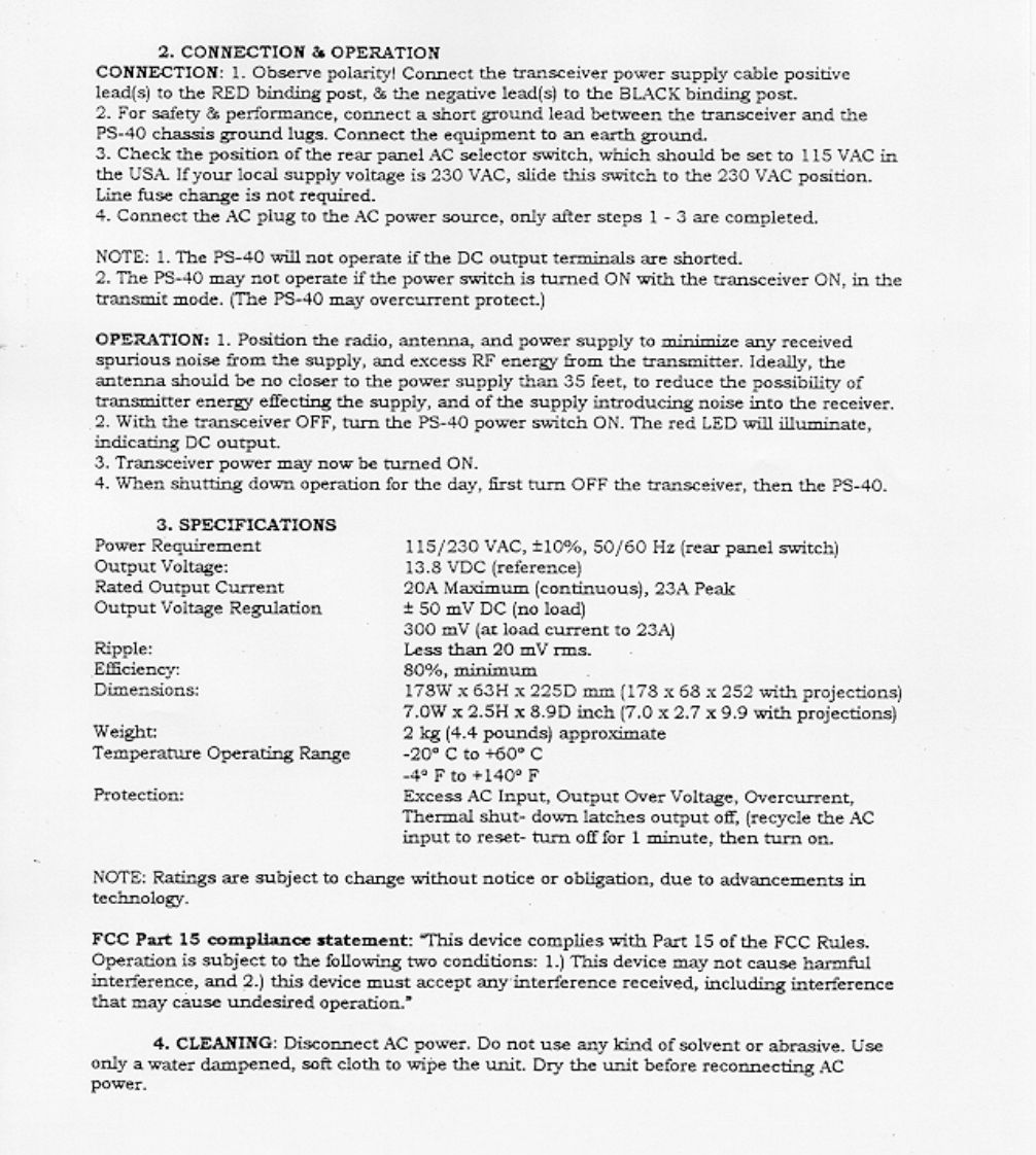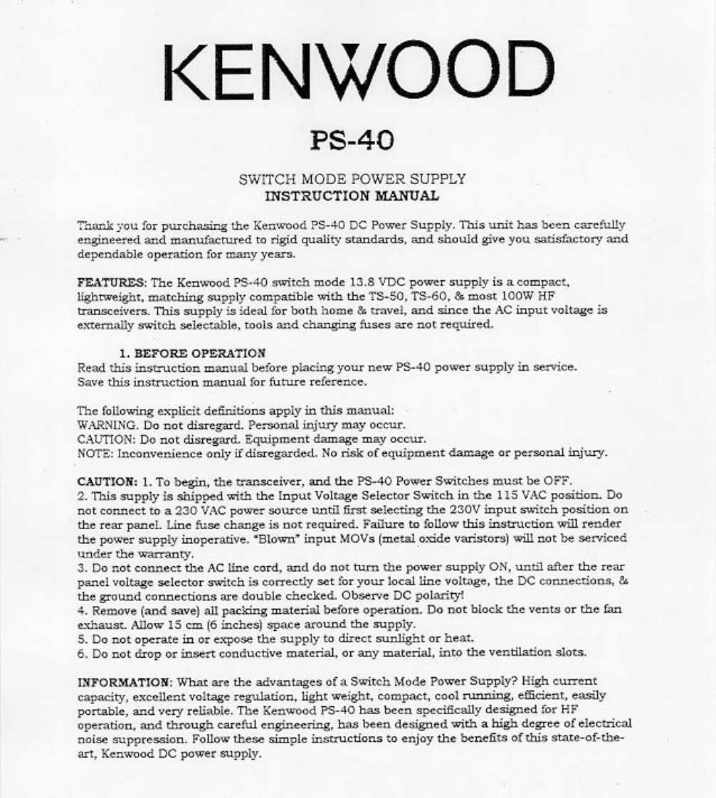 SUPER Small and LightweightSwitching Power SupplyKenwood PS-40Kenwood is pleased to announce a new switching power supply,model PS-40Rated at 23 amps,a size similar to the TS-50S,and weighing 4.5 pounds,the PS-40is ideal for use in the home or on the road.The primary input voltage is easilychanged from 115V to 230v by an external switch-great for trips abroad.The PS-40 is the result of Kenwood's demanding requirements for high reliability,low noise,and the desire to have a companion supply for the TS-50S.Look atthese specifications!KENWOODKenwood PS-40Size:7/h6”Wx23/a”Hx87Ie”D(2'/h6”H with feet)matches TS-50S,TS-60SWeight:4.5 pounds0 A Minimum,20 A Maximum(continuous),23 A PeakInput Voltage:115/230 VAC,+-10%,50/60 Hz,Rear-panel Switch SelectableOutput Voltage:13.8V +-50mV DCRegulation 300 mVRipple:Less than 20mV rmsStability:+-2.0%Efficiency:80%,minimumProtection:AC input over voltage,AC input fuse,output over current,andover voltage,thermalOvershoot:No overshoot at power turn on or turn offOperating Range Temperature:-20C to +60CBearing fan mounted on rear panelAvailable At Your Kenwood Amateur Radio Dealer!KENWOODKENWOOD COMMUNICATIONS CORPORATION96660