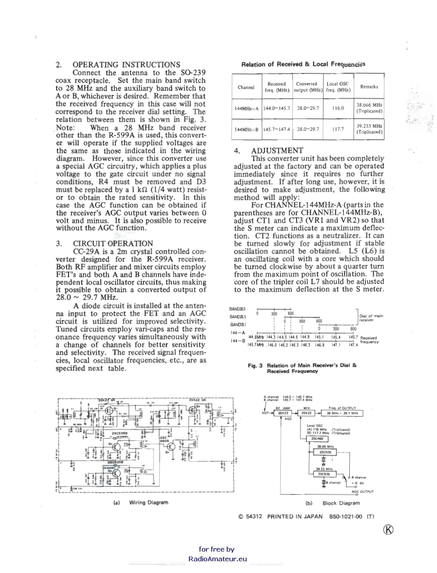 KENWOODCC-29A2m CRYSTALCONTROLLED CONVERTERR-599A INSTALLATIONINSTRUCTIONSManufactured byTRIO ELECTRONICS,INC..TOKYO.JAPAN1.INSTALLATIONPrior to installation,check whether thepackage contains the following accessories:SO-239 coax receptacle...........IResistor(1kn,1/4W)..·.·.JScrews(3X6)...,.....·.·...,6Nuts.·Hexagonal bushings.,,··,··Mount the printed board of the 144MHz crystal converter in position on the topof the R-599A receiver chassis.This can bedone by merely opening the top lid of thecabinet,but work will be easier if this cab-inet is dismantled in advance.Then removethe blanking plate of the 144 MHz ANTAN-NA hole on the rear panel.Insert the SO-239coax receptacle in this hole.A coaxial cableis connected to terminals I and 2 of theFig.1 External View of CC-29Aprinted board.Connect the other end of thiscable with the receptacle by soldering.Installation is finished when the MT7 pinplug has been inserted in J1 of the fixedchannel unit (X50-1140-10).NutMount withSolderscrewCoaxial cableMount withscrewReceptacleRear panelMT7 pin plug tofixed channel unit(X50-1140-101J1Mount withHexagonalHexagonalbushingP.C.boardscrewbushingFig.2 Mounting of P.C.Board Receptaclefor free byRadioAmateur.eu