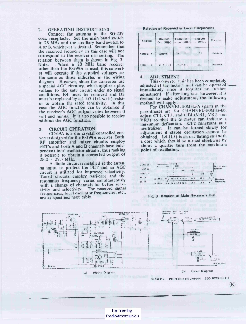 KENWOODCC-69A6m CRYSTALCONTROLLED CONVERTERR-599A INSTALLATIONINSTRUCTIONSManufactured byTRIO ELECTRONICS,INC.,TOKYO,JAPANH国E国图国a国国s用周3B1.INSTALLATIONPrior to installation,check whether thepackage contains the following accessories:SO-239 coax receptacle,,,,,,,,.··1Resistor (I k,1/4W)...........IScrews(3X6)....,...,.,,,··Nuts·3Hexagonal bushings.Mount the printed board of the 50 MHzcrystal converter in position on the top ofthe R-599A receiver chassis.This can bedone by merely opening the top lid of thecabinet,but work will be easier if this cabi-net is dismantled in advance.Then removethe blanking plate of the 50 MHz ANTEN-NA hole on the rear panel.Insert the SO-239coax receptacle in this hole.A coaxial cableis connected to terminals I and 2 of the print-ed board.Connect the other end of thiscable with the receptacle by soldering.Fig.1 External View of CC-69AInstallation is finished when the MT7 pinplug has been inserted in J2 of the fixedchannel unit (X50-1140-10).NutMount withSolderscrewMount withCoaxial cablescrewReceptacleMT7 pin plug toRear panelfixed channel unitHexagonal(X50-1140-101J2Mount withHexagonabushingP.C.boardbushingscrewFig.2 Mounting of P.C.Board Receptaclefor free byRadioAmateur.eu
