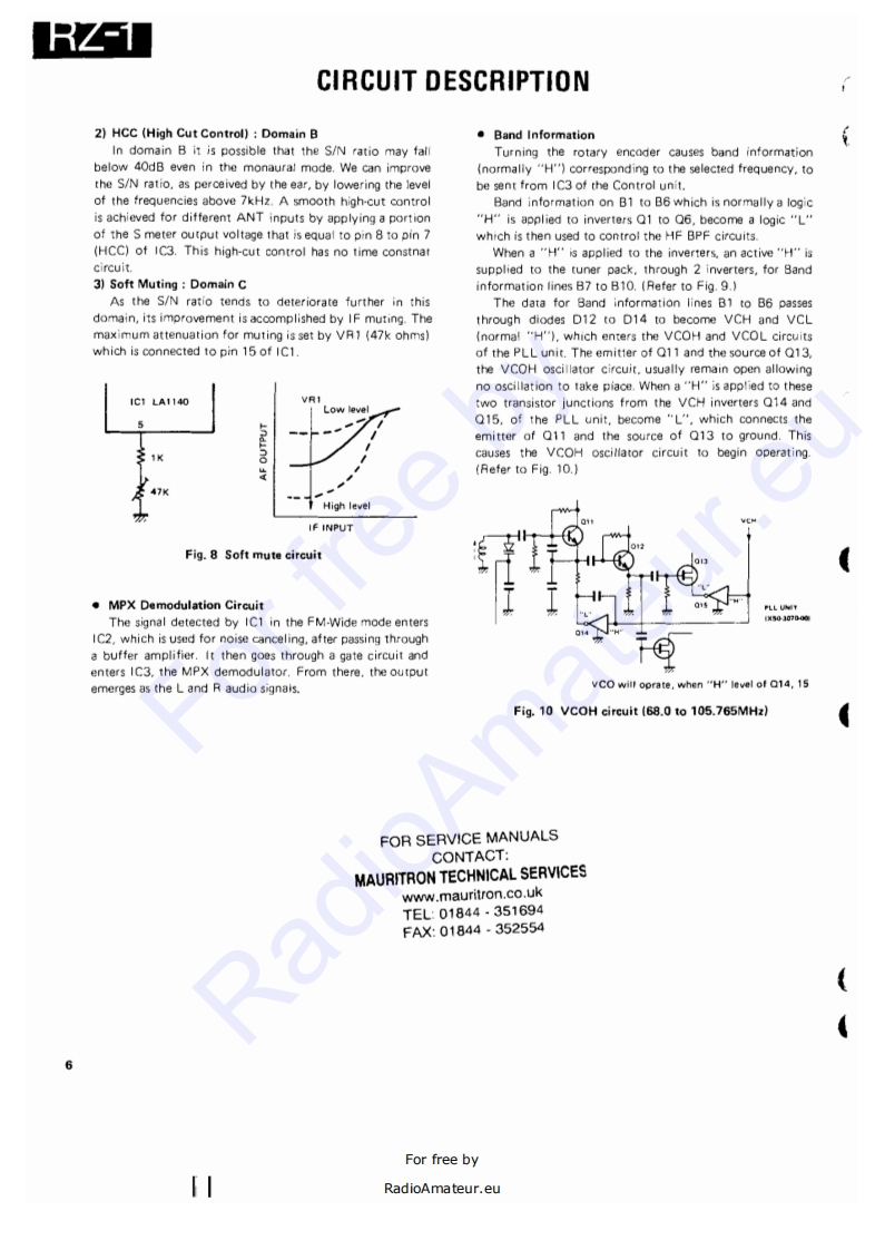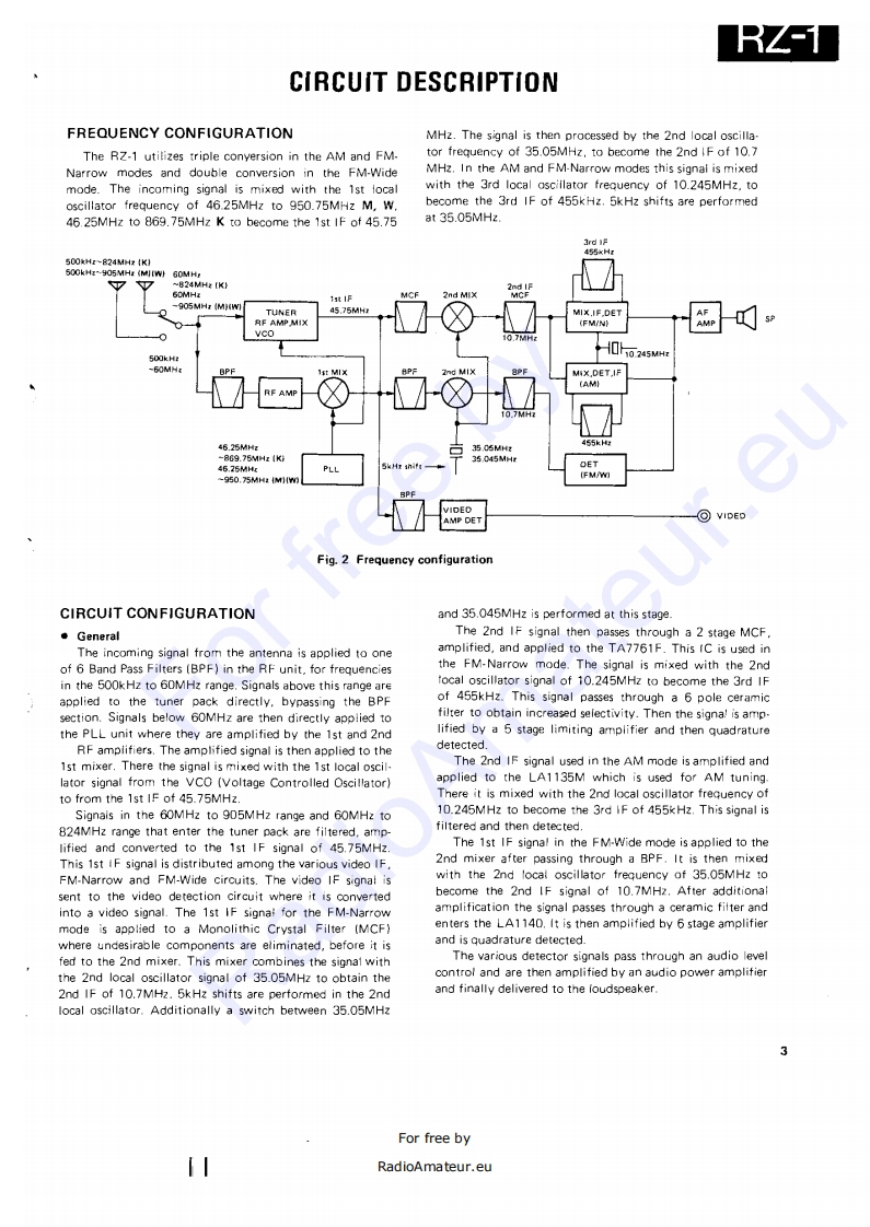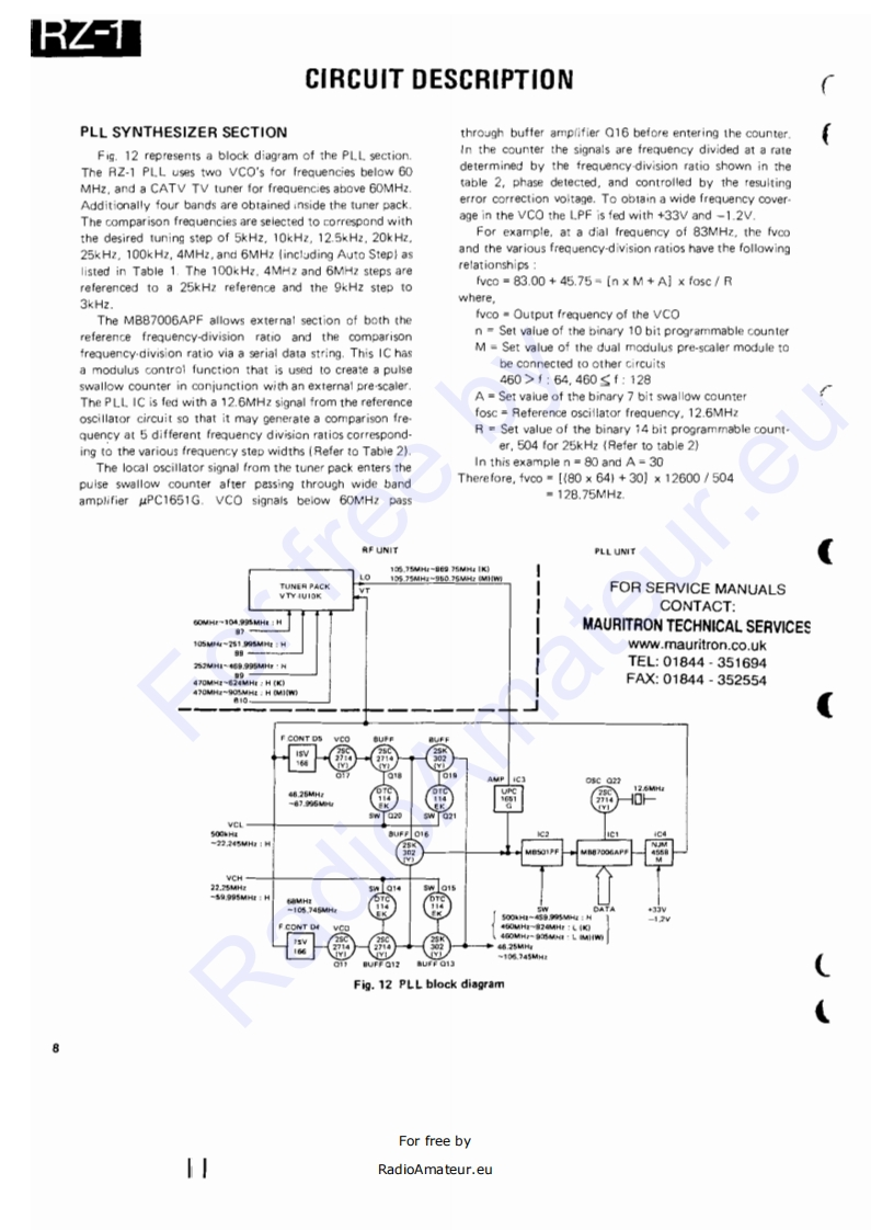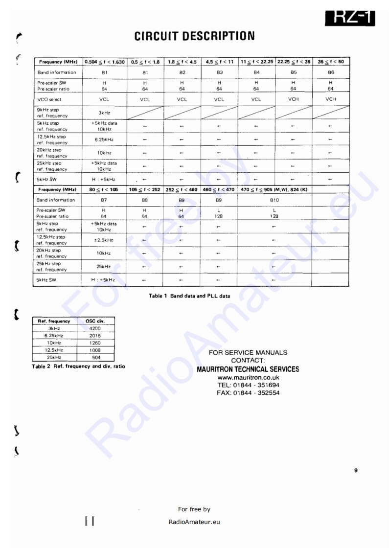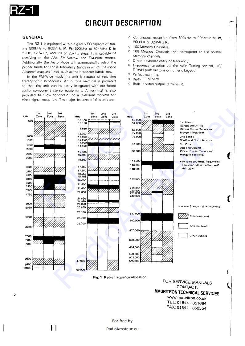 WIDE BAND RECEIVERRZ-1KENWOODSERVICE MANUALC1988-1 PRINTED IN JAPANB51-3438-00(0)577Knob (VFO/M.CHSCAN)PanelMetailic cabinet (TOP)Knob (M)Knob (ENTER)Knob (C)(K29-3118-08)x2(A20-26420B)(A01-104402)(K29.3131081K29-3136-081K29.3134-08Knob IVOL,SQL)Knob (MAIN)Front glassKnob (S.SEL)Knob (STEP]Knob【MODE」Knob I8EEP)K29-3107-041x2K293106-041(B10-1104-08)(K29-313208}{K29-3130-08)K29-313308)(K29.3139-08)Phone jack (3.5D)Knob)Knob (1)Knob (3)Knob (8)Knob (0)【E11-0430-051(K293138-08)(K29-3121-08】(K29-312308】K29-3128-08(K29-3120-08】Knob (MSG)Knob]Knob (2)Knob (4)Kncb【7)Knob (9)(K29-3119-08)(K29-3137-081(K29312208)K29-3124-081K29-3127081K29-3129-08】(K29-3125-081 K29-3126-08)FOR SERVICE MANUALSKnob (5)Knob (6)CONTACT:MAURITRON TECHNICAL SERVICESwww.mauritron.co.ukTEL:01844.351694FAX:01844-352554CONTENTS一CIRCUIT DESCRIPTION····1F(X59-3140-001,,·,,,···,···+·····53SEMICONDUCTOR DATA..................15SQL(X59-3150-001,,··53DESCRIPTION OF COMPONENTS.,,..,.·.·,18SM1X593380-00)...,.,···············53PARTS LIST ...........................211 F UNIT(X48-3040-XX)...·.:·54DISASSEMBLY.…39PLL UN1T(X50-3070-00),..,.··..,·····,56PACKING.,,,,,,,,,,,,,,·······41RF UNIT{X44.3050-00158ADJUSTMENT,,,,,,····42SCHEMATIC DIAGRAM,·····,·,··,·,,·····59PC BOARD VIEWS/CIRCUIT DIAGRAMBLOCK DIAGRAM,,。””63DISPLAY UN1T(w02-0811-08)...,.,..,,,,,47LEVEL DIAGRAM.··65C0NTR0LUNT{X53-3110-XX).....,.·48TERMINAL FUNCTIONS...................66FMMP×X58-3310-11.·51SPECIFICATIONS,..,.,.·..··BACK COVERFor free byRadioAmateur.eu
