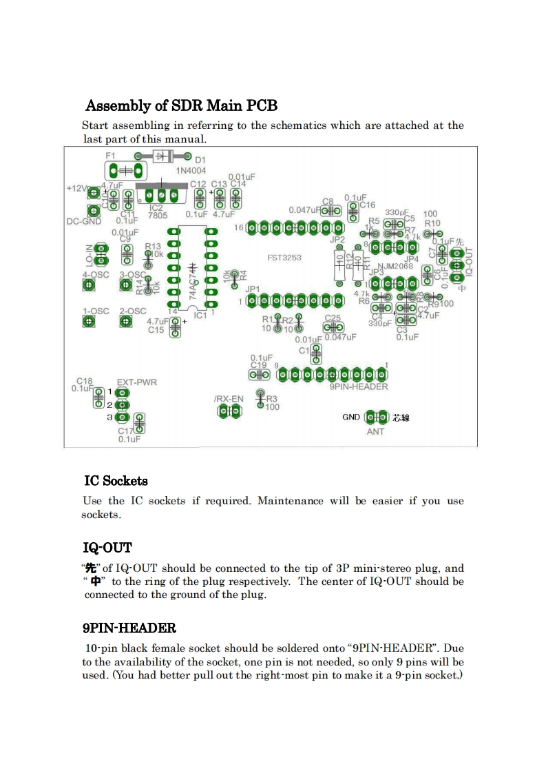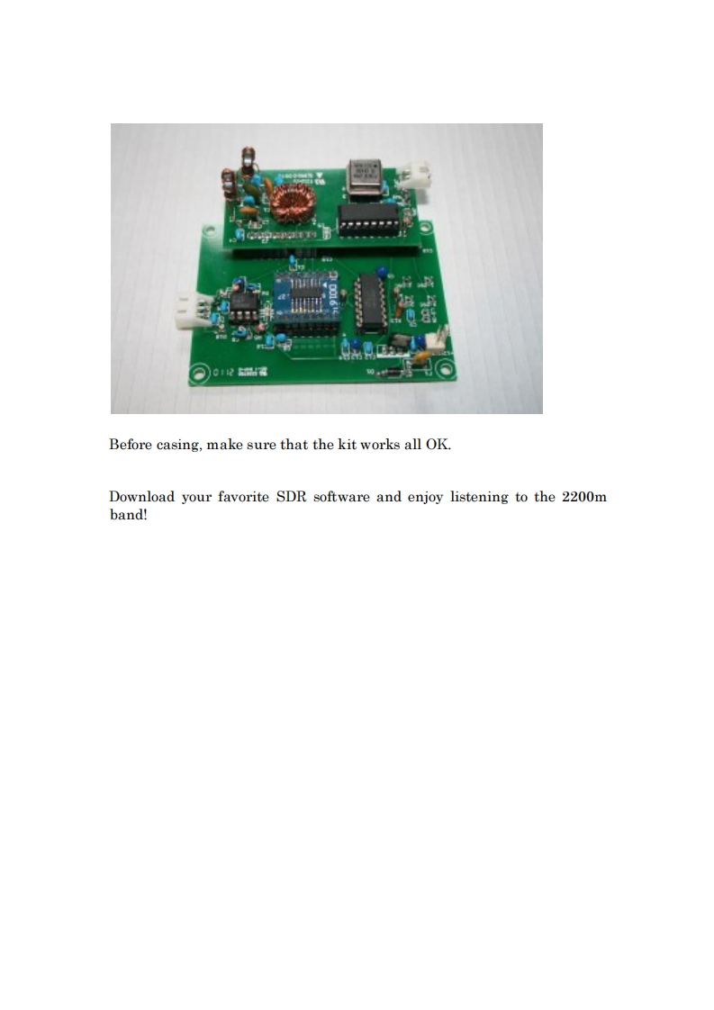Assembly Manual for ISDR-136-KITICAS EnterprisesLast Updated March 21*,2012This SDR receiver kit is intended for the 136kHz band.The kit utilizesDIP IC components (no SMD)so that even a beginner can assemble the kitin a few hours.(FST3253 is converted to DIP as shipped,so you don't needto train yourself how to solder SMD.)The kit consists of an SDR mainPCB and an I/F PCB for your easier assembly.Specifications:RX Coverage:106kHz~154kHz (when a 48kHz sound card is used.)SDR Center Freq.:130kHz(8.32MHz÷16÷4)Operational Voltages 9VDC~13.8VDC(The white connectors are not included in the kit.If needed,please prepareat end user's end.Case HistoryThe built receiver has been used to run a 137,777kHz grabber at:http://icas.to/argo