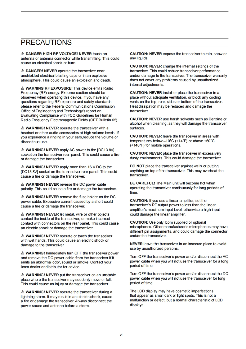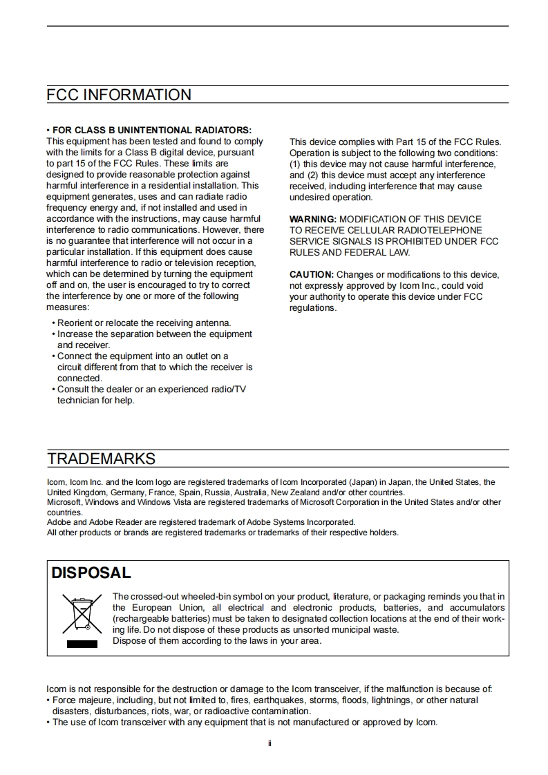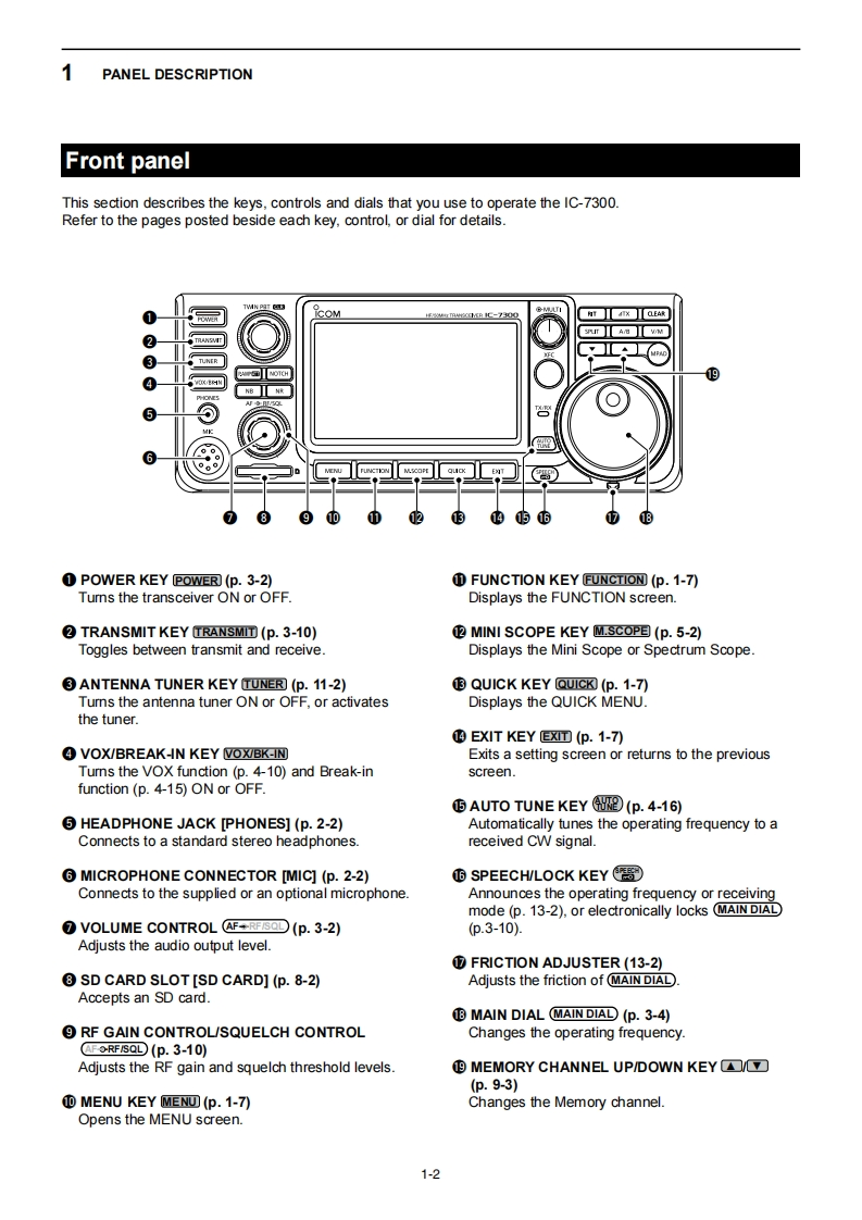 icomFULL MANUALINTRODUCTION1 PANEL DESCRIPTION2 INSTALLATION AND CONNECTIONS3 BASIC OPERATION4RECEIVING AND TRANSMITTINGHF/50 MHz TRANSCEIVER5SCOPE OPERATION1c-73006VOICE RECORDER FUNCTIONS7VOICE TX MEMORY OPERATION8 USINGAN SD CARD9 MEMORY OPERATION10 SCANS11 ANTENNA TUNER OPERATION12 SET MODE13 OTHER FUNCTIONS14 MAINTENANCE15 UPDATING THE FIRMWARE16 SPECIFICATIONS17 OPTIONS18 CONNECTOR INFORMATION19 CONTROL COMMANDINDEXABOUT CEIcom Inc.