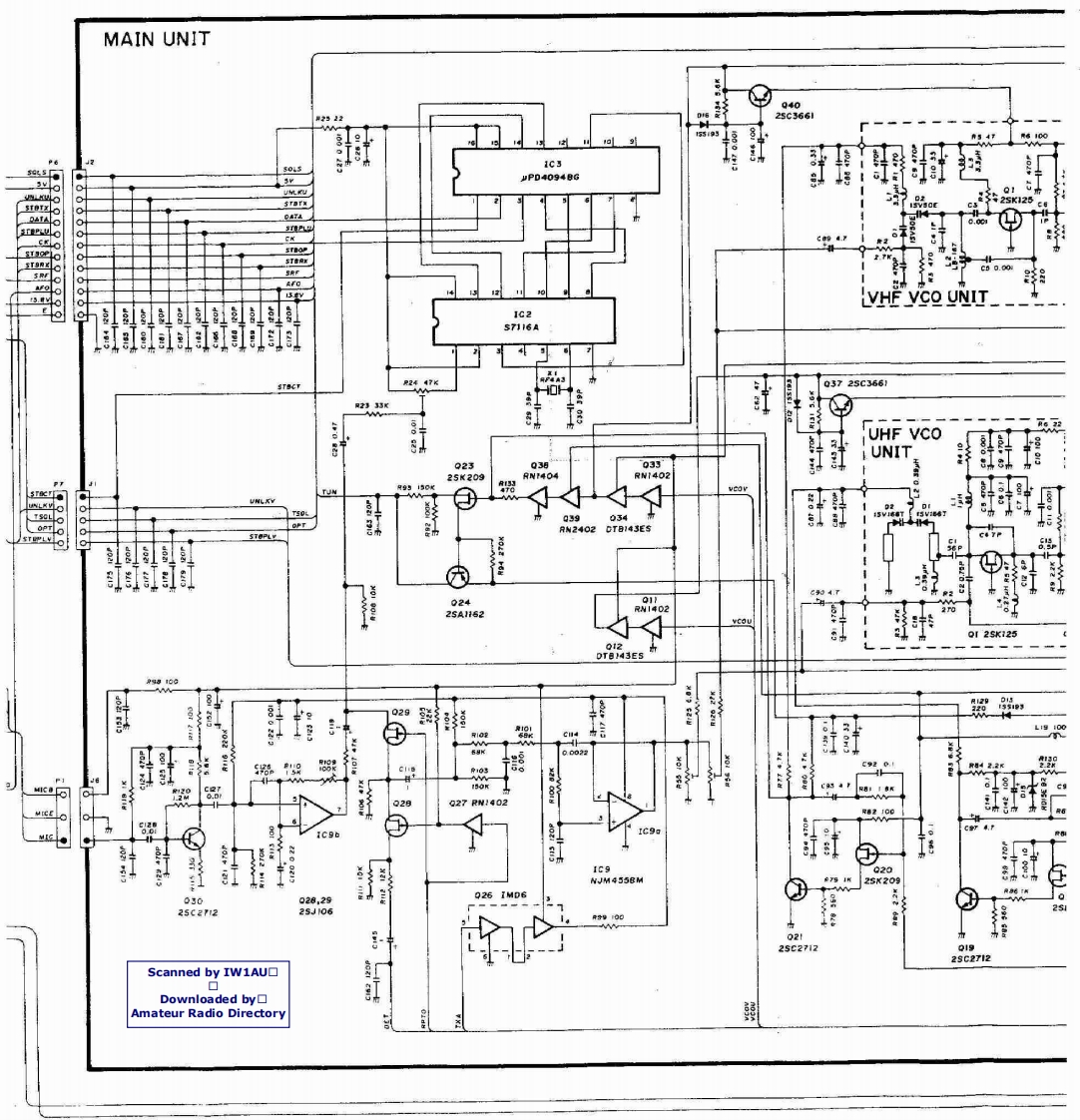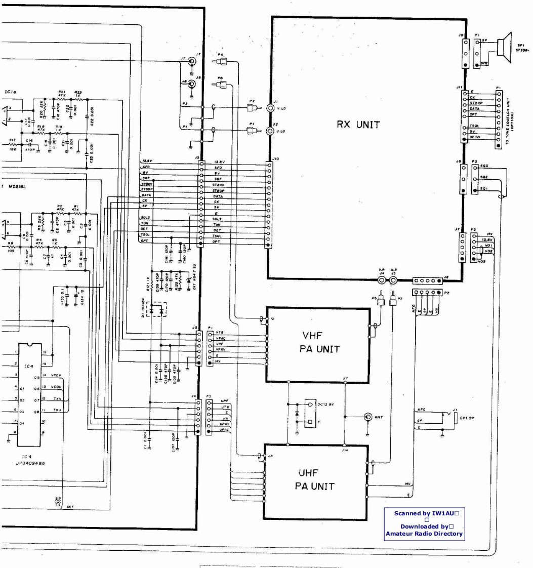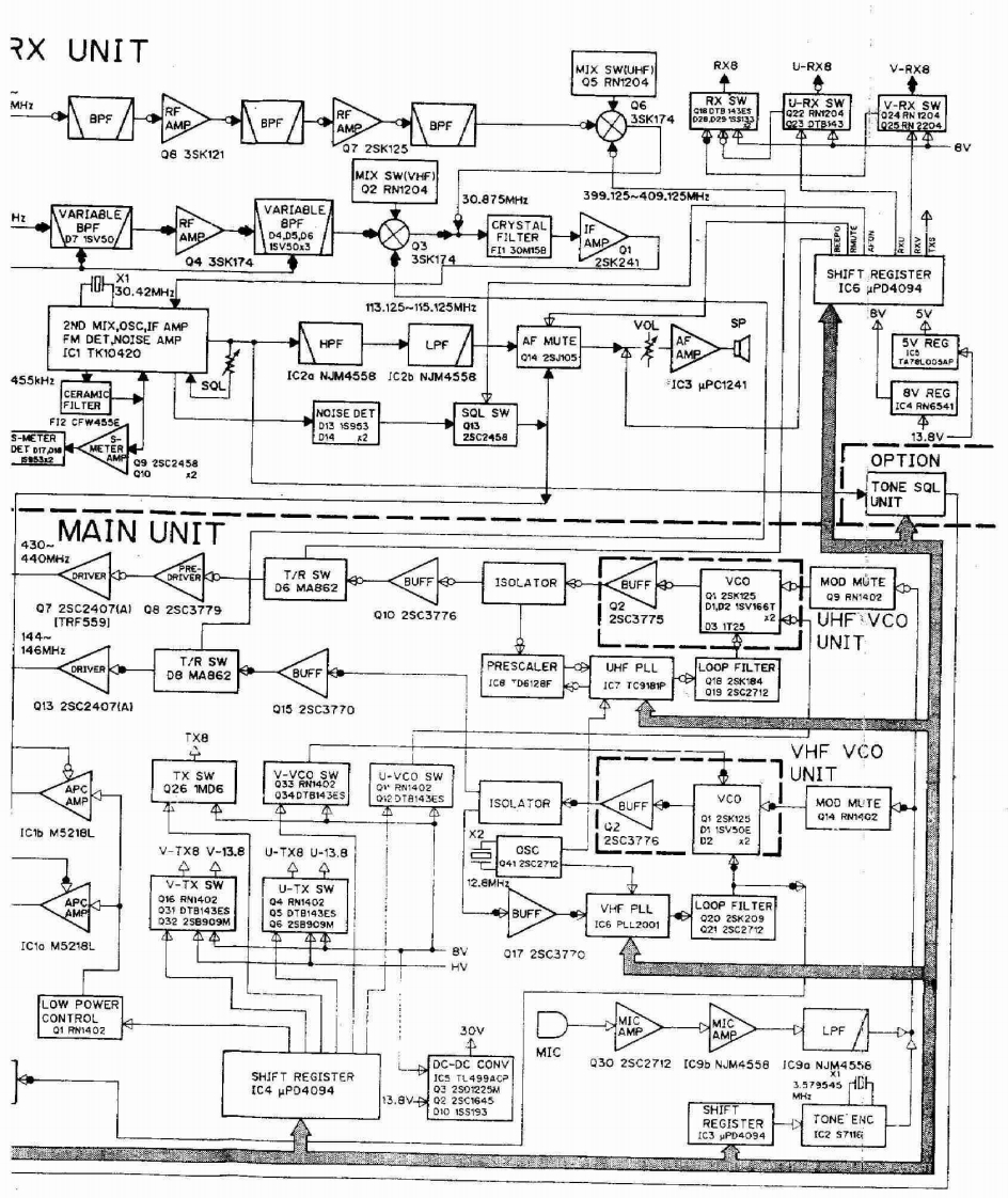 BLOCK DIAGRAMScanned by IW1AU▣Downloaded by▣PA UNITAmateur Radio DirectoryRXUNITANT430-440MH2r/AMe0B3SK121MIX21430-~440MHz144-440-450MHIU.S.A146MHzVARIABLEVARIABLEBPFBPFAMP0405.D6ANT SWD7 I5VSOHPF5V0x3LPFD5 MJ407LPFPAD71C2$C-1027Q43SK174A030.42M4X113RF DETAPC2ND MIX,OSC.IF AMPD615S990425A1345Q32sA1359FM DET,NOISE AMPHPFIC1TK10420455kHzIC2a NJM4558SOL144-146MHzCERAMIC140-150MHu.S.A)FILTERNOISE DETFI2 CFW4556D131s953LPFANT SWPAS-METERD142D2M407METER04x2rc1sC-1019DET0925C245日0102RF DETD315599APC8225A345Q12SA1359MAIN UNIT430m440MHzPRET/R SWD6 MA862Q72sC2407A」Q82SC3779ITRF559)144146MHzLOGIC UNITT/R SWCRIVERD8 MA862BUFF0132SC2407a10152SC3770LCDDS1 LCD-981tTX8DIM CTRLTX SW5服Y08.Q9RN2404APCQ26 IMD6002sC2712034DTB143ES0H25B799LAMPD2015187IC1b M5218LV-Tx8V-13.8U-TX8U-13.8RESETA344V-TX SW6322r08U-TX SWAPC016RW140204RW14024.194304S/RF METERAMP031DT日143EsD5DT日43EsMH2Q322sB909WD6256909MIC3 LA6393M本车对1C13M5218LSENSORCPUIC1PD75308LOW POWERCONTROL—TXBATTINITIAL01 RN402MATRIX一RXTXMIC UP/DN30v-DC AMPSHIFT REGISTERO UHF8846Q2328K209Q2425A162IC4uP04094VHFSW MATRIXCK-DATA-STBPTT01225C27120211s5193