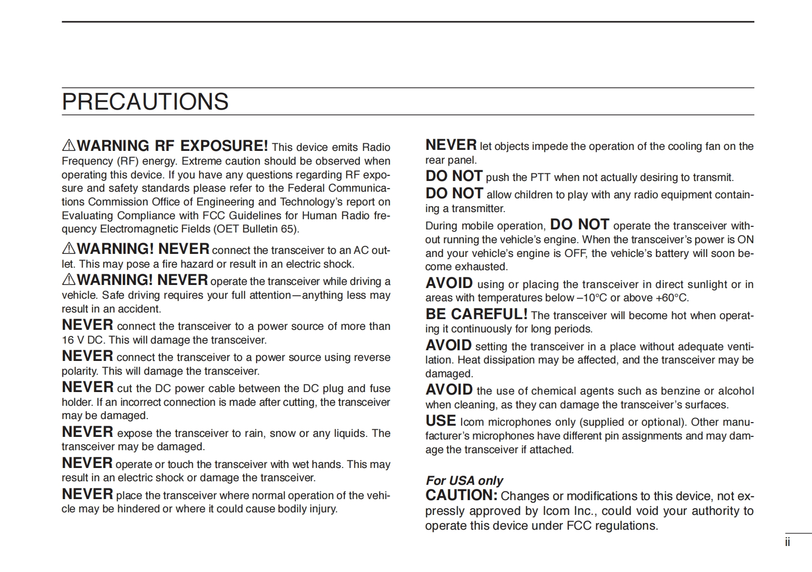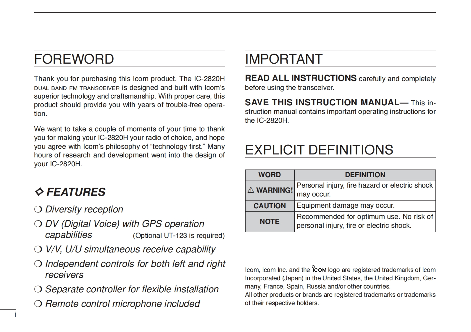 COMINSTRUCTION MANUALDUAL BAND FM TRANSCEIVER1C-2820HCOM6204u0This device complies with Part 15 of the FCC Rules.Operation is sub-ject to the following two conditions:(1)this device may not causeharmful interference,and(2)this device must accept any interferencereceived,including interference that may cause undesired operation.Icom Inc.