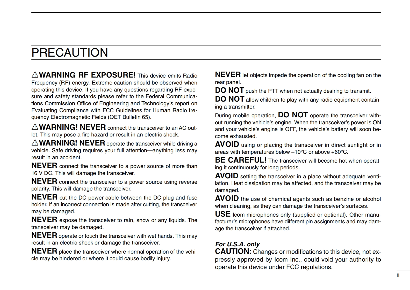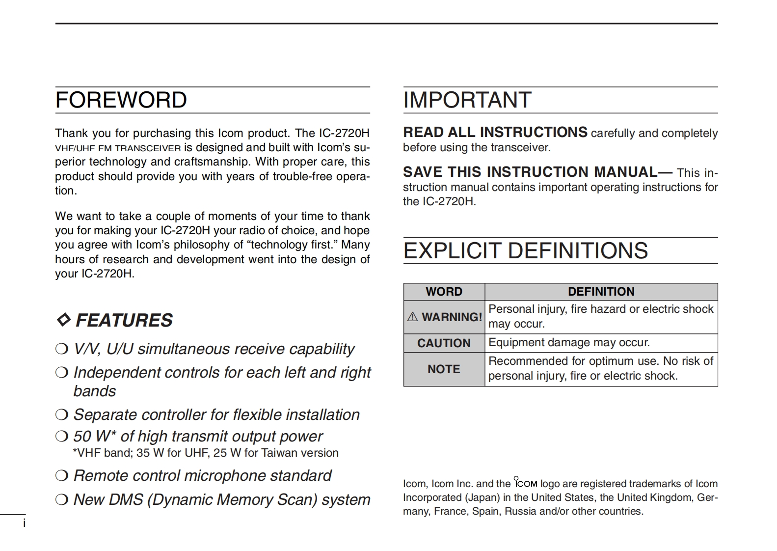 COMq papeolumogINSTRUCTION MANUALDUAL BAND FM TRANSCEIVERIC-2720H68204455dAND FMTRANSCEIVER IC-2720This device complies with Part 15 of the FCC rules.Operation is sub-ject to the following two conditions:(1)This device may not causeharmful interference,and(2)this device must accept any interferencereceived,including interference that may cause undesired operation.Icom Inc.