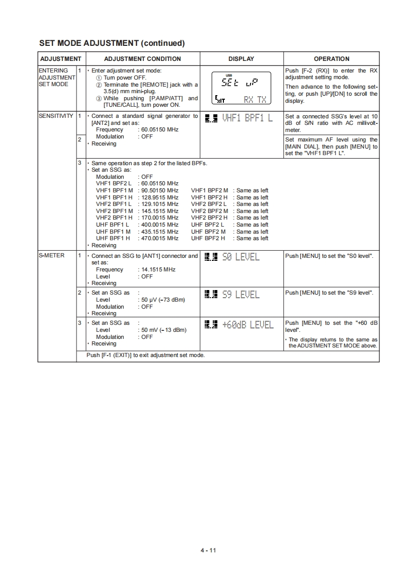 4-5 SET MODE ADJUSTMENTADJUSTMENTADJUSTMENT CONDITIONDISPLAYOPERATIONENTERING1Enter adjustment set mode:Push [F-3 (TX)]to enter the TXADJUSTMENT①Turn power OFFadjustment setting mode.SET MODE②Terminate the[REMOT目jack with aE上uThen advance to the following set-3.5(d)mm mini-plug.ting,or push [UPV[DN]to scroll the3While pushing [P.AMP/ATT]andRX TX[TUNE/CALL],tum power ON.display.d APC1Connect an RF power meter to [ANT1]卫.SET IdAPCSet a total current at 15 A by adjust-connector.ing R1125 on the MAIN board.Connect a DC ammeter between the DCPush [MENU]to set the "SETpower supply and transceiver's DC powersocket (P601 on the PA unit).IdAPC"after returning receiving con-dition.Transmit using an extemal PTT switch.FILTERConnect an RF power meter to [ANT1]GO FILTER CALPush and hold [MENU (GO)]toCALIBRATIONconnector.make the calibration.Transceiver transmits for a while.POWER1Connect an RF power meter to [ANT1]METERconnector.星5ET90%Set to 90 Wusing [MAIN DIAL].thenpush [MENU]while transmitting.(14 MHz)Transmit using an extemal PTT switch.2Transmit using an extemal PTT switch.且.5ET50名Set to 50 Wusing [MAIN DIAL],thenpush [MENU]while transmitting.TUNINGConnect an RF power meter to [ANT1].SET TUNE PoSet to 10 Wusing [MAIN DIAL],thenPOWERconnector.push [MENU]while transmitting.(14 MHz)Transmit using an extemal PTT switch.(50 MHz)Transmit using an extemal PTT switch..SET TUNE PoSet to 10 Wusing [MAIN DIAL].thenpush [MENU]while transmitting.POWERConnect an RF power meter to [ANT2]METER1.日5ET90Set to 45 Wusing [MAIN DIAL],thenconnector.push [MENU]while transmitting.(145 MHz)Transmit using an extemal PTT switch.2Transmit using an extemal PTT switch..日5ET50Set to 25 Wusing [MAIN DIAL],thenpush [MENU]while transmitting.POWER1Connect an RF power meter to [ANT2]E.且5ET90Set to 18 Wusing [MAIN DIAL],thenMETERconnector.push [MENU]while transmitting.(430 MHz)Transmit using an extemal PTT switch.Transmit using an extemal PTT switch.里.且5ET504Set to 10 Wusing [MAIN DIAL],thenpush [MENU]while transmitting.ALC METERConnect an RF power meter to [ANT1]里.生ALC STARTPush and hold [MENU]to set ALCconnector.reference level while transmitting.Connect an audio generator to [MIC]con-nector and set asLevel1.5 kHz/30mVTransmit using an extemal PTT switch.SWR METERConnect a 50 dummy load or powermeter to [ANT1]connector.且.日SR1L0DPush [MENU]to set SWR referencelevel.c2Connect a 50 dummy load or power且.日SR2L0ePush [MENU]to set SWR2 level.meter to [ANT1]connector.The display returns to the same asthe ADUSTMENT SET MODE abovePush [F-1 (EXIT)]to exit adjustment set mode4-10