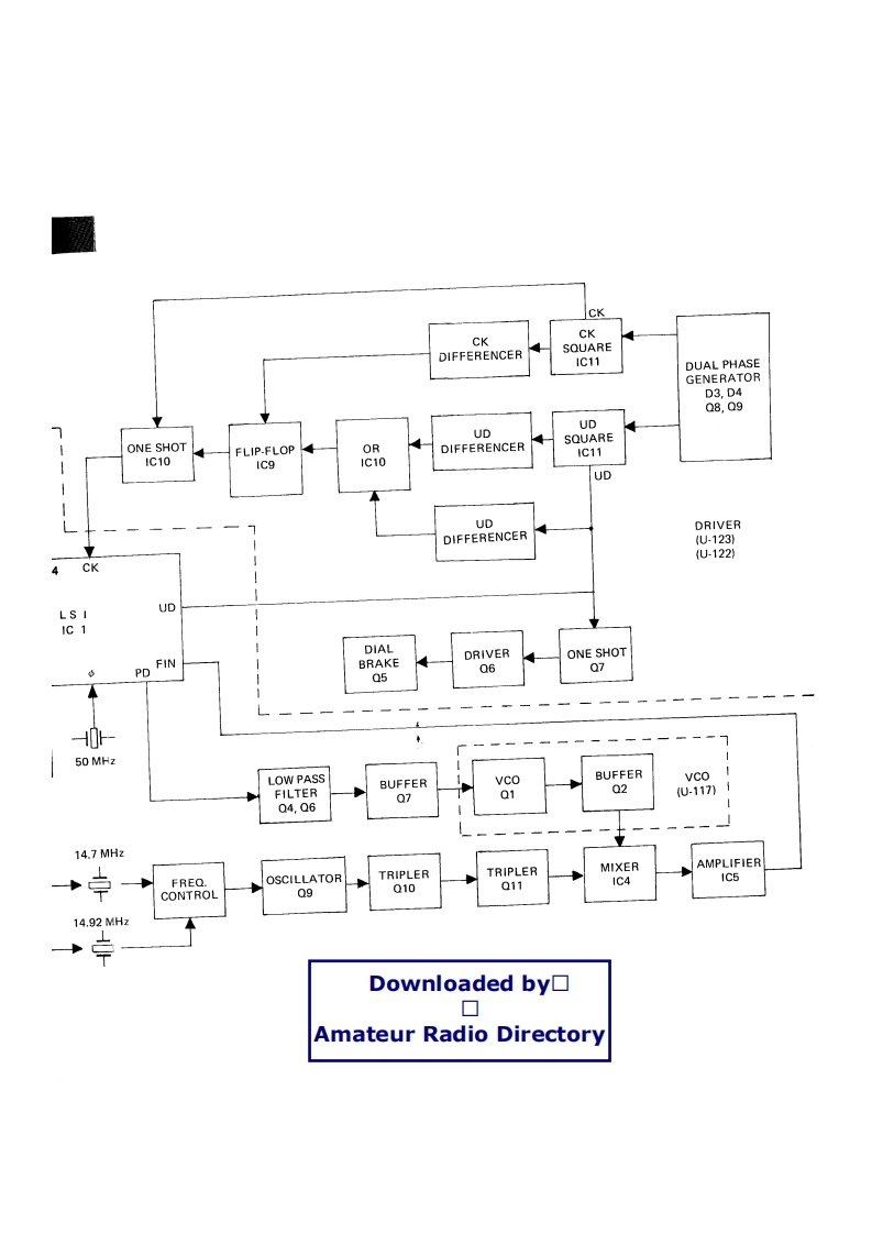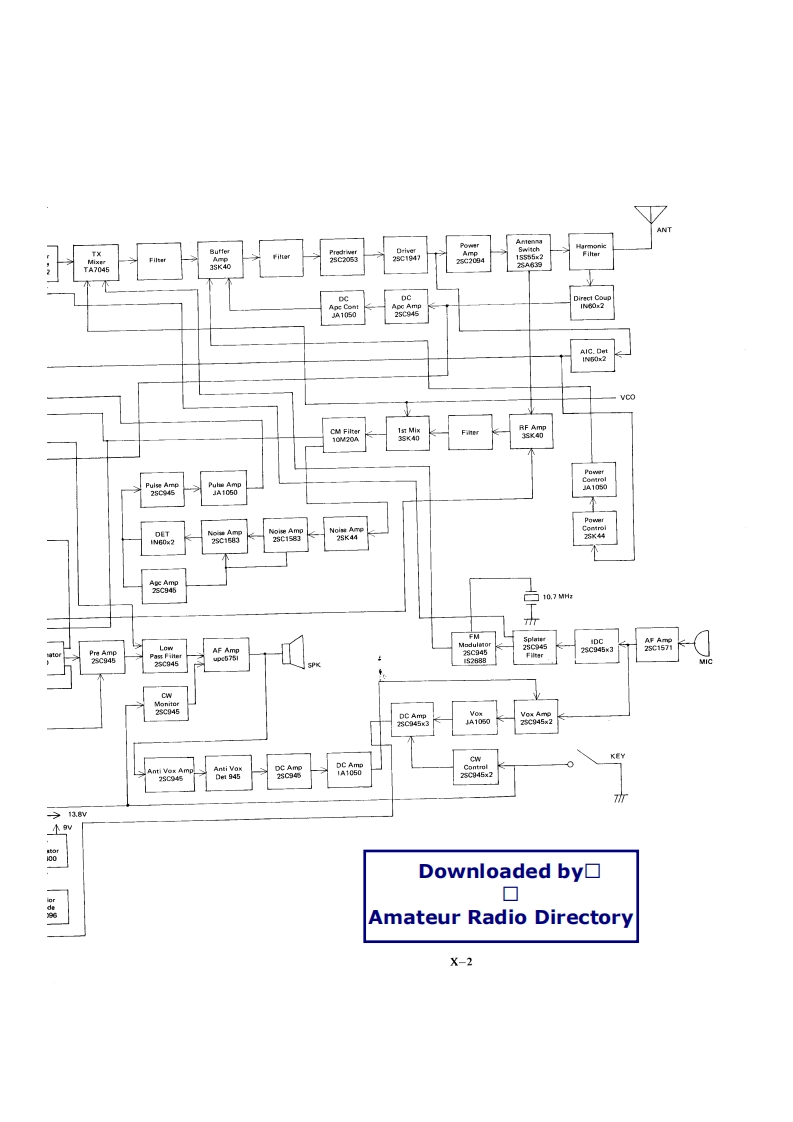 SECTION X BLOCK DIAGRAMDISPLAYDECODER1C12.13.14★DRIVER0C1.2.3,4,5,615,16.17,18,19Q1,2DUPLEXONE SHOTSWITCHFL1C10INV.SWITCHCOUNTERSELECTIC2,IC31T9VSL A0~B4CKA4.B4B4UDSPACEX or YLSITS SWITCHSELECT1C11C2.1C3A1A0~D1PDFINFM9VyD/ACONVERTERDCREGULATORDC50 MHz+13.8VIC6+5VVARICAPDC-DCD7,D8CONVERTERDC14.7 MHzIC7-9VFREQ.DCCONTRO9V14.92MHzSIFTCDELAYSWITCHQ1F9V08PLL-116)Downloaded byl□口Amateur Radio DirectoryX-1
