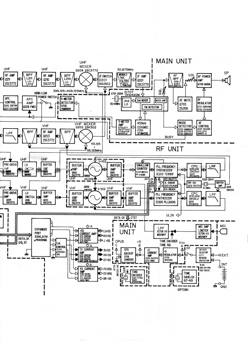 BLOCK DIAGRAMUHFMIXERANTVHF 144~146MHzUHFUHFQ2092sc377UHF:430✉440MHzLPFRF AMPBPFRF AMP0210210L2102SC37722SC37725■33B399.25409.125MHzdANTLPFHPFSWITCHPOWER AMPHIGH /LOWUHED22,D216APCPOWER SWITCH1APCS-METERIC206 SC-1081M4862x2CONTROLAMPDETECTOR0226258796一Tx02272sC40814—RXDETECIORD2175S54子-COMMONVHF MIXERANTVHFHI BUSY2202233020UHFLOLPFBPFRF AMPBPF0203●VHF2SC3772ANTLPFPOWER AMP115.125SWITCH02915S53VHFD205MA962IC207sC-1080UHFUHFUHFEFPRE-DRIVELOBUFFERBUFFERUNITROTARYAMPSWITCHAMPAMPENCODER02402s922237722SC3772UHF2C3356LOGIC UNITVHFVHFVHFVHF0552HI LOPRE-DRIVEBUFFERBUSYBUFFERLOW BATTERY S/RF METERAMPSWITCHAMPAMPSENSORCOMPARATORUL INLCDIC904 V2IC9041/2DETm022305532377229c3772INTEGDISPLAYLA6393MLA6393MRATOROPTIOND5904D-U9246JPOWER DOWNCONTROLLAMPLAMP DRIVE立ACPUEXPANDERAUO09052SC4081IC902PORTA09062987964PD75308GFDATA.CKC202,Ic701uP040948GTX INDICATOR100-3B9PLL STA1/0,STDT/RLED DRIVE立AAMPTX0元25c408MPAX902G227PTT4.25立AMONI123AScanned by IW1AU▣RX CURRENFUNCINITIAL456BLAMPMATRIX789gDownloaded byl▣⊙神DRadioAmateur.EUKEYBOARDMAIN UNIT