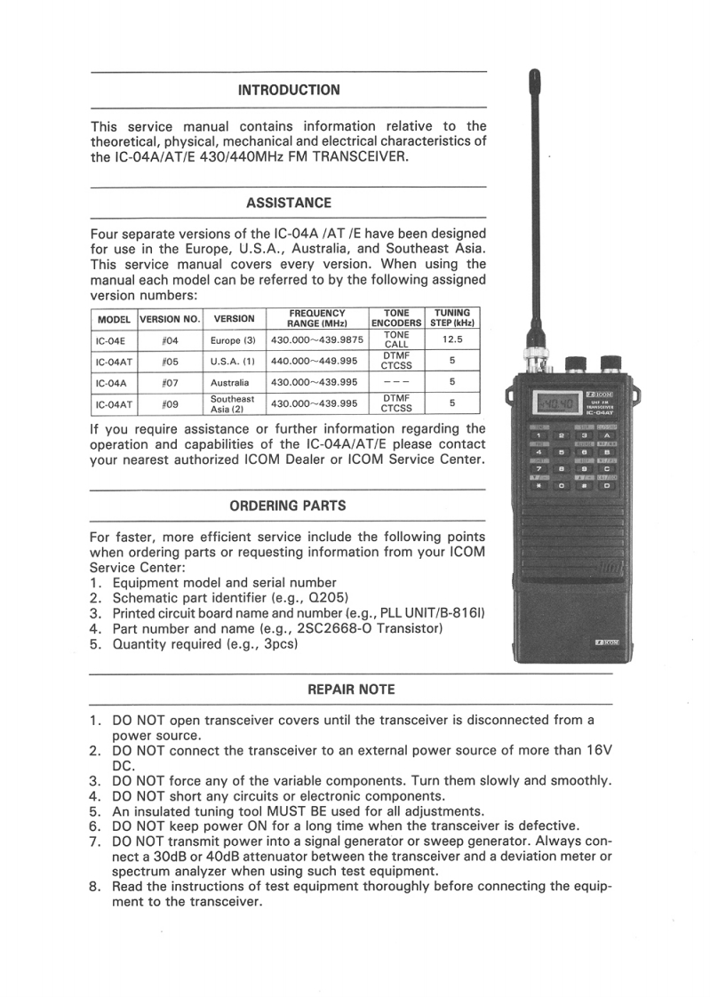 430/440MHz FM TRANSCEIVERG-▣4A/AT/三SERVICE MANUALDownloaded byRadioAmateur.EUDICOMICOM INCORPORATED6-9-16,Kamihigashi,Hirano-ku,Osaka 547,JapanPhone:067935301Fax:067930013Telax 0527722 ICOMTRICOM AMERICA Inc.ICOM CANADAICOM (UK)Ltd.(Corporate Headquarters)A Division of ICOM America Ina.UInit9.Saa Straet.H-m地日w2380 116th Avenue N.E..3071 #5 Roed.Unit 9.Richmond.B.C..Kent CT6 BLD.United KingdomBellevue WA 98004.U.S.AV6X 2T4,CanadaPhone:0227363859Phone:2064548155hnm:6042737400Fwx:022730155Fax:2064541509-F:8042731900Tolex 965179 ICOM GTolax:152210 ICOM AMER BVUEICOM FRANCE S.a(Customor Servica>120 Routn da Rovel.P%eme:20645478194000 Dusseldorf 1.31029 Toulouse Cedex.FranceFod.Rap.GormanyPm0n8:61.20.31.49Fan÷0211348047Fax:61.34.05.91:0211333639Telex 521515 ICOM FRATX750B3,U.8.A.Talex 9598082 ICOM DPh0n0:2145507525Fax:2145947079ICOM (AUSTRALIA)Pty.LtdDuke Street.Windsor.Victoria.1777 Phoonix Parkway,Suite 201.3181 AustraliaPh0n0:035122B4,035297582·035298485:4049916327AA 35521 ICOM AS