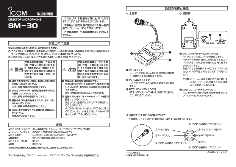 PART NAMES AND FUNCTIONSTCOMINSTRUCTIONSThank you lor purchasing the SM-30◇TOP VIEW◇BOTTOM VIEWDESKTOP MICROPHONEDESKTo MoNOPHONE.This is a unidrec-Sonal,electret microphone designedSM-30lor base station operation with an lcom折ansceiver.Please sead these instruc tons thorough-y belore using the microphone.PRECAUTIONSCAUTION:NEVER expose the microphonePlace the microphone in a secure pace toto rain,snow or any Equids.avoid inadvertent use by chidren.O MIC GAIN VOLUME [MIC GAIN]Rotate to adust the mcophone out-CAUTION:NEVER let metal,wire,elc.This microphone is for the specified loomput leveLouch any intemal part of the microphone.transceivers only!-The micophone can-.Use this control as an adjunct o thenot be used wit a non-lcom transceivermicrophone gain setting of the con-CAUTION:NEVER touch or operate thesince the power is suppied from the con-O PTT SWITCHnecled transceiver.desktop microphone with wet hands.nected transceiver.Push to transmit,then release to re-Rotating the contrd too tar clockwiseDO NOT place the microphone in exces-ceive.may result in an output level that isAbout CEsively dusty ervironments or in direct sun-The SM-30 complies with thePTT LOCK SWITCHtoo high and transmit signal distor-ight.essential requiements of thePush to continuously transmit.The2004/108/EC directve lortransmissioncontinues until pushing this⑤LOW CUT SWITCH [LOW CUT]DO NOT use harsh solvents such as benswich again.Cuts out the low fequency componentszine or aloohd to dean the microphone.Electromagne tc Compatbiity.③PTT LOCK INDICATOR [LOCK灯of input voice signals.as they can damage the microphone's sur-Lights red when the PTT lock switchfaces.(is ON.SPECIFICATIONSPLUG PIN ASSIGNMENTSThe pins are described from the directon of the arrow in the lustraton.Microphone typeUnidirectonal electret condenser micophone (preamp built-in)*Output imped电nce:6000±30%(at MIC GAI':)④No conne cion.Sensitivity-28 dB +4 dB (0 dB=1 WPa,at 1 KHz)Power requiements 8 V DC (suppled fom the tmansceiver)①Micnophone output⑦GND (Mcrophone ground)Cable length (approx.):1 m:3 ft 3%6 in.Weight (approx.):350年1230228V DCinput5GND (PTT ground)③PTTAll stated specifications are subject to change without notioe or obligation.④No connoctionlcom,lom Inc.and the loom logo are nogistered tademarks of lom Incorpora tod (Japan)in Japan,he United States,the Unted Kingdom,Germany.France,Span,Russia andor other counties.lcom Inc.Count on us!1-1-32 Kamiminami Hirano-ku.Oaaka 547-0003.Japan422X-G-①Prrtadin年an。20 con ie.