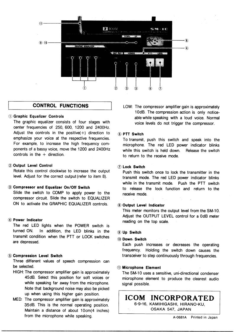 ICOMINSTRUCTIONSCOMPRESSOR/GRAPHIC EQUALIZERDESK TOP MICROPHONESM-10INTRODUCTIONSPECIFICATIONSThank you for purchasing an optional SM-10 desk top1.GENERALmicrophone for your ICOM transceiver.It was designed.Current drain (13.8V DC):for base station use,and consists of an electretEQUALIZER ON Approx.15mAcondenser microphone element with a compressorEQUALIZER OFF Approx.8mAamplifier,plus tunable equalizer for maximum control●Dimensions:of the audio characteristics of your transmitted signal.230mm(WM×110mmD)×30mm(H)The SM-10 is highly sensitive and produces clear,crisp·Weight:audio.1.9kgTo fully enjoy the benefits of your high-performance2.MICROPHONE CIRCUITtransceiver with the SM-10,please read these instructions●Microphone:thoroughly prior to operation.Broadband electret condenserNumber of semiconductors:DESCRIPTIONTransistors 13GRAPHIC EQUALIZER AMPLIFIER INCLUDEDDiodes5Since four individual equalizer amplifiers are installed◆Type of microphone:in the SM-10,transmit audio can be adjusted forUni-directionaldifferent applications.The higher frequencies may●Output impedance:be accentuated when contacting remote DX stations100nto give your signal greater punch,or the lower.Output level:frequencies may be emphasized to produce softer,0-30mVmore pleasant audio when engaged in casual●Compression level:conversations with local stations.HIGH 45dBMED 35dBLOW 10dBHIGH-QUALITY COMPRESSOR AMPLIFIER INCLUDEDTransmit output power is constant while using the3.EQUALIZER CIRCUITcompressor even if the voice level fluctuates over aNumber of semiconductors:wide range.In addition,the compression level mayICs 3be set to one of three different values for maximum.Signal-to-noise ratio:operating flexibility.80dB●Distortion:USES UNI-DIRECTIONAL MICROPHONE ELEMENT0.05%Through use of a uni-directional microphone,a high●Equalizer:audio-to-noise ratio is obtained which effectively4 stages(±12dB)suppresses background noise.■LEVEL METER ANDOUTPUT LEVEL CONTROL INCLUDEDThe output level can be monitored with the VU meterNOTE:The SM-10 may be used with the following ICOMon the SM-10 top panel,and the output adjustedtransceivers:continuously with the OUTPUT LEVEL control.1C-761,1C-751/A.1C-745,1C-735,1C-575A,1C-275A/E/H,IC-271A/E/H,IC-28A/E/H,IC-27A/E/H,1C-375A,1C-38A,IC-37A,UP/DOWN FUNCTION SWITCHESIC-475A/E.IC-471A/E.IC-48A/E.IC-47A/EFrequency shifts are easy with the convenientIC-45A/E,1C-1271A/E,IC-1200A/E,IC-120,UP/DOWN switches.1C-3200A/E,IC-900A/E