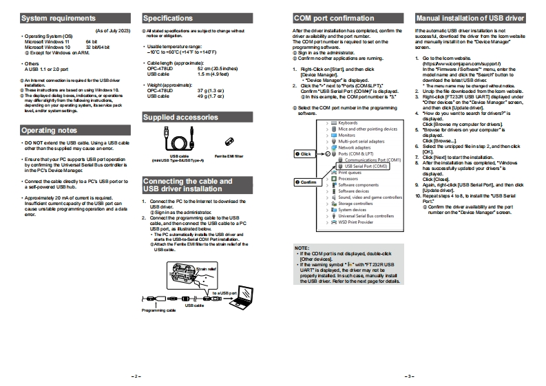 ICOMINSTRUCTIONSPROGRAMMING CABLEThnk you tr choming this loam praduct.OPC-478UDRADALL NSTRUCTIONScanfuly and campkbdyb国are uing hi productImportantPrecautionsSAVE THESE INSTRUCTO NS -Theseinstucions+A WARNING!NEVER use or touch the cable withcotan importan威safety and年erating deta6tr中ewet hand.Thi coudcase anelecric shod.C士e·CAUTION:USE ONLY IN DOORS!NEVER e年aseThe programming cadleis designed to conectecbles色ahow,or any iqudsan con tramsoeiver or reoeiver and aPCtor dataNEVER ltmeta,wire,or other objects touch anyprogramming using an icom programming soware.irtemal part of the connectors.NEVER plaoe any heavy otject an the cable.apinchitExplicit definitionsDO NOT use harshsolverts such as berzine oralohol when deaning脑ey wil damag年hWORDDERINITIONWARNNG到Persond njury.fre hzzard ordectric shock may oocur.CAUTIONEqupmentdamage may ocor.DisposalI disregarded inoonvenienoe onlyNOTENo risk of personal injury.fre orThe cros sed-ou wheekd-tinsymbddectric shock.on your product lter anure,or packagingreminds youthatin the Burcpean Urion dlekciod and electronic prodacts.bateies.and acoumulators (rochargeable bateries)lcam i natndpasitla for the dastuclat dimaga ta armust be taken to designated coleclonAmerican Communication Systemscatans at the end ofthdir wakinglie Dond disposeFundtian b bicau轴tdhe级producs as umsored muni年alweDiscover the Power of Communications,Faoa4au8.nddg.butnatime过aek口军se ofthen a0 arding to the laws n your areadoda线dhtubino道线h,aa4dwhttp://www.ameradio.comcontminalanAbout CEVersiors d the OPC-47UDwhichhavethe"CE"symbol on the product compywih the essential requiremets ofthe2014/30 EUdirecive for ElctromagneleCe年attyBelew atemattia for UKCA puroe otlyC西82,UKgdan.Camar以.Ftno线Soi,usoi Australa,ww由nd andbrater counticantd lcam UK山mitd byamd atnbcamc的kaMcraat and Windews ane radimarkalthe Mcrasoft graup dl camparis通amtively cl+44022774174L-4-Icom Inc1-1-32,Hrang-u 547-0003.JpanA灯wL0送。2e-1-