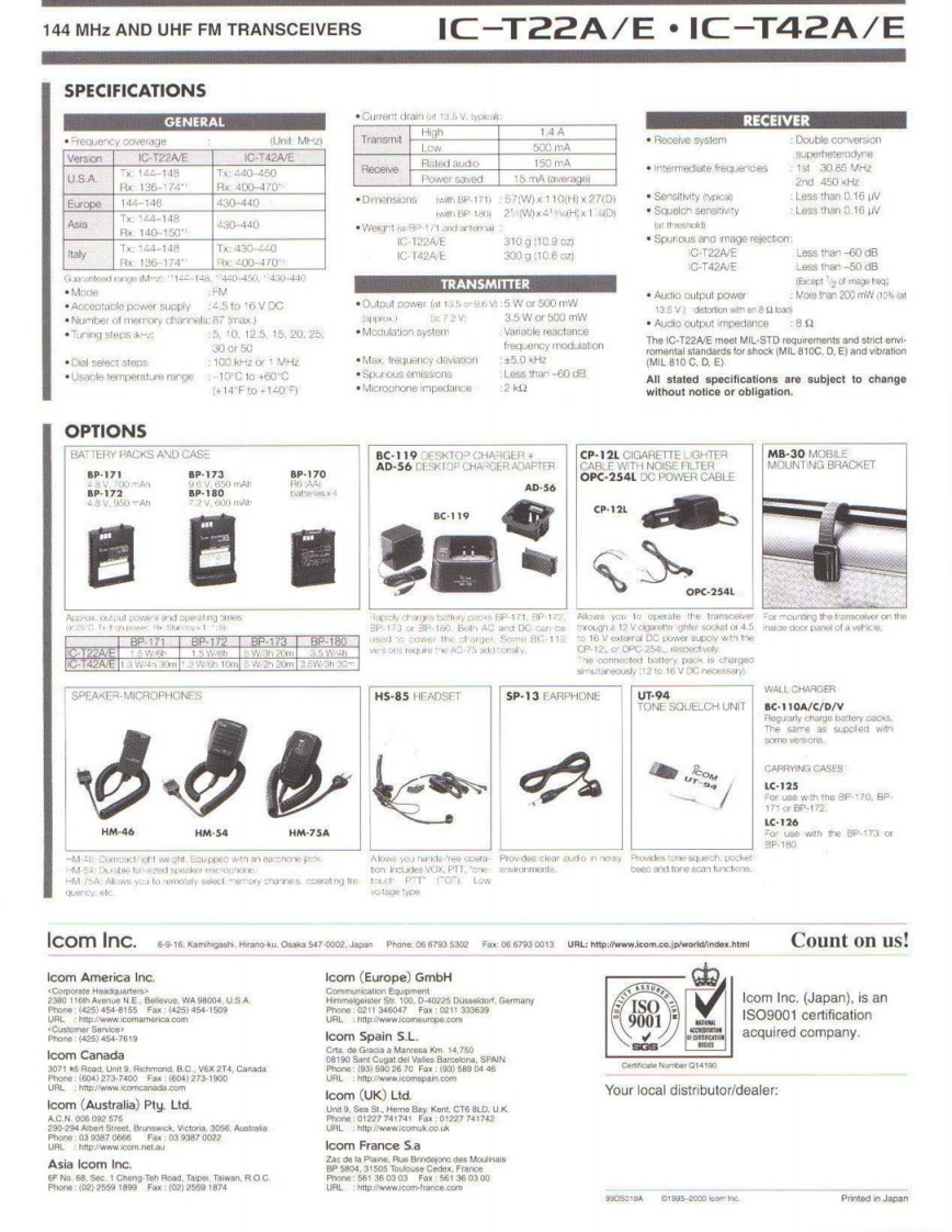 144 MHz FM TRANSCEIVERUHF FM TRANSCEIVERIC-T22AIC-T42A(144 MHz U.S.A.version)(440 MHz U.S.A.version)IC-T22EIC-T42E(144 MHz Europe version)(430 MHz Europe version)The IC-T22A/E and IC-T42A/E are mono band handheldsMeetspacked with features you would expect to find in a hand-held twice the size.From alphanumeric display to the newMIL-STD810microphone simple remote control function these handheldsutilize the latest in Icom technology.And they look great!High performance that easily fits in your handWith slim dimensions of 57(W)x 110(H)x 27(D)mm,includingBP-171,these handhelds fit comfortably in the palm of yourhand-carry them around in your shirt pocket or a small bag.However,there is nothing small about their performance.'U.S.A.version with BP-180:2/4(W)x 41%(H)x 1(D)in.Alphanumeric memory channelsAvailable memory channels are expandable from 40 to 80(notincluding scan edges and call channel)and channels can betagged with a 6-character alphanumeric name such as a call sign.repeater name,etc.for operating convenience.Nothing is morefrustrating than losing all your channel information when your bat-tery goes dead.EE-PROM memory backup ensures that thiswon't happen.Now you have memory to memory transfer for con-venient memory management.'Memory names cannot be used when memories are expanded to 80.Alphanumeric message pager5 transmit and 5 receive message memories are available inde-pendently from regular memory channels allowing you to use thetransceiver as a simple message pager (up to six characters permessage).This paging function is compatible with the paging functions for other Icom handhelds and mobiles.Microphone simple remote control function-22This new function allows you to change the default functions ofthe optional HM-75A's switches:squelch monitor.call channel,memory channel 1 and memory channel 2.Doing so makes oper-ation via the HM-75A simple for driving.hiking-especially conve-nient for group operation.And more...·MOS-FET power moduleAccepts 4.5 to 16 V external DC power supplyCOM.log memory and repeater memory for auto storage of the last-transmitted frequencies.50 frequency CTCSS tone encoder (optional for Europe and Italyversions).5 DTMF(30 digits each)memories for auto dialingNumerous scans available.LCD backlighting for easy night operationAn antenna,battery pack'and battery charger'are included withthe transceiver.IC-T22A'Some versions include a battery case instead of theseIC-T42EIcom Inc