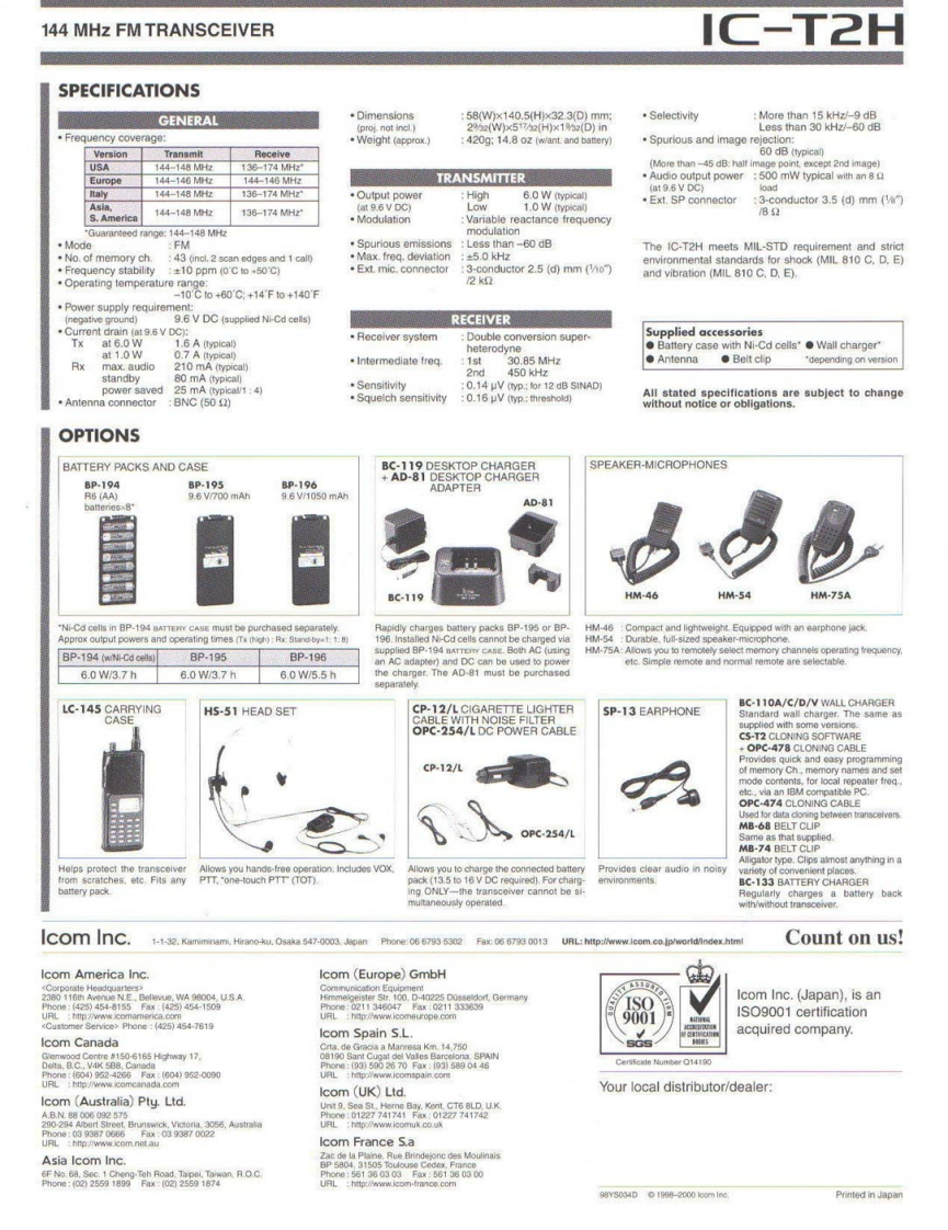 144 MHz FM TRANSCEIVERIC-T2HMore than enough power...MeetsMIL-STD8106 W of transmit power and 500 mW of audio outputThe IC-T2H provides a powerful 6 W*of RF output power with thesupplied Ni-Cd battery pack.More than enough for long distancecommunications.And on the receiving side a generous 500 mWof audio is emitted for clear reception even in noisy operating envi-ronments."Typical at 9.6 V DC.Commercial grade durabilityBuilt tough.The IC-T2H is designed and constructed to deliver re-liable performance under demanding conditions.Tone squelch standardThe built-in tone squelch system provides quiet standby (thesquelch only opens for calls directed to you)as well as pocketbeep and tone scan functions.Pocket beep provides a method ofkeeping track of calls directed to you(like a 'common'pager)andtone scan allows you to detect subaudible tone frequencies thatare needed to open a repeater,etc.Easy operation with customizable keysDefault key functions have been assigned with ease of operation inmind.However,eight keys on the keypad are customizable allow-ing you to assign functions to them other than the defaults.Thiscan be performed via cloning or directly from the keypad.DTMF encoder with memory channelsA DTMF encoder with 5 DTMF memory channels is built-in-DTMF codes of up to 32 characters can be stored.And an automaticre-dial function provides simple operation for autopatching.etc.Cloning capabilitiesCloning between handhelds or between handheld and PC providequick and easy transfer of settings.An OPC-474 CLONING CABLE isCOMrequired for transceiver-to-transceiver cloning and an OPC-478是$通CLONING CABLE plus the CS-T2 CLONING SOFTWARE is required forPC-to-transceiver cloning.Other outstanding functionsGuide function for quick reference to key functionsLCD backlight with timer.40 memory channels available2-step power saver function increase battery lifeAutomatic repeater function(USA version only)Microphone simple remote control function(optional HM-75A required)。Monitor function◆Lock function10 weather channels (USA version only)ANI (Automatic Number Identification)function"'Available for some versions only.Icom Inc.