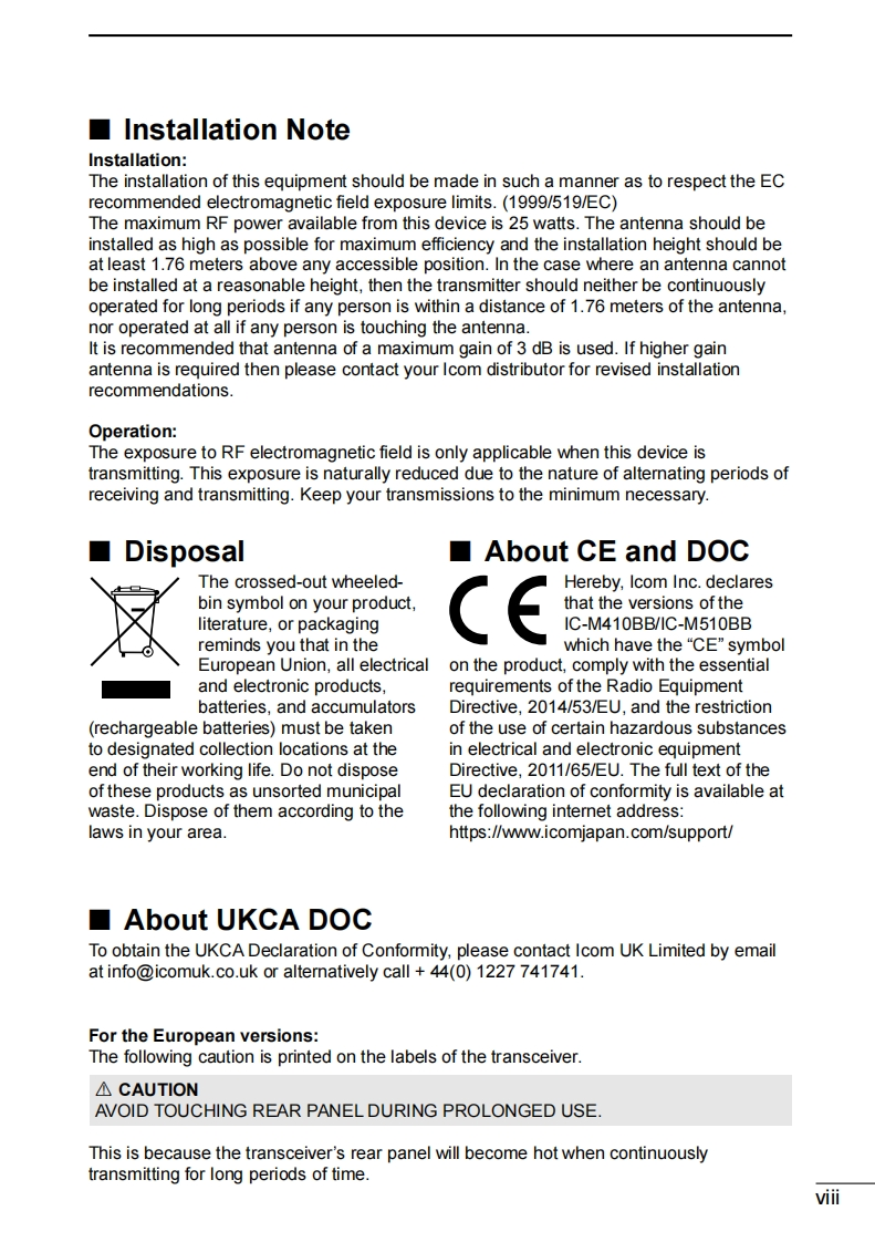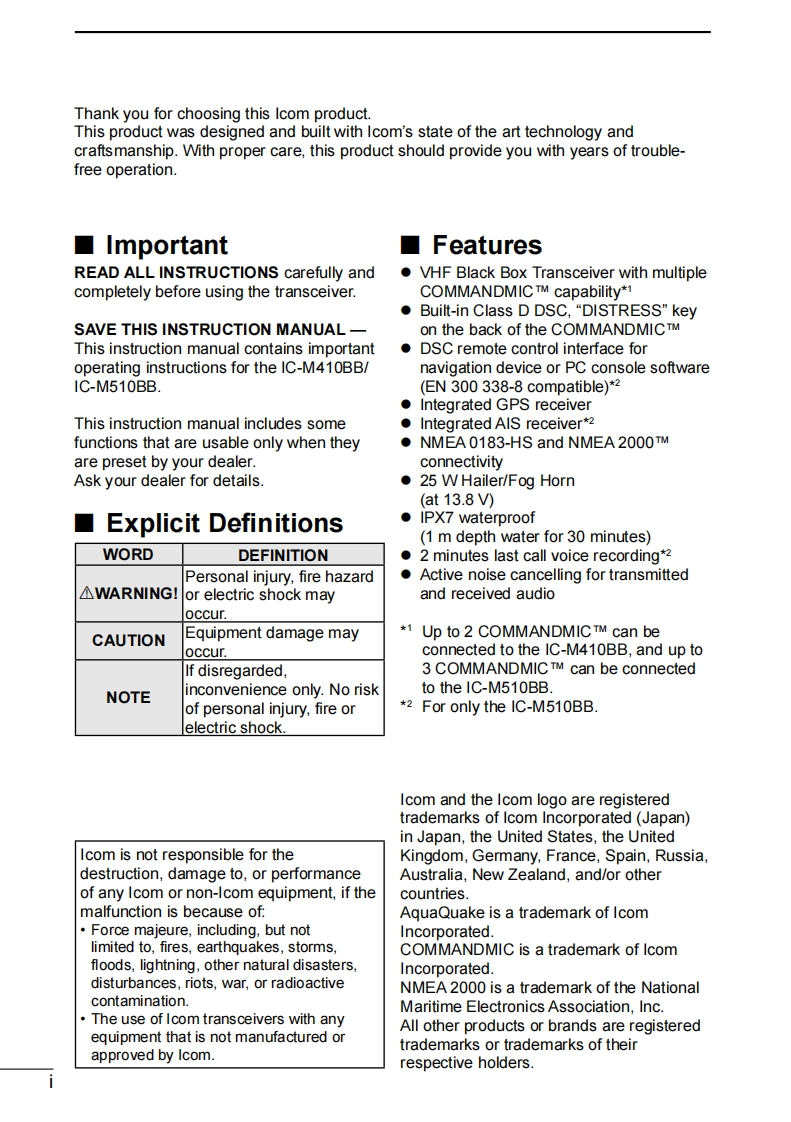 COMINSTRUCTION MANUALVHF MARINE TRANSCEIVERSIC-M410BB四IC-M510BB16416The photo shows the IC-M510BB.One COMMANDMIC TM comes with the transceiver.This device complies with Part 15 of the FCCRules.Operation is subject to the condition thatthis device does not cause harmful interference.Icom Inc.